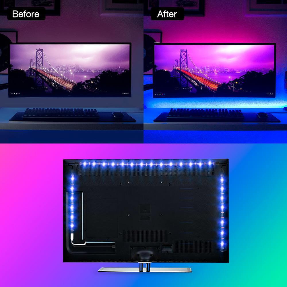 Adding LED bias lights on TV back can reduce eyestrain caused by brightness contrast in dark, RGB TV backlight can be also used as mood lights to create a comfortable and romantic atmosphere to fit your mood
