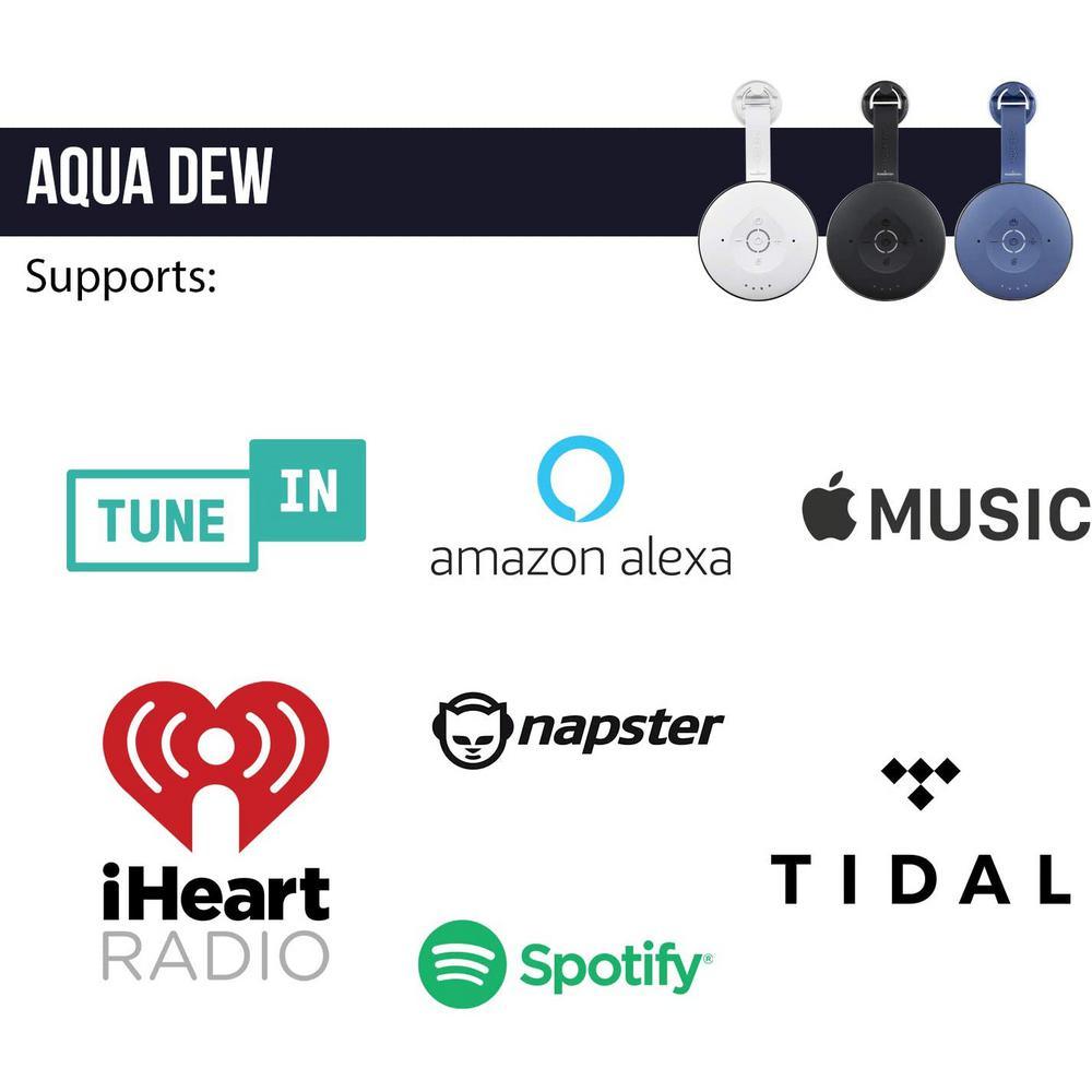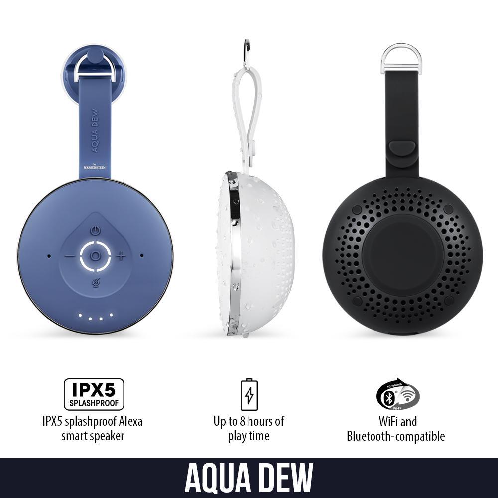IPX5 splashproof smart speaker - aqua dew is a powerful IPX5 splashproof speaker, for up to 8-hours of playtime, it can be used in the shower or anywhere in your home while connected to the Wi-Fi or on the go as a normal Bluetooth speaker