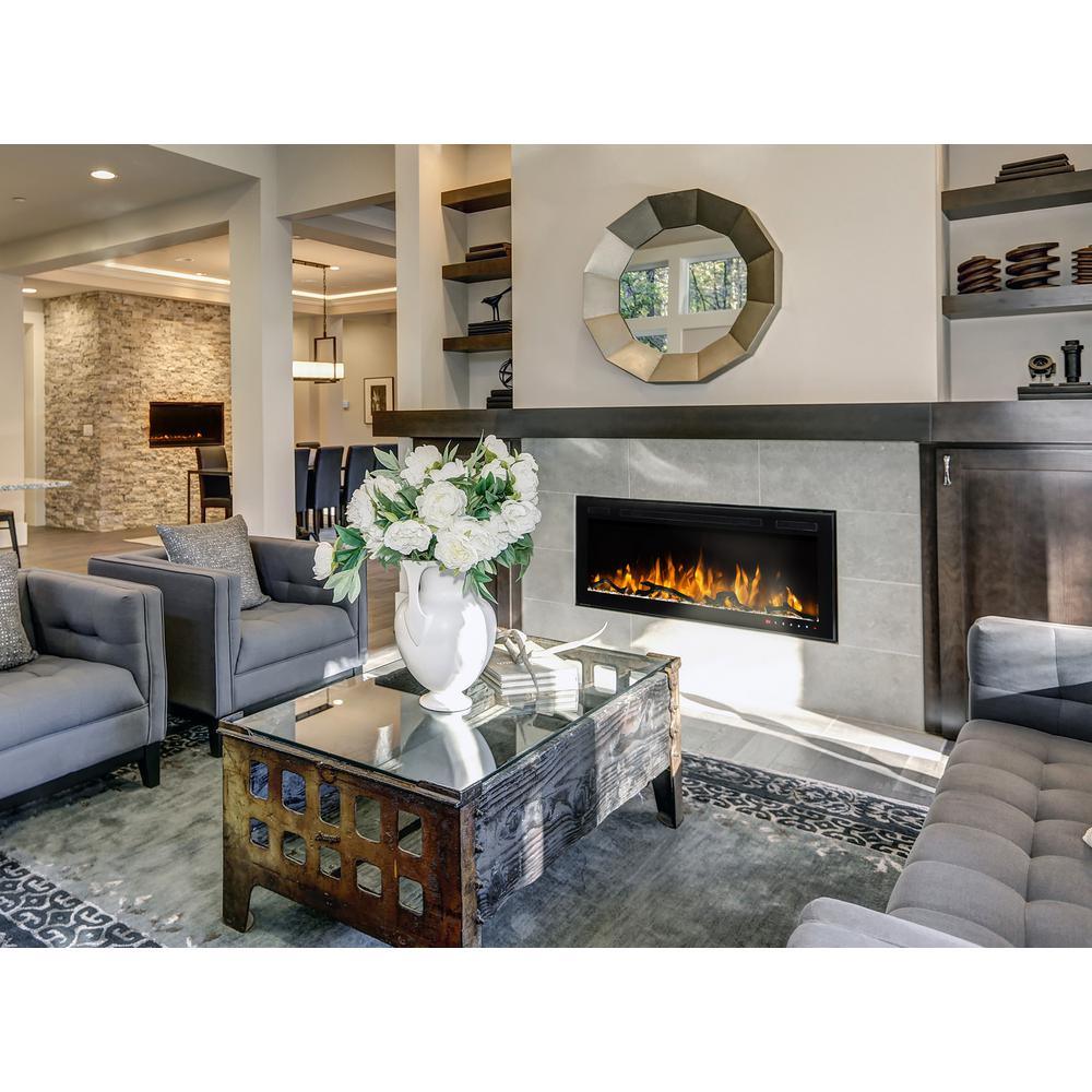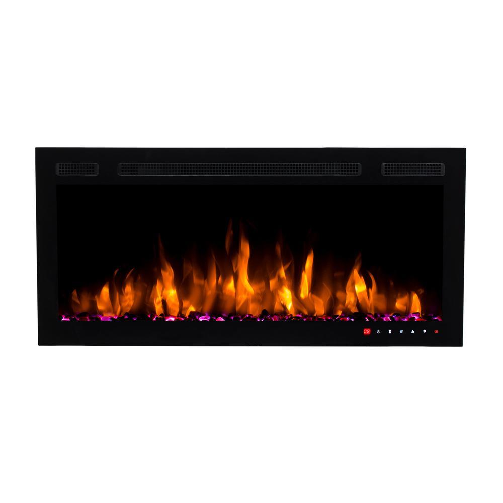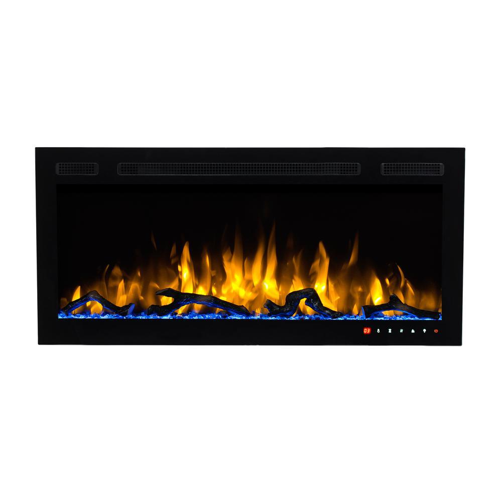 The BLUEGRASS LIVING Slimline 36 in. Wall Mount and Recessed Electric Fireplace brings a stunning flame effect complete with a contemporary nearly frameless viewing area, adding a modern look and feel to just about any space. This electric wall fireplace is fit for both fully recessed (direct-wired) or wall mounted (wall bracket included, plug in) installation and does not require any venting, making it a perfect choice for any commercial or residential space. Hand crafted Grapevine Driftwood Logs, River Rocks, and Acrylic Crystal media are all included as standard media, allowing you to mix and match the desired look for your fireplace. The Slimline series features high intensity flame and ember bed lighting paired with 10 selectable ember colors and 3 selectable flame. This fireplace also serves as an electric heater, heating rooms up to 400 sq. ft. and includes a heating timer function allowing for maximum power efficiency. The industry leading product depth (5.75 in.) allows for an easily installable flush mount electric fireplace insert. Enjoy the warmth and beauty of a modern fireplace by BLUEGRASS LIVING.