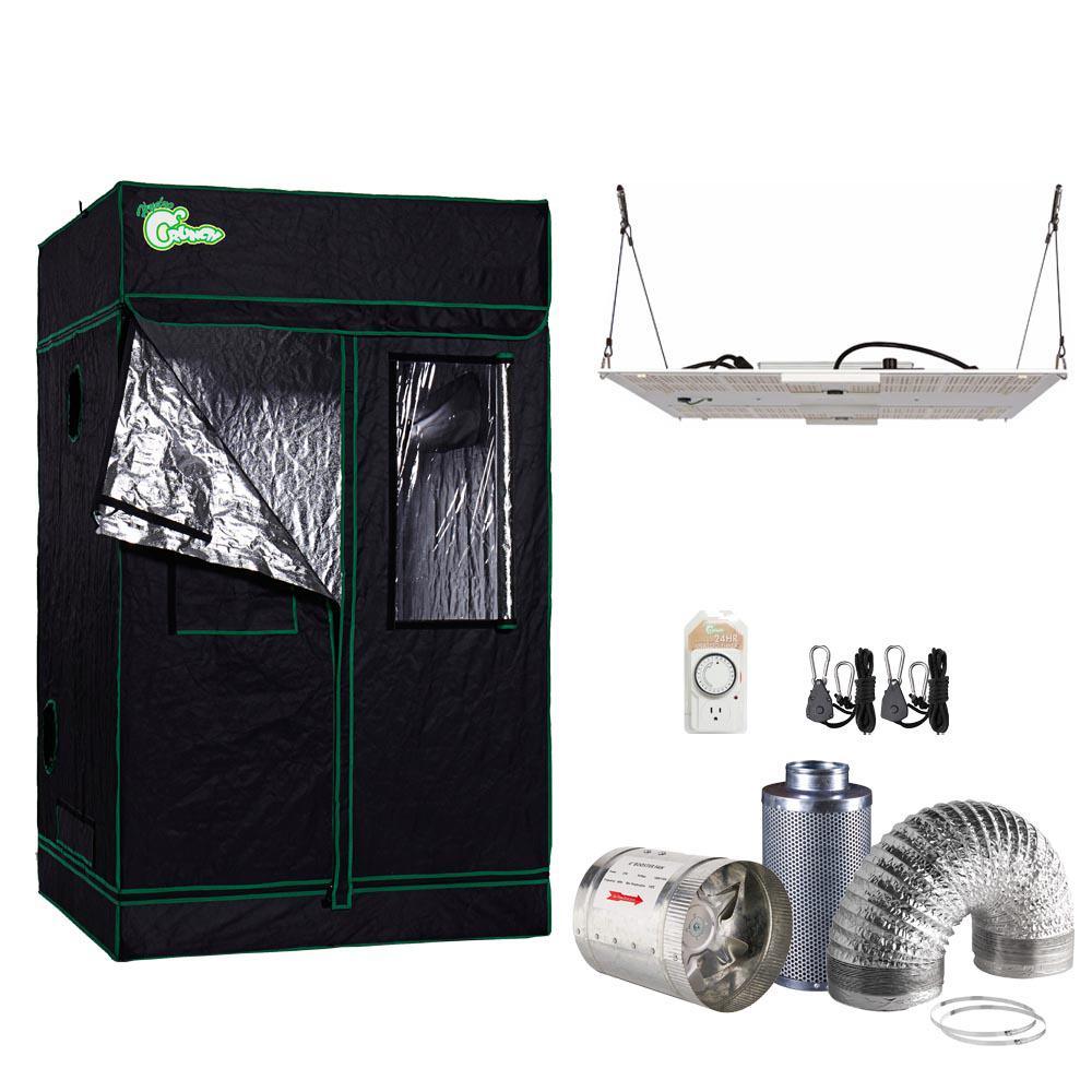 - Comes complete with HLG 1000-Watt DE equivalent full spectrum LED fixture, 4 in. Hydro Crunch inline duct booster fan 100 CFM, Hydro Crunch 4 in. x 12 in. virgin carbon filter and 4 in. x 25 ft. non-insulated air duct, 25 ft. L, grow tent 60 in. x 60 in. x 80 in. (5 ft. x 5 ft. x 6.5 ft.), timer and adjustable light ratchet hanger