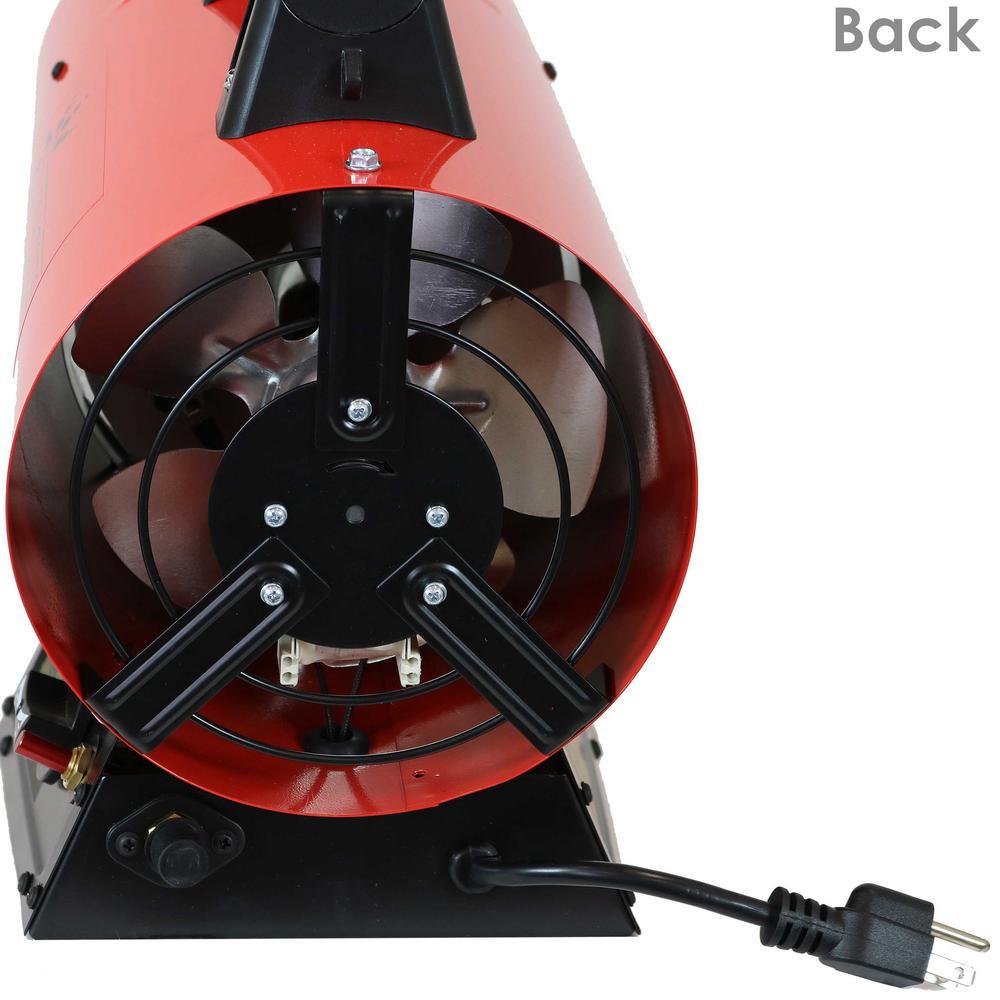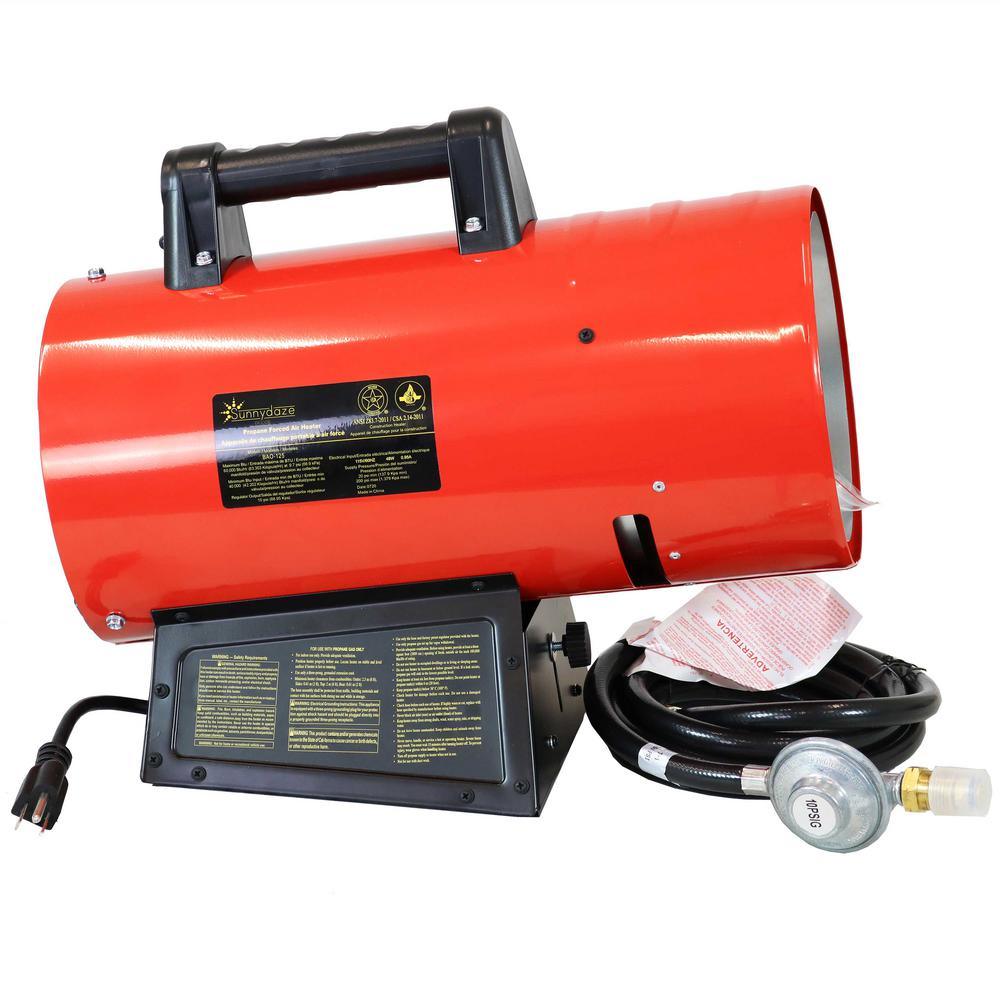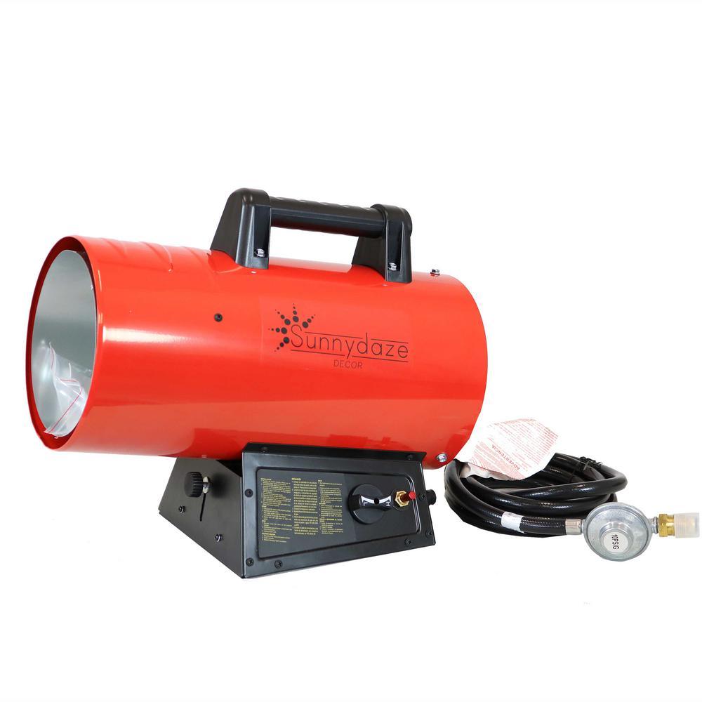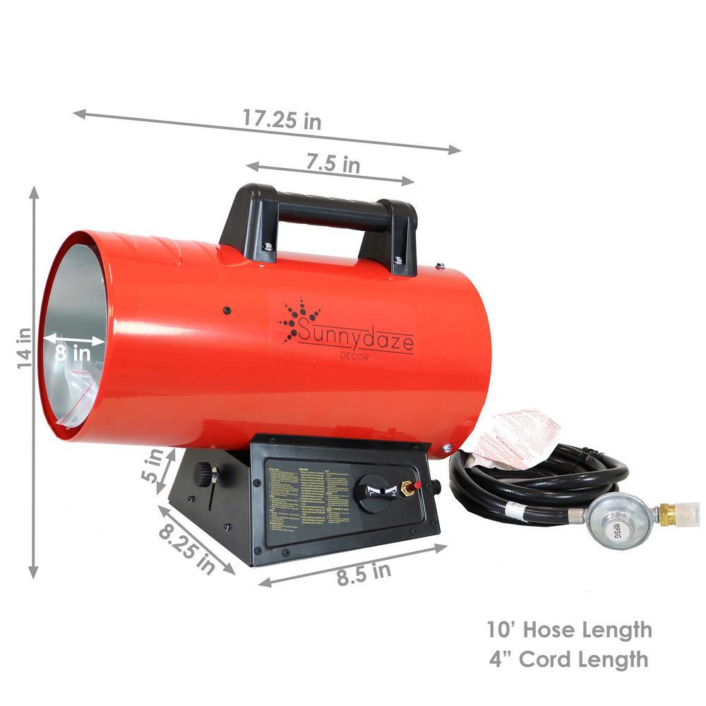 Stay warm while you work hard in cooler conditions with the 60,000 BTU Forced Air Propane Heater from Sunnydaze Decor. This heater runs on clean-burning propane and is designed to be optimally used with a 100 lbs. propane tank (please note, propane tank and fuel is not included with this product and must be purchased separately). This product comes with 1 heater, 1 regulator and one 10 ft. hose. The fan inside the heater blows out hot air to keep your workspace toasty warm so you can stay productive.