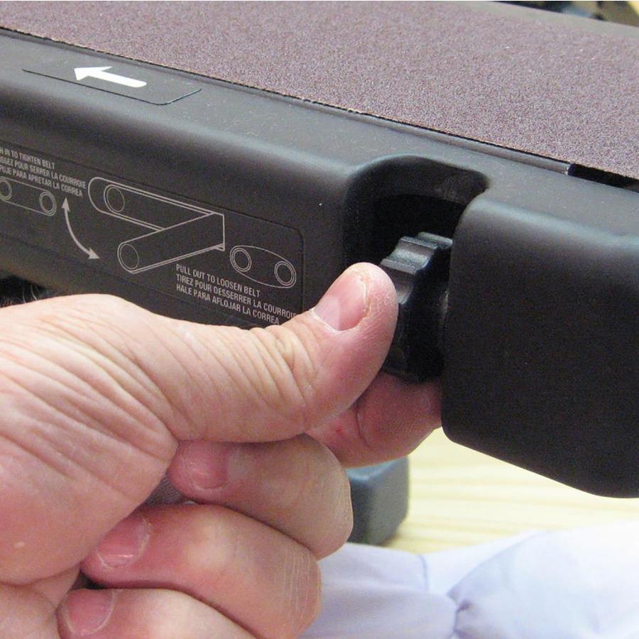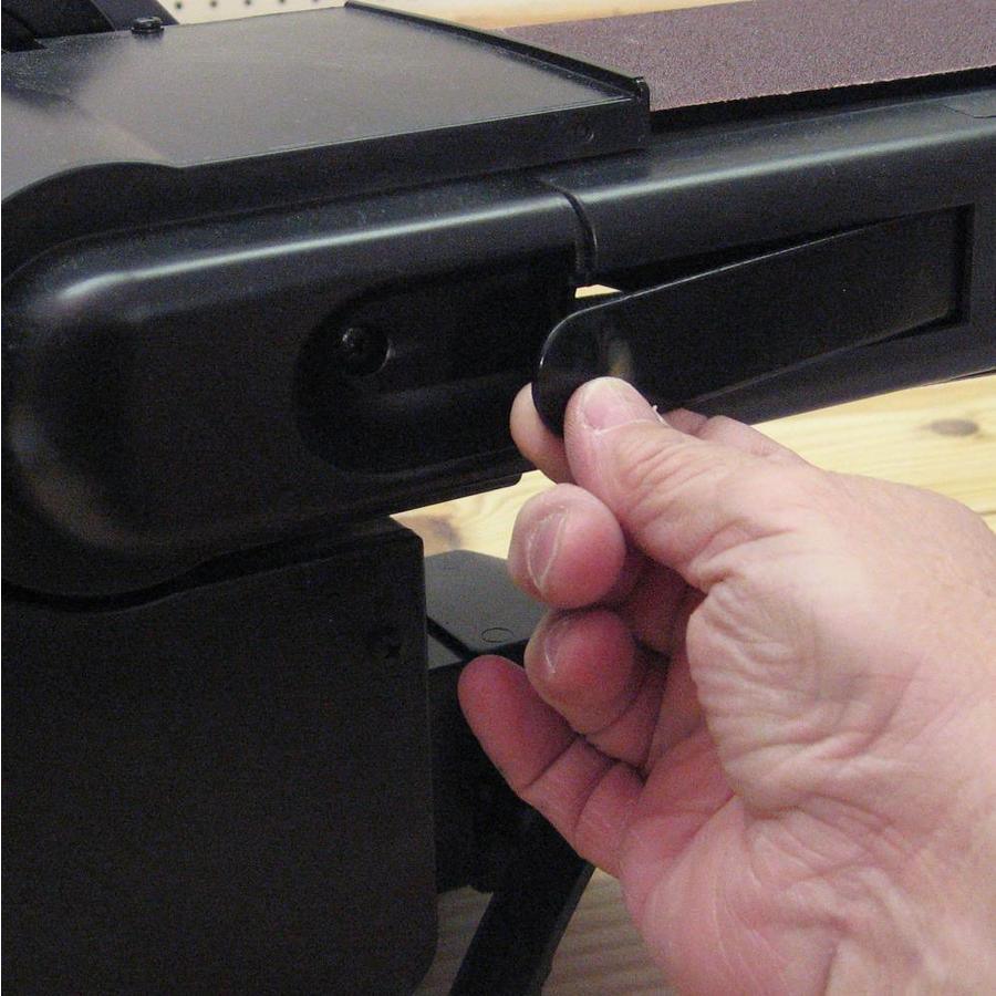 Sanding belt tilts up to 90 ° vertical, and the unsupported underside allows for sanding of curved work pieces