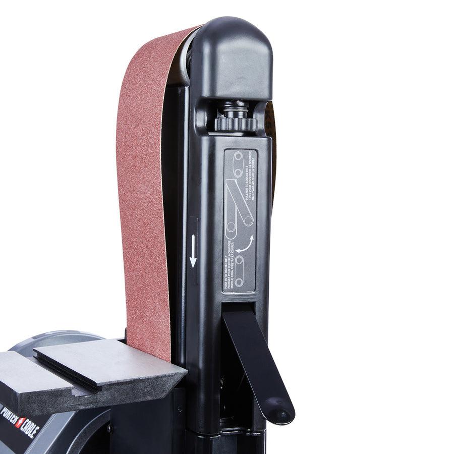 Porter-Cable 5 amp bench top sander comes with a miter gauge, 4-in x 36-in sanding belt, 8-in sanding disc and dust bag