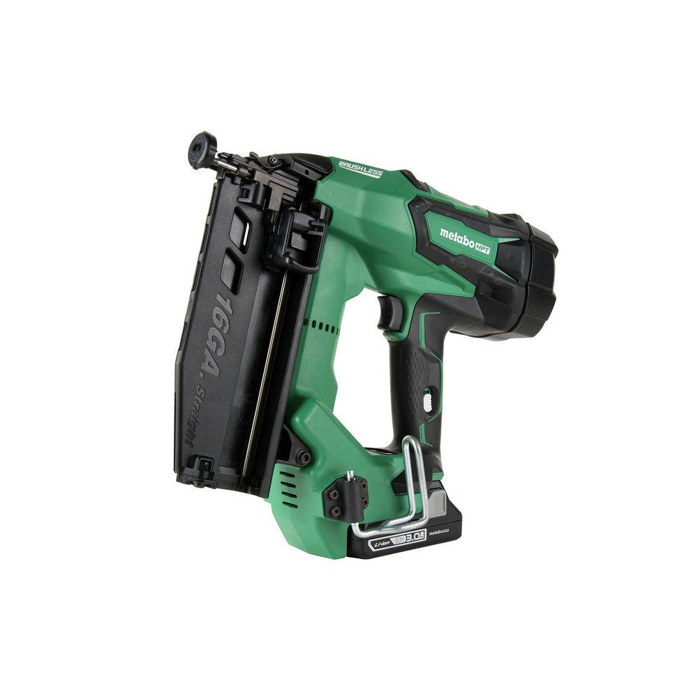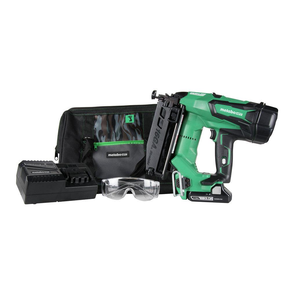 Introducing the Metabo HPT 16 Ga. Cordless Straight Finish Nailer Kit 18 volt, featuring a 2.0Ah 18V battery with a fuel gauge for added convenience. This expertly designed tool accepts 1" to 2-1/2" 16-gauge straight finish nails and boasts a zero ramp-up time, eliminating the need for air tank refills and resulting in faster action. Plus, the air spring drive utilizes compressed air for superior performance, allowing for up to 3 nails per second with no ramp-up time. With the included compact 18V 2.0Ah battery, this nailer can fire up to 950 nails per charge. The brushless motor technology offers longer run time per charge, reduced maintenance, and increased durability. Easily adjust the depth of drive and select between bump or contact drive with the tool-less design. And with Metabo HPT's Lifetime Lithium-Ion Tool Warranty, 2-year lithium-ion battery.