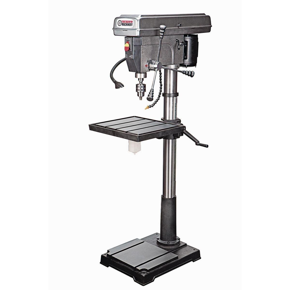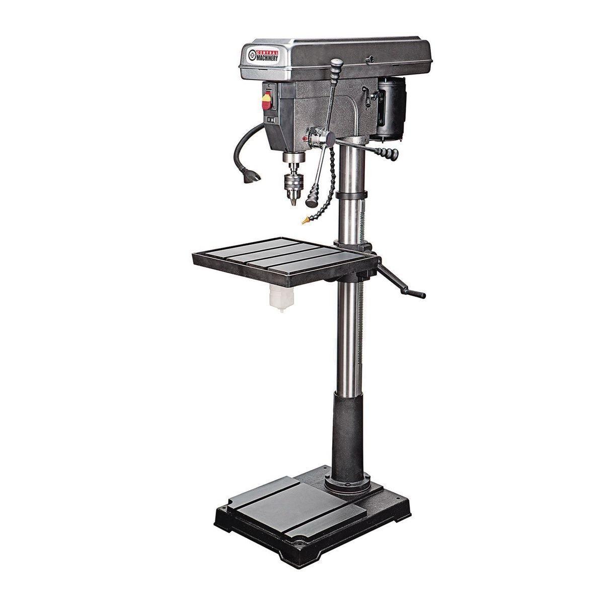 This professional-quality drill press has a multi-speed gearbox for working in a wide range of materials. The drill press features a built-in oiler for drilling metal. This versatile floor production drill press comes with a cast iron table that rotates and tilts.