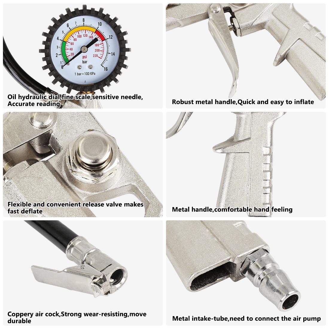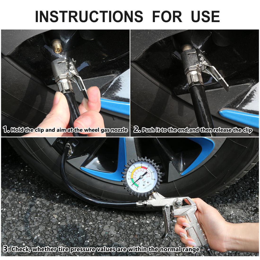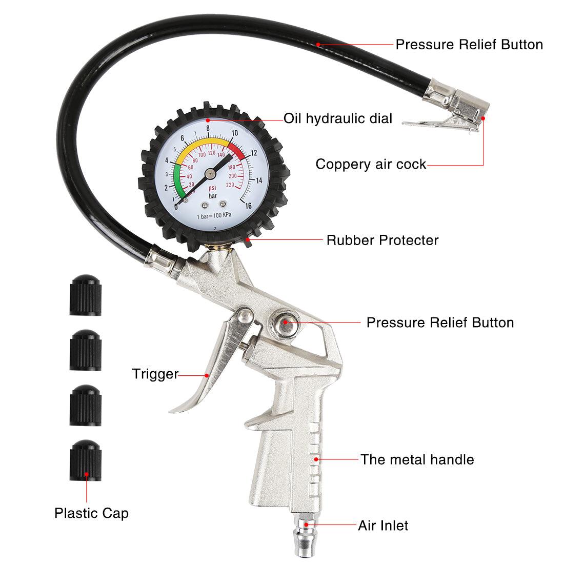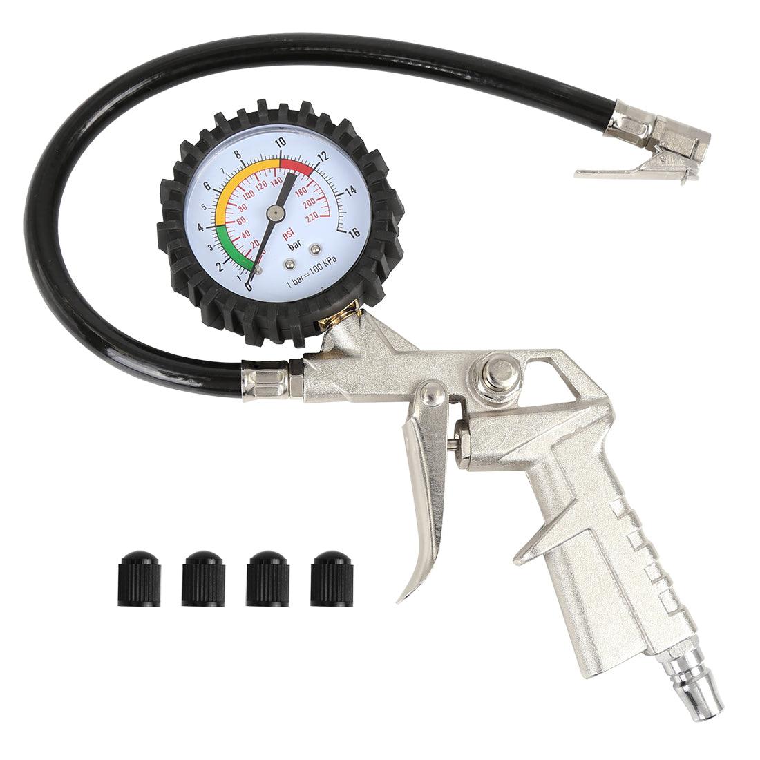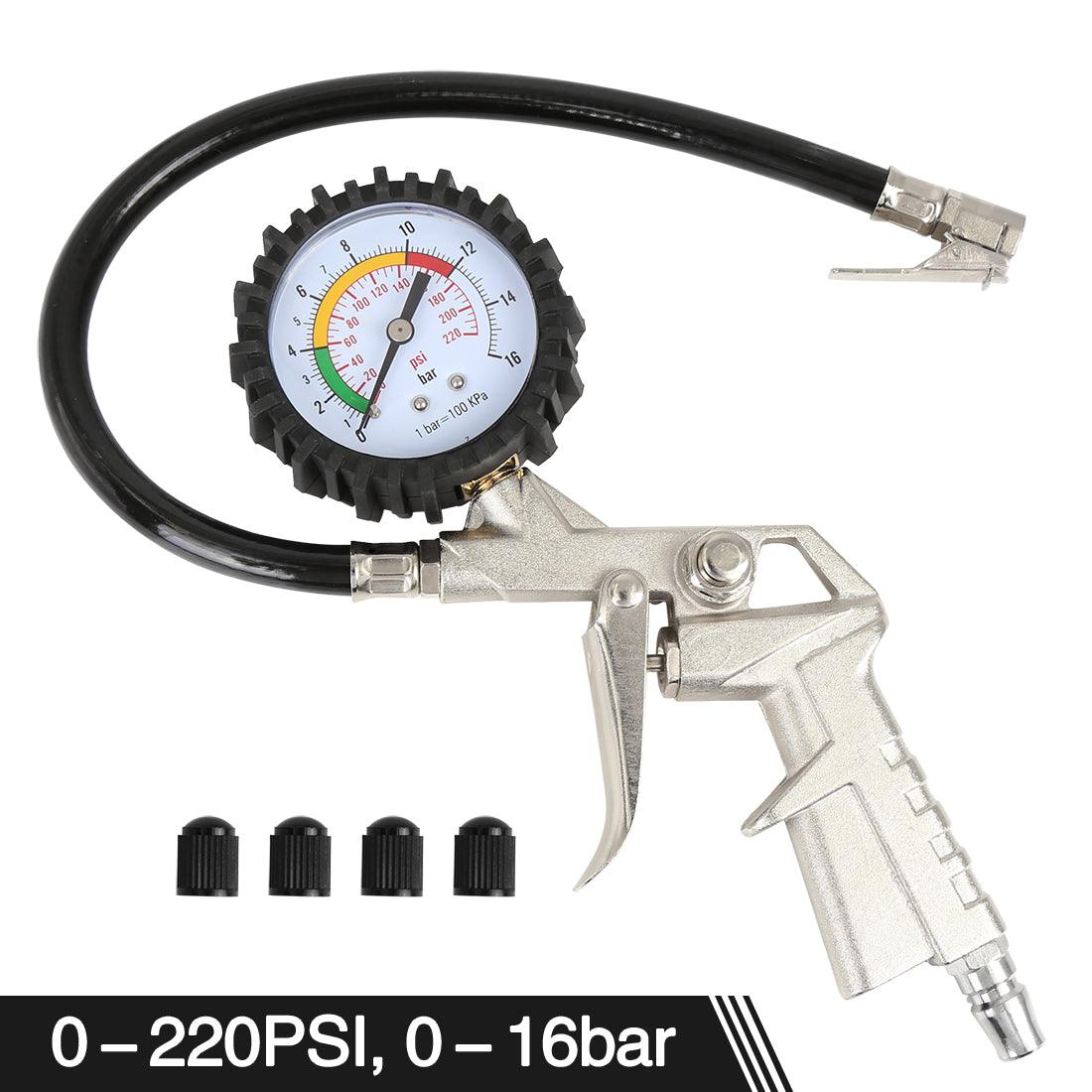 Car Tire Inflator Air Pressure Gauge 220 PSI with Lock On Chuck Rubber Hose