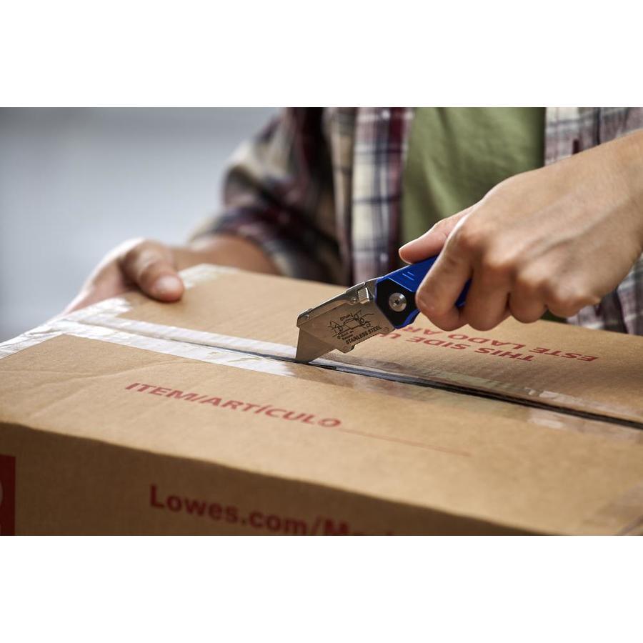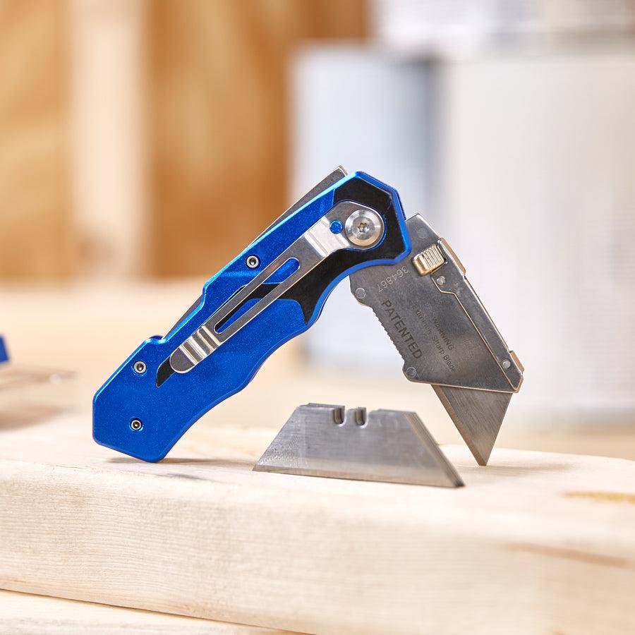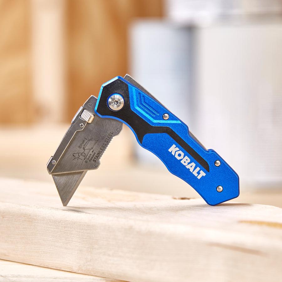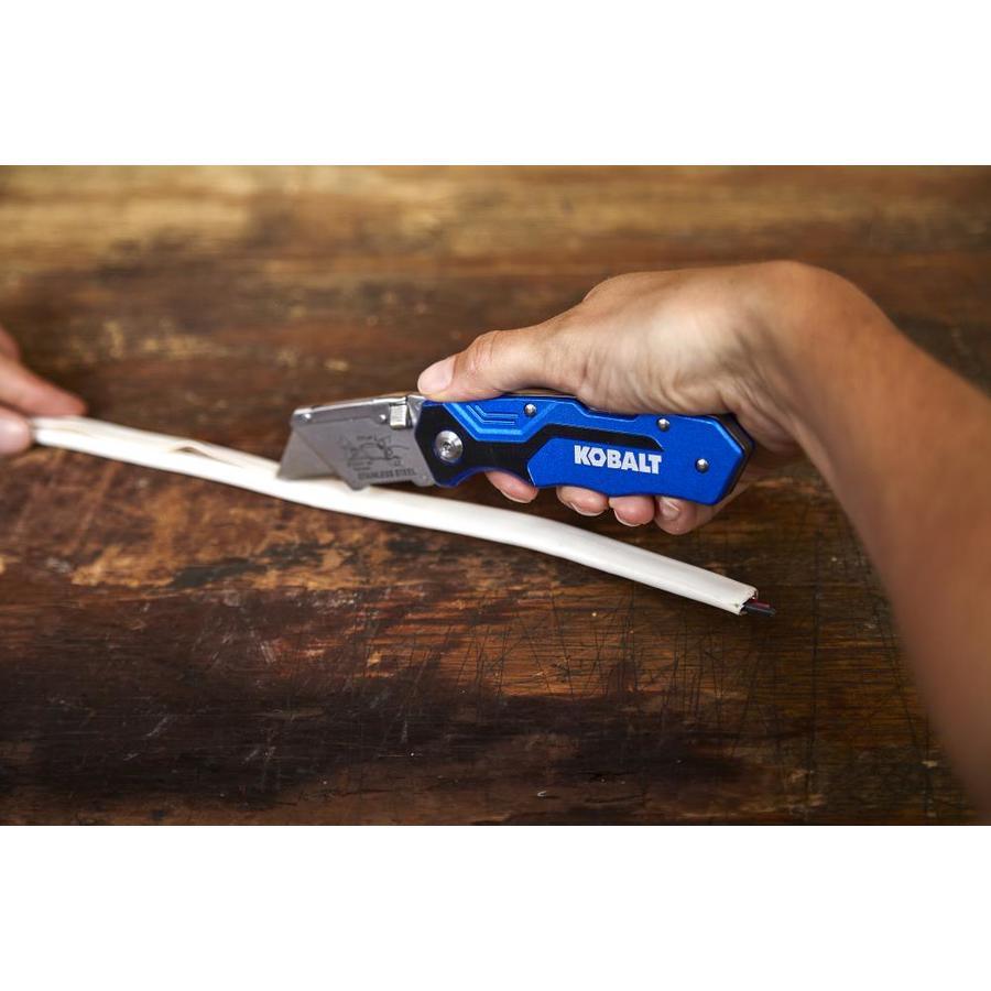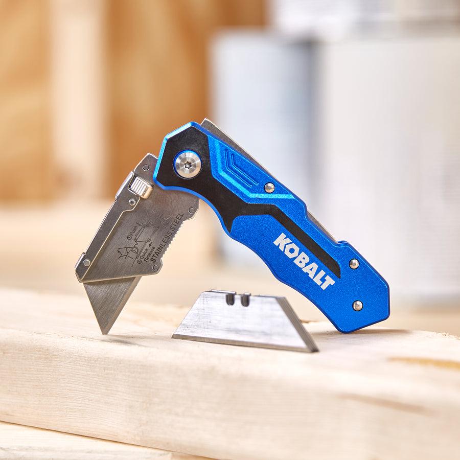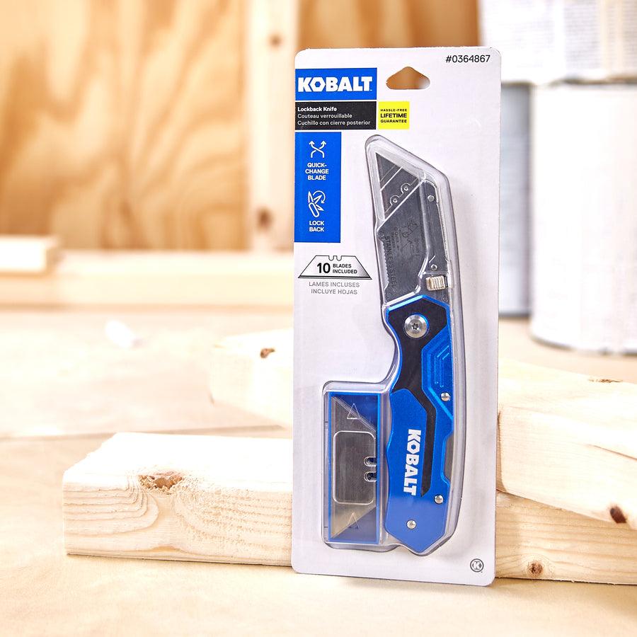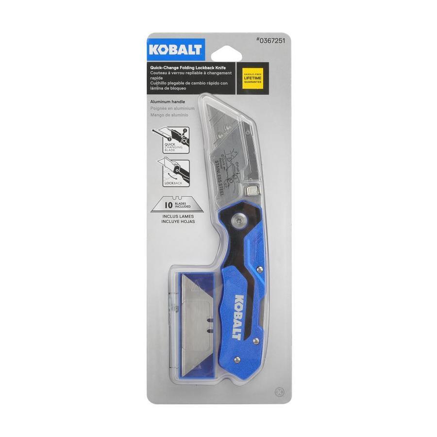 Kobalt quick-change folding lock back knife is ideal for general-purpose cutting Aviation-grade aluminum handle ensures durability Includes 11 blades: 1 installed and 10 in a safety dispenser Quick-change mechanism provides easy blade replacements