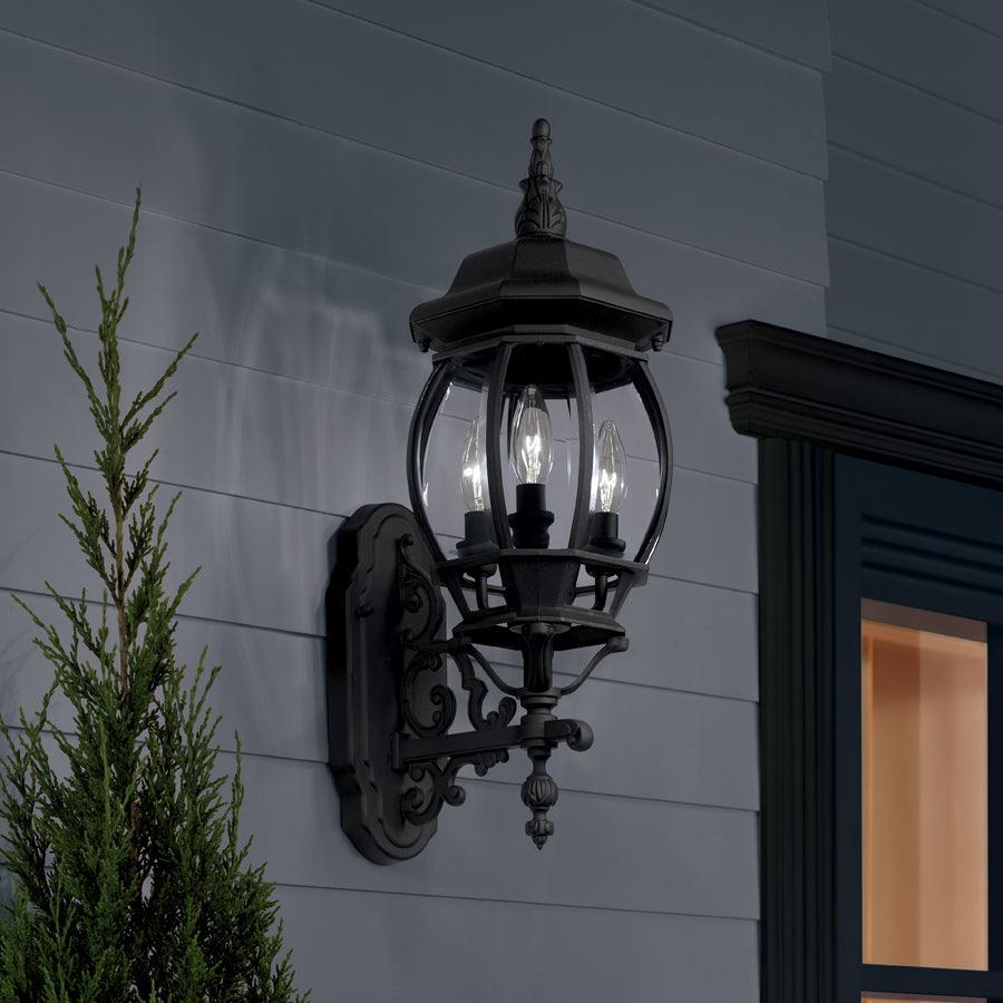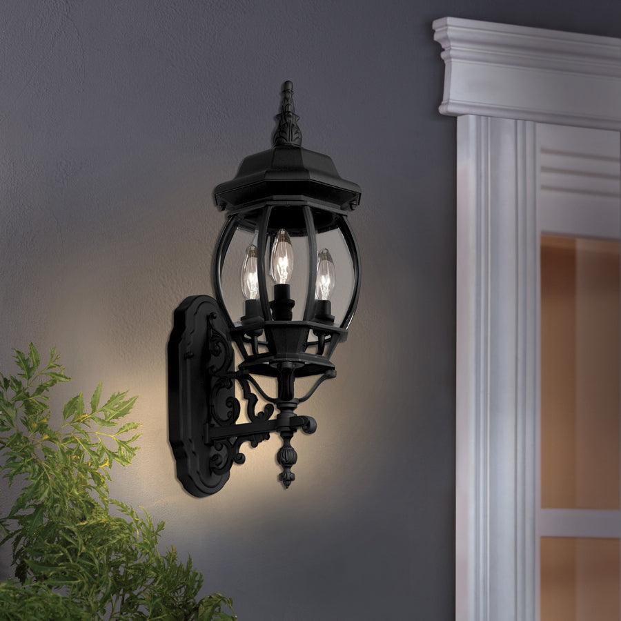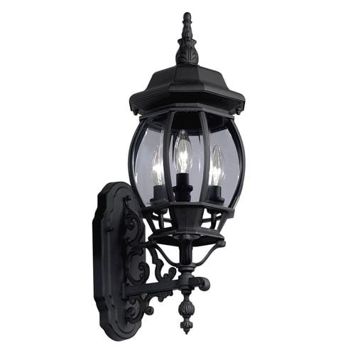 Black die-cast aluminum fixture with beveled glass is weather-resistant and sturdy