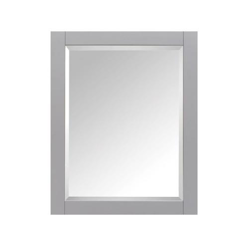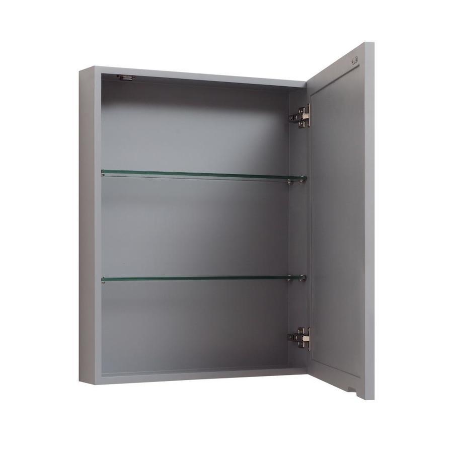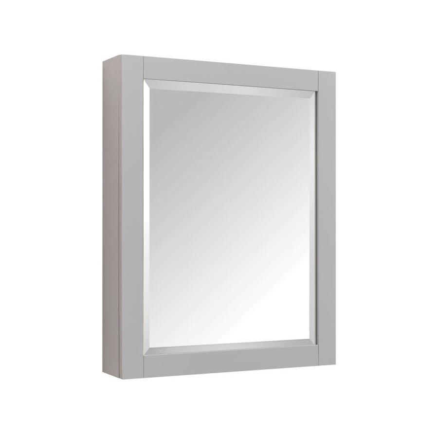 24 W x 5 D x 30 H inches Solid poplar wood frame Chilled gray Beveled mirror 1 soft-close door and 2 glass shelves Hangs vertically Wood cleat for easy hanging and leveling
