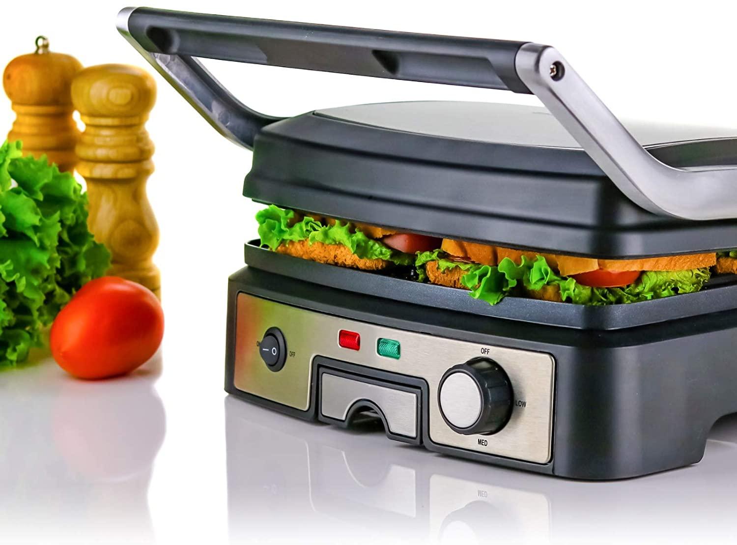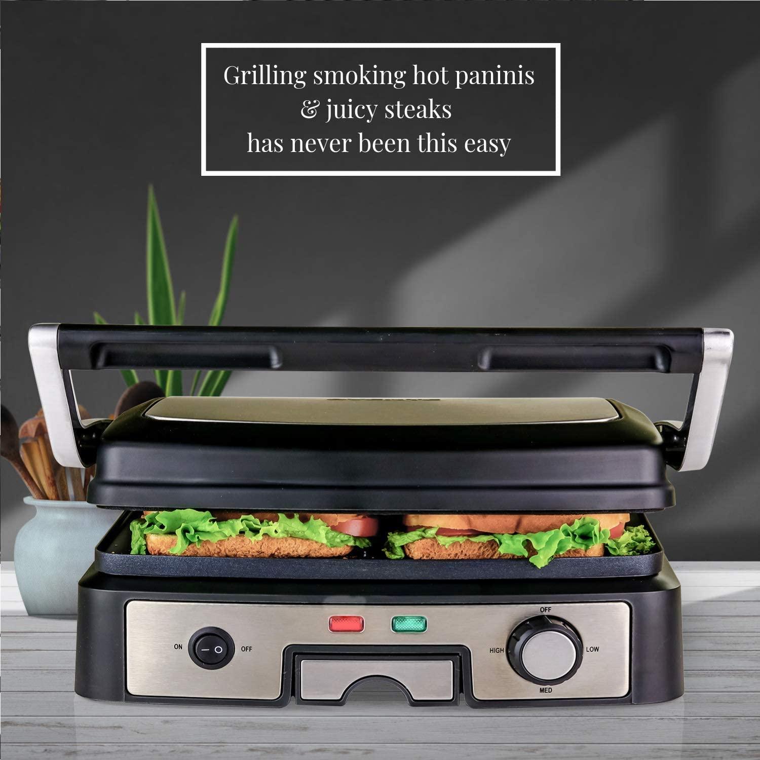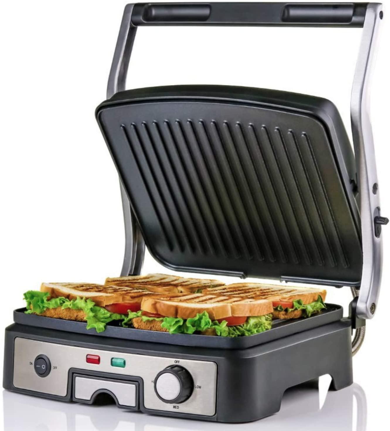 Ovente Electric Panini Press Grill Bread Toaster Nonstick Double Sided Flat Plates with 3 Temperature Setting & Removable Drip Tray, 4 Slice Sandwich Maker for Burger & Grilled Cheese, Silver GP1861BR
