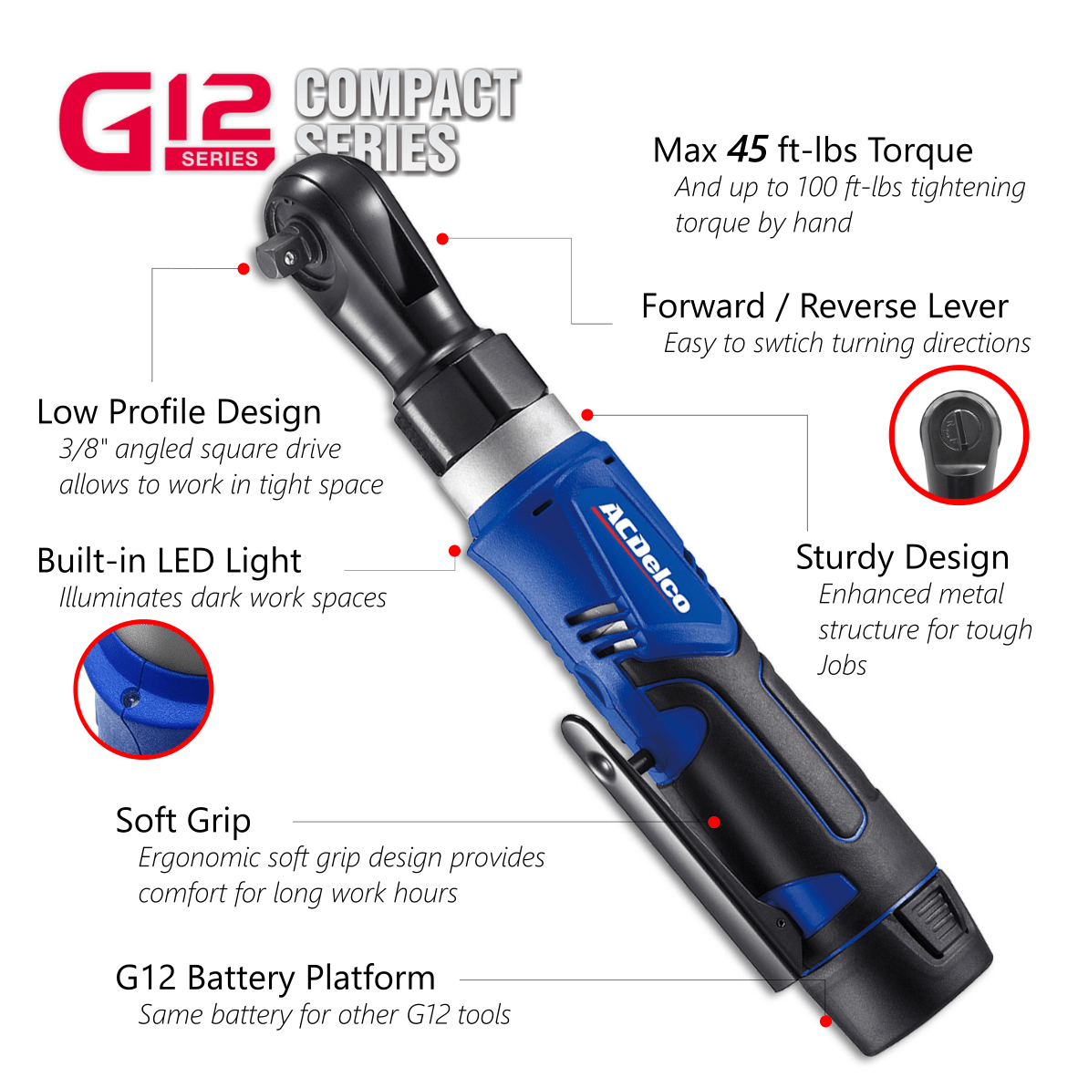 ACDelco Power Cordless 3/8’’ Ratchet Wrench 12V Compact Size, Max. Torque 45 ft-Lbs , Max. Hand Tightening Torque 100ft-lbs , Tool Kit with 2.0 Ah Battery and Charger ARW1209