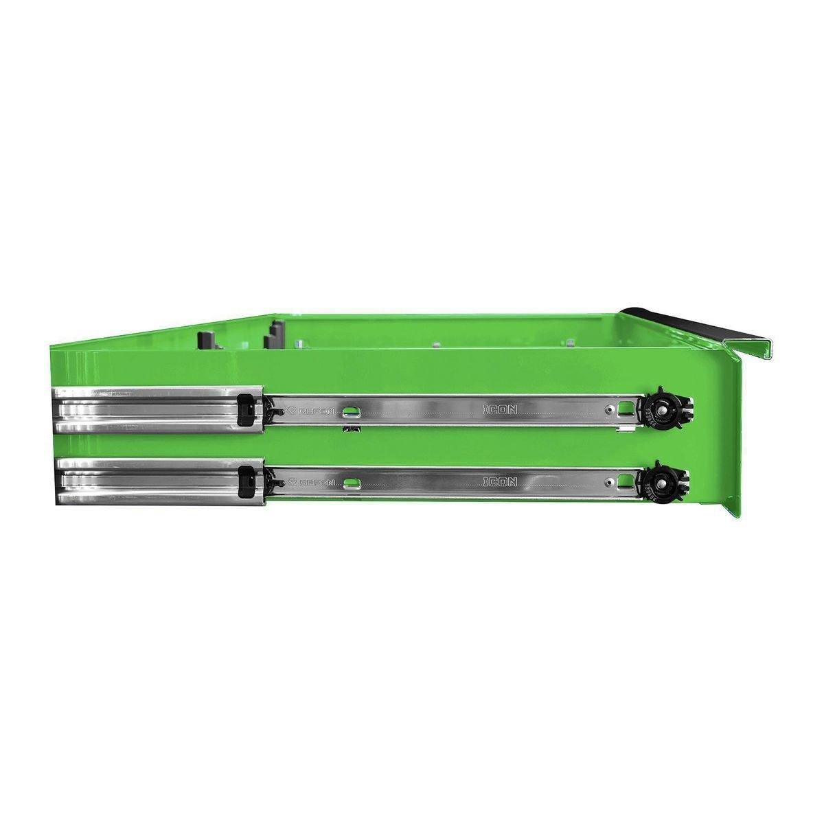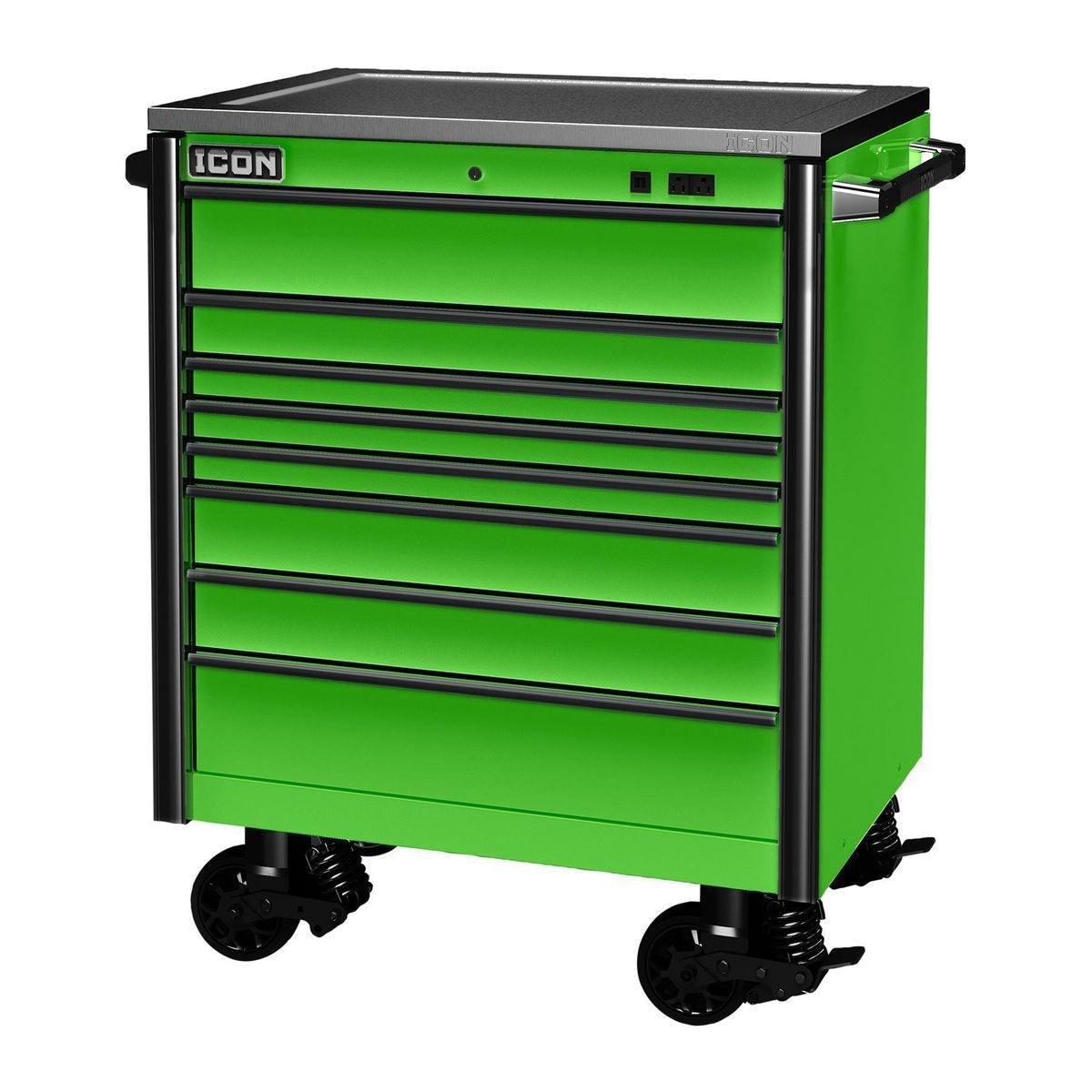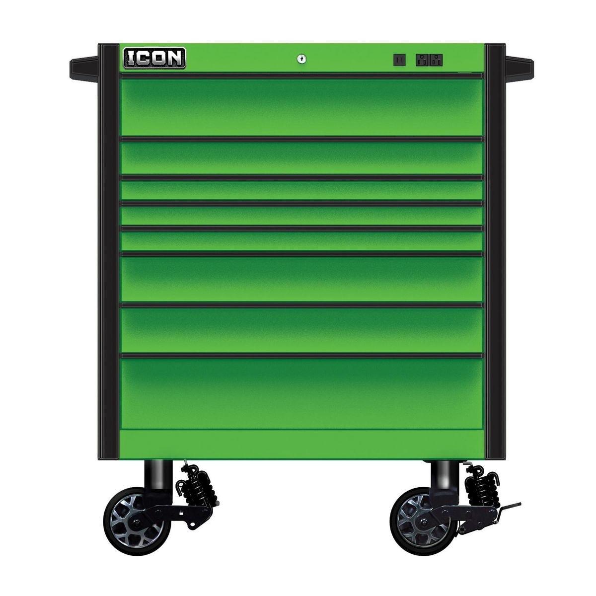 Built with the strongest steel and precision reinforced welds, Icon™ storage is tough enough for the daily grind of a busy shop…and you don’t have to break the bank to get the tool cabinet you deserve. Every Icon™ cabinet features a double-wall steel frame for ultimate strength. Industry-leading 16-gauge top and outside panels prevent dents and withstand the demands of daily use, and 18-gauge inside panels evenly support drawer and slide weight. Structural corner brackets prevent cabinet twist and racking. Under every Icon™ roller cabinet, three 14-gauge U channels distribute weight evenly to the industry-leading 2,000-pound-rated suspension casters with easy locks, so these boxes glide into place easily and stay in place securely. With a staggering 8,000-pound capacity, Icon™ roller cabinets are more than double the overall weight capacity of comparably sized Snap-On cabinets. These boxes are beautiful. Their premium ultra-tough powder-coat finish will withstand harsh chemicals and provide a showroom finish that looks like new, even after years of punishing use. Every drawer features the highest-quality ball bearing full extension drawer slides that support up to 265 pounds per set—or 530 pounds for drawers with double slides—even more than Snap-On’s Masters Series. An adjustable-force drawer latch system lets you dial-in just the right amount of force to keep drawers from opening when they should be closed. And heavy-duty non-slip drawer liners will keep your tools in place...right where you put them. Icon™ storage features an integrated power system. The convenient exterior power is equipped with two fast-charging USBs and two 110V outlets. An advanced locking system turns your tool cabinet into a vault to keep your valuable tools safe and secure. The interchangeable core lock comes with security milled keys that allow you to key-alike all your Icon™ storage units as you expand. The base cabinets are offered in three sizes - 36, 56 and 73 inches. And all Icon™ storage comes in four colors: Red, Blue, Black and Green. All Icon™ storage comes with free door-to-door delivery and a lifetime warranty - plus, a full line of replacement parts is available. It’s the only storage solution you’ll ever need.