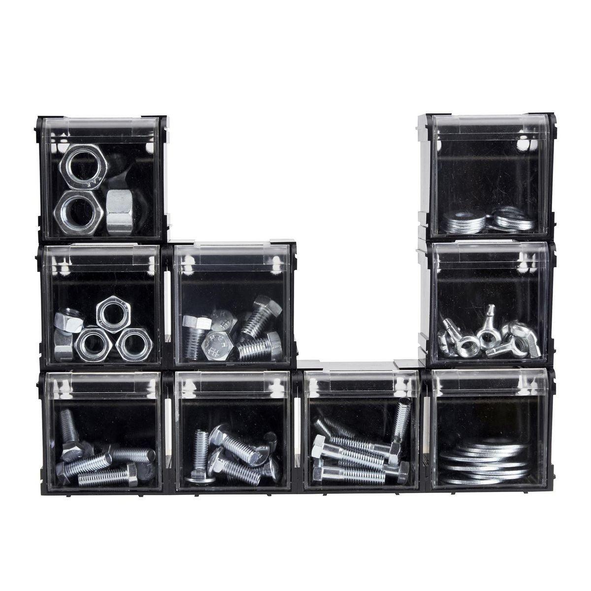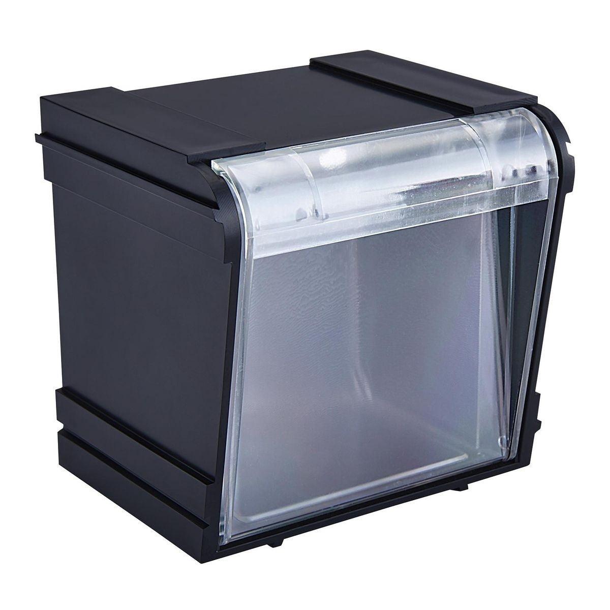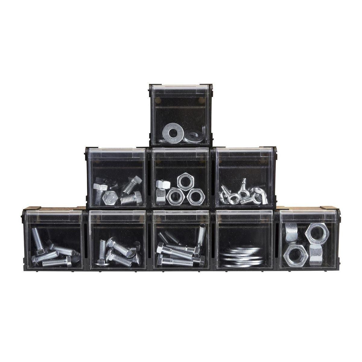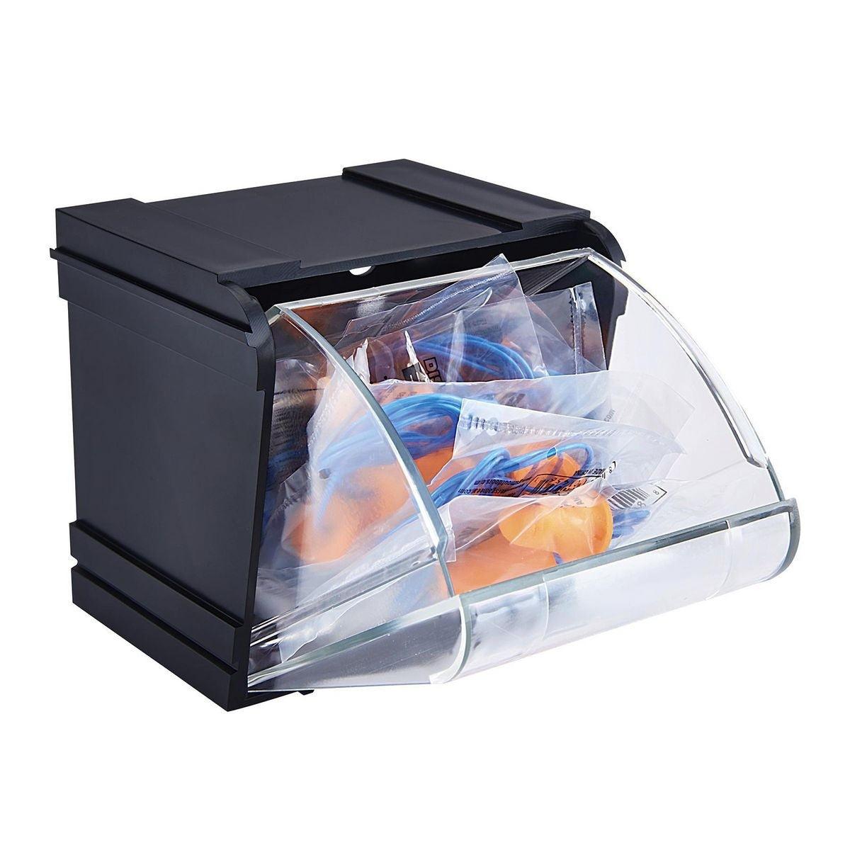 This 4 in. stacking tilt bin features a compact design making it ideal for home, office and jobsite use. With a durable impact resistant construction and interlocking grooves allowing multiple units to attach to each other - vertically or horizontally - the large plastic bin neatly stacks in cabinets, desktops, or can be wall mounted.