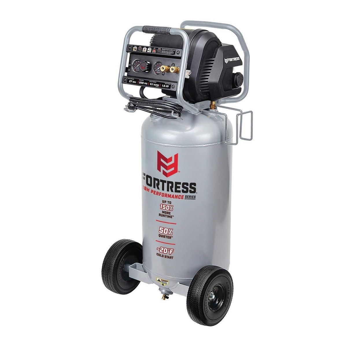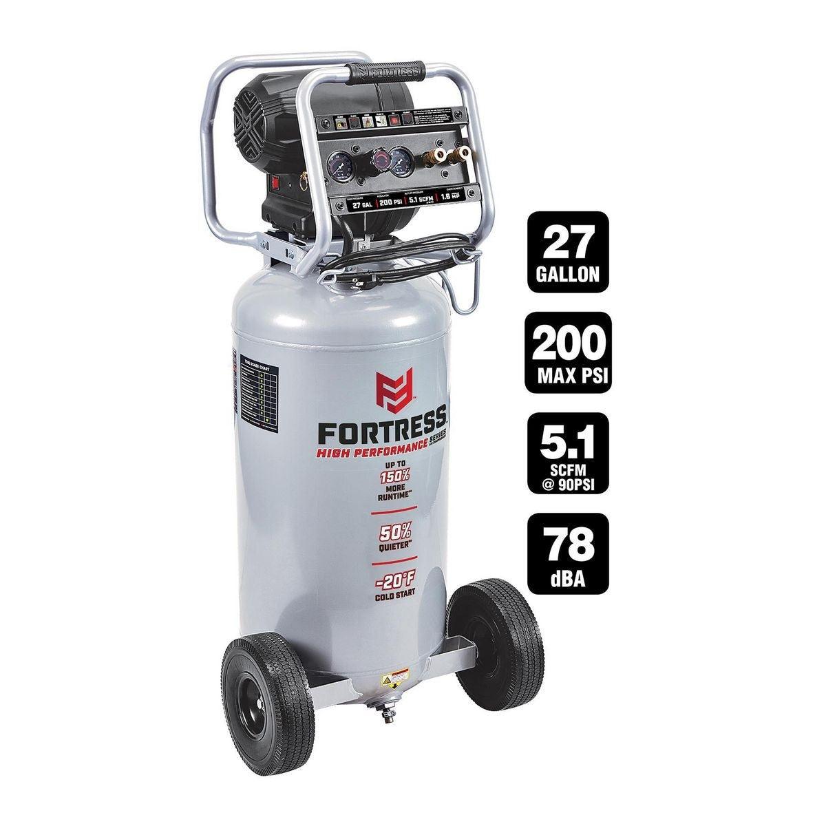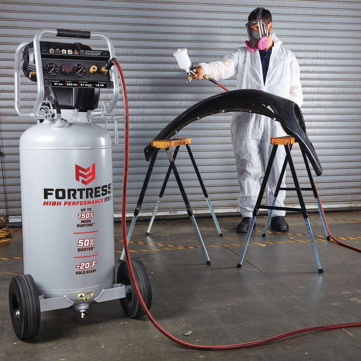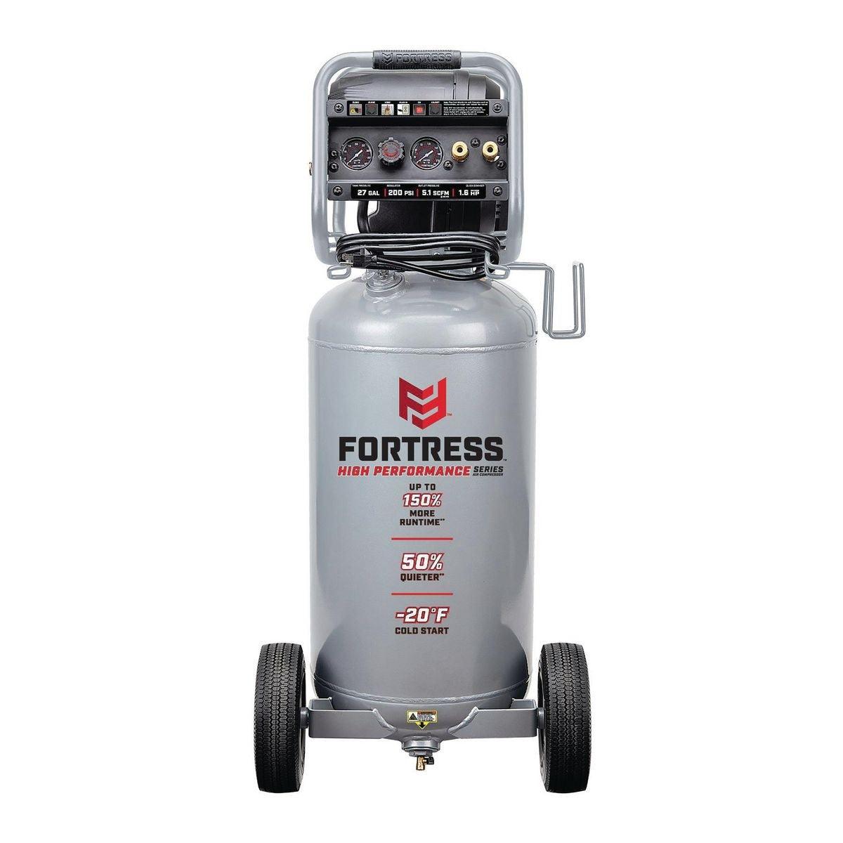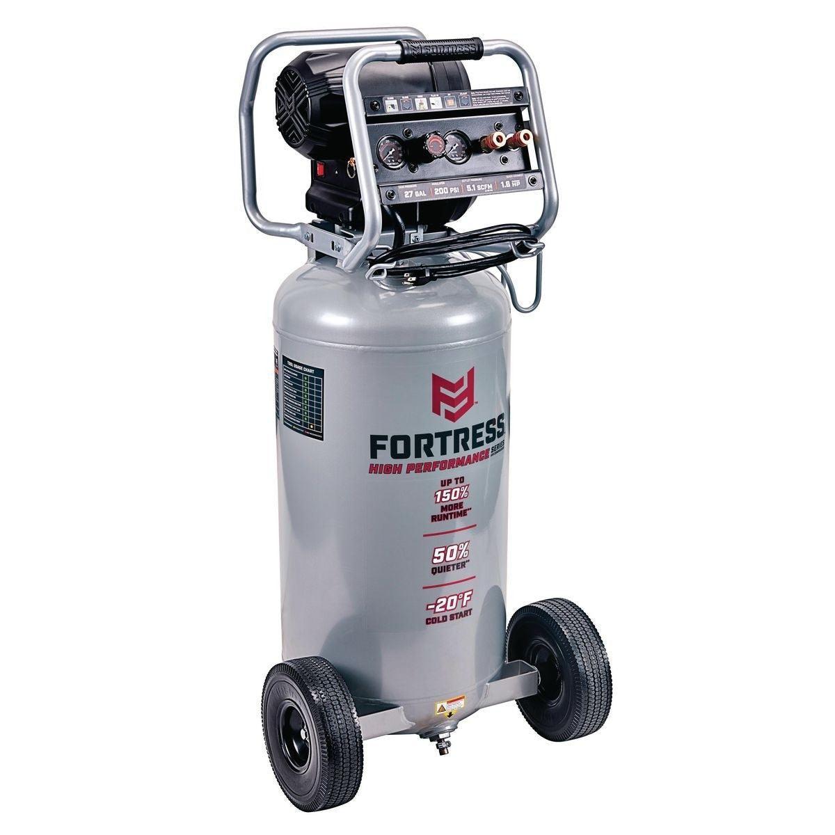 This High Performance 200 PSI Air Compressor from Fortress® has up to 75% more runtime and features a soft start motor that powers a maintenance free pump. The full roll cage protects the vital pump and motor assembly. This high performance air compressor also features a hose wrap, cord wrap, 10 in. flat free tires, integrated control panel with 2 in. gauges and 2 brass universal couplers, so it's ready to go right out of the box.