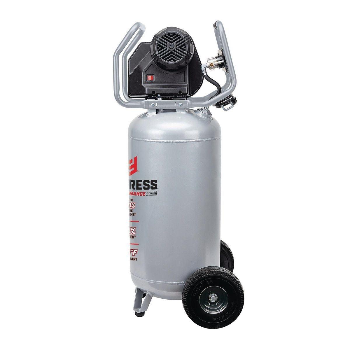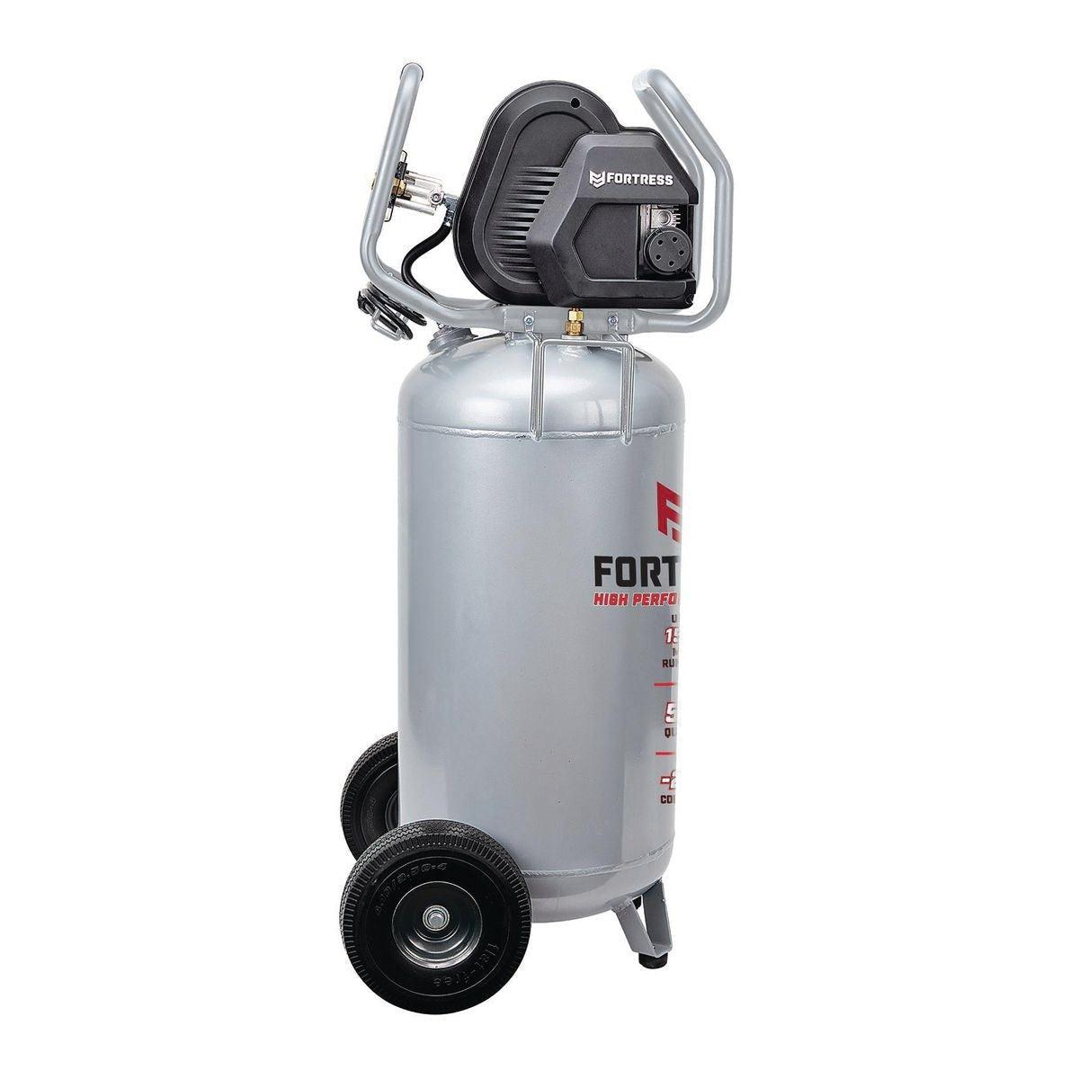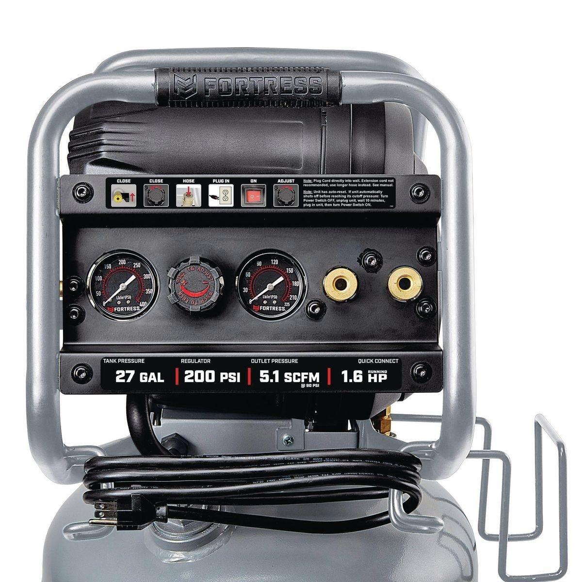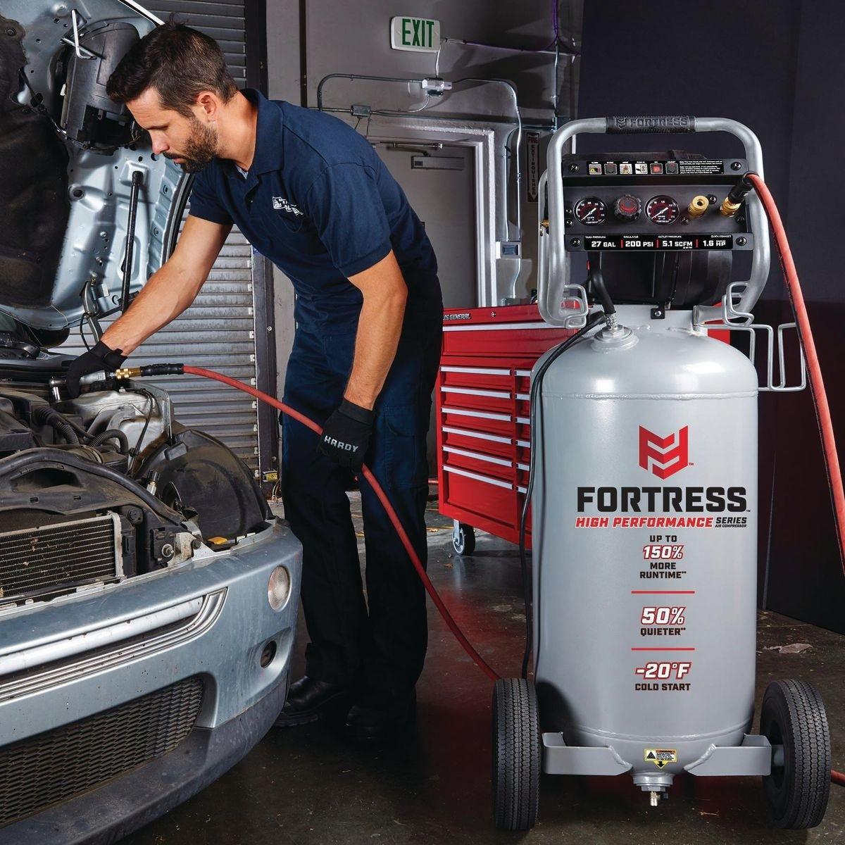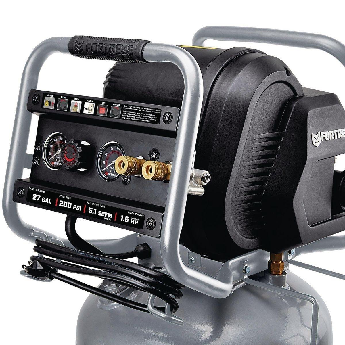 This High Performance 200 PSI Air Compressor from Fortress® has up to 75% more runtime and features a soft start motor that powers a maintenance free pump. The full roll cage protects the vital pump and motor assembly. This high performance air compressor also features a hose wrap, cord wrap, 10 in. flat free tires, integrated control panel with 2 in. gauges and 2 brass universal couplers, so it's ready to go right out of the box.