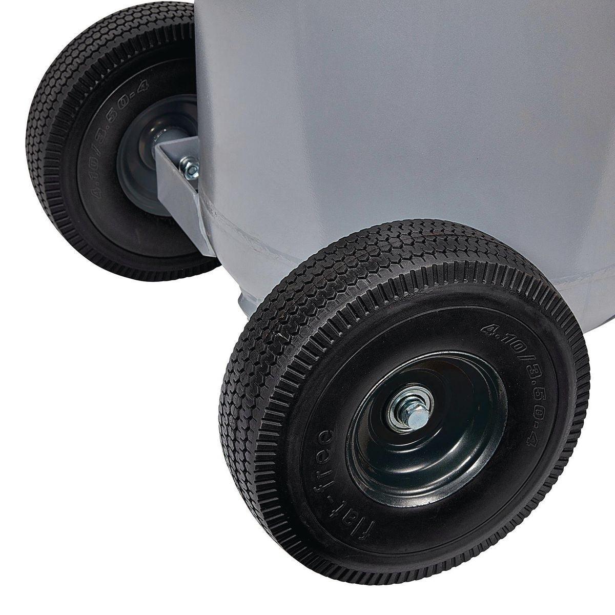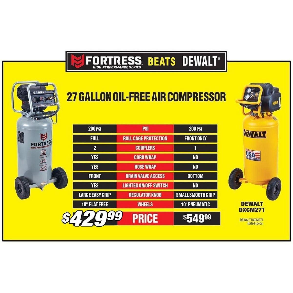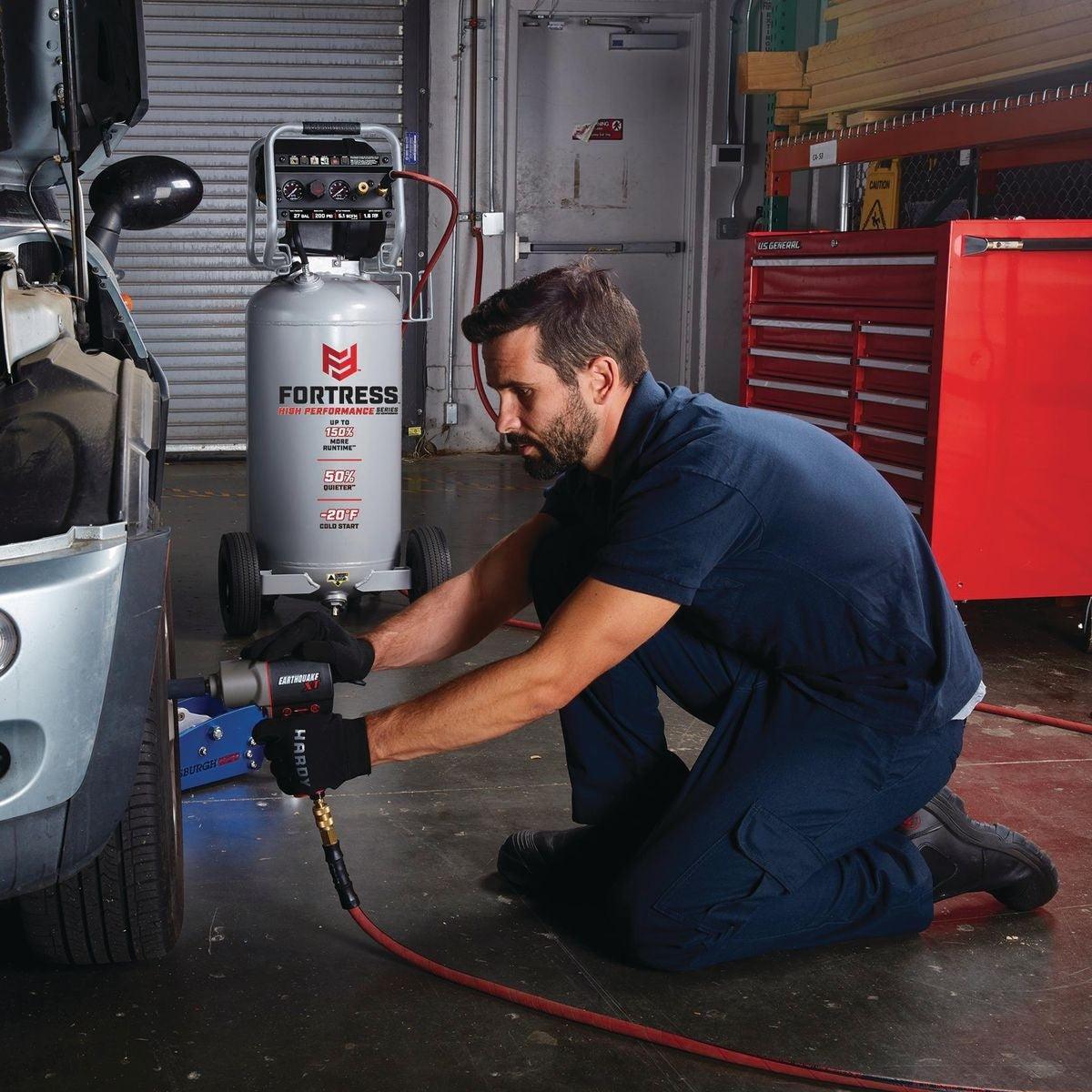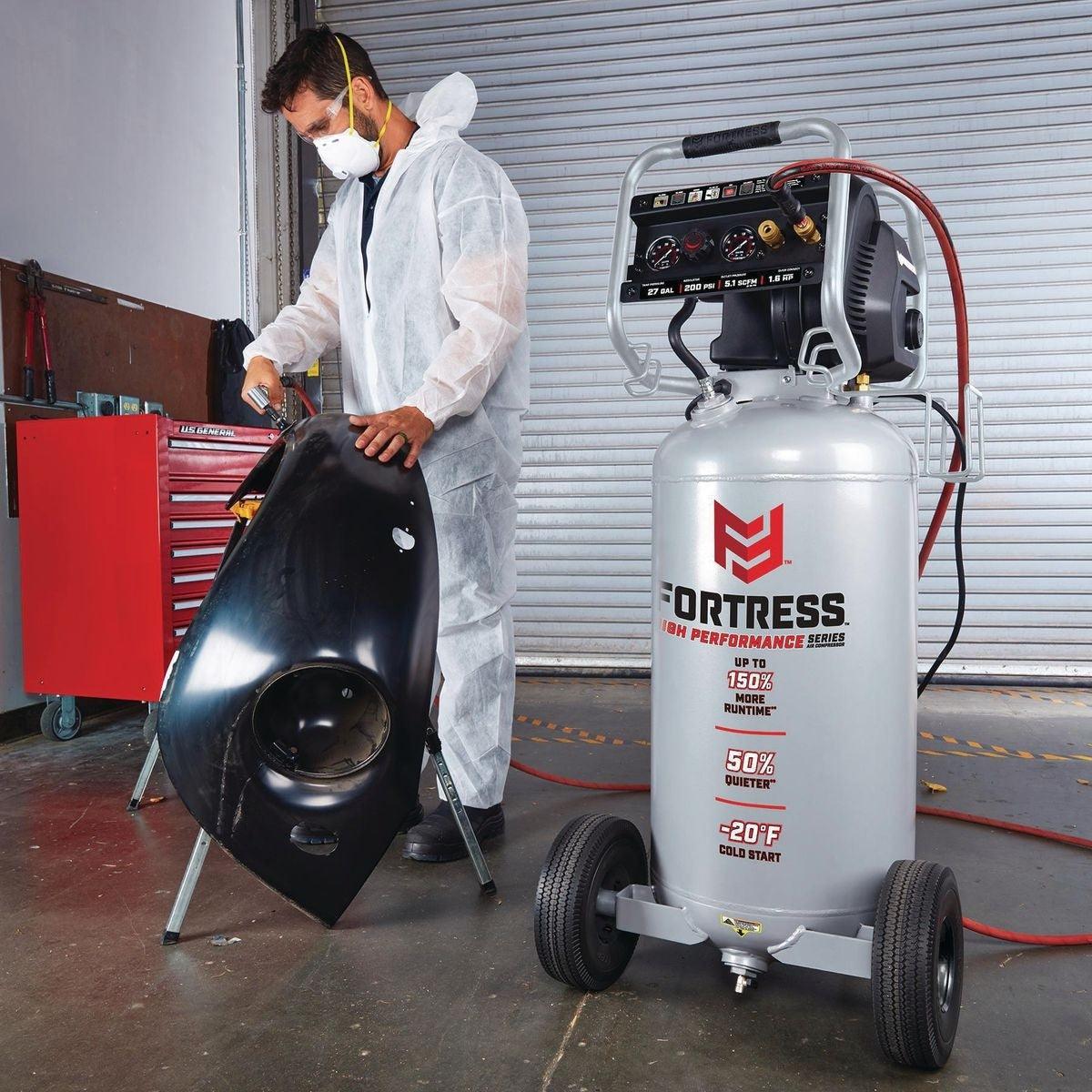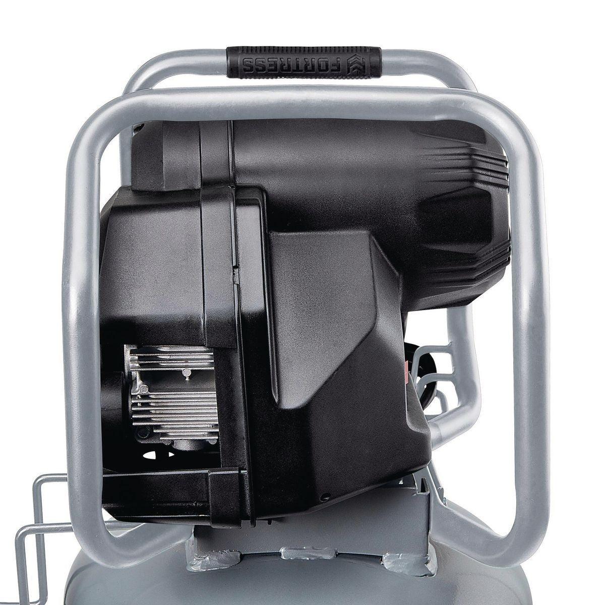 This High Performance 200 PSI Air Compressor from Fortress® has up to 75% more runtime and features a soft start motor that powers a maintenance free pump. The full roll cage protects the vital pump and motor assembly. This high performance air compressor also features a hose wrap, cord wrap, 10 in. flat free tires, integrated control panel with 2 in. gauges and 2 brass universal couplers, so it's ready to go right out of the box.