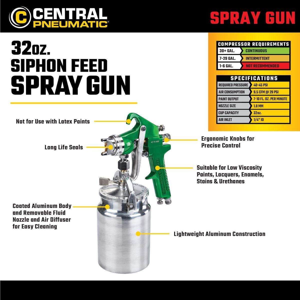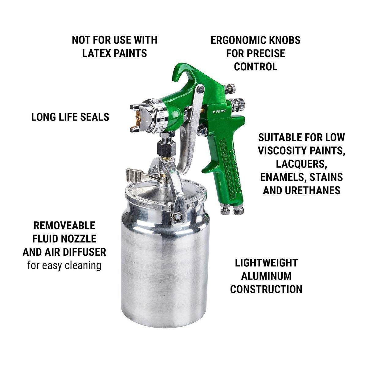 This general purpose siphon feed spray gun has a coated aluminum body combined with a removable fluid nozzle and air diffuser for quick and easy cleaning. Ideal for use with low viscosity paints, lacquers, enamels, stains and urethanes, this paint spray gun has ergonomic knobs for precise control. Rugged construction and long-life seals make this spray gun durable enough for regular use.