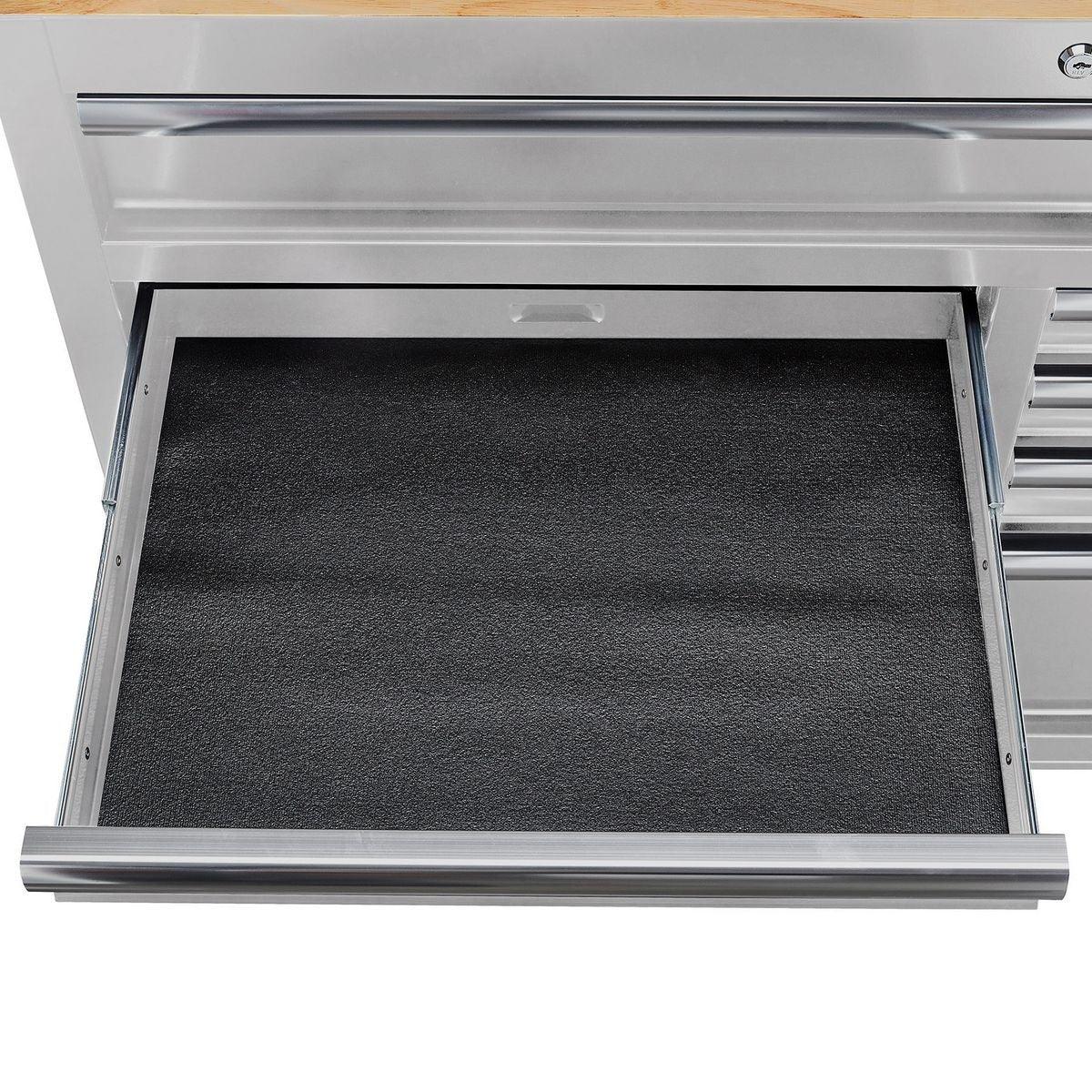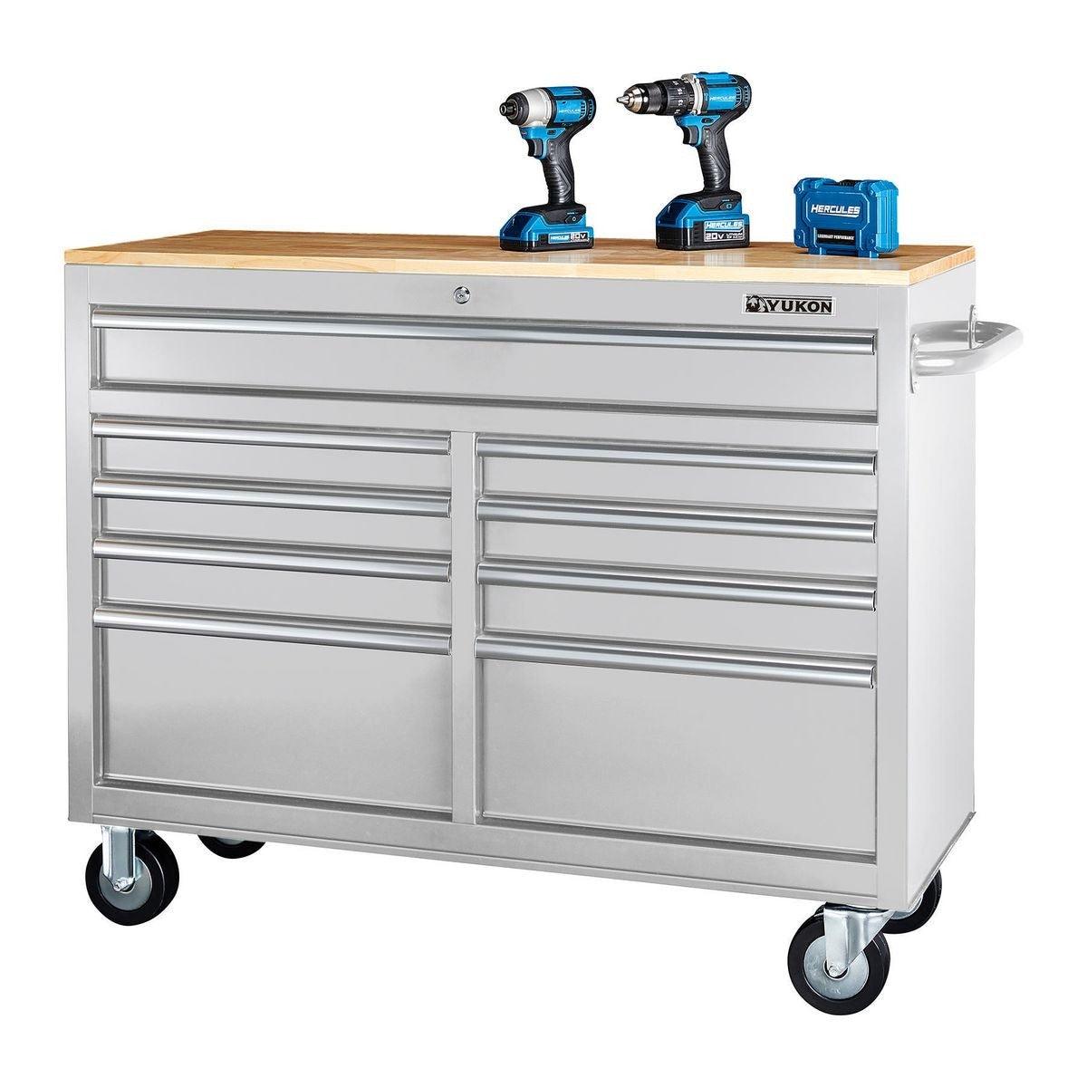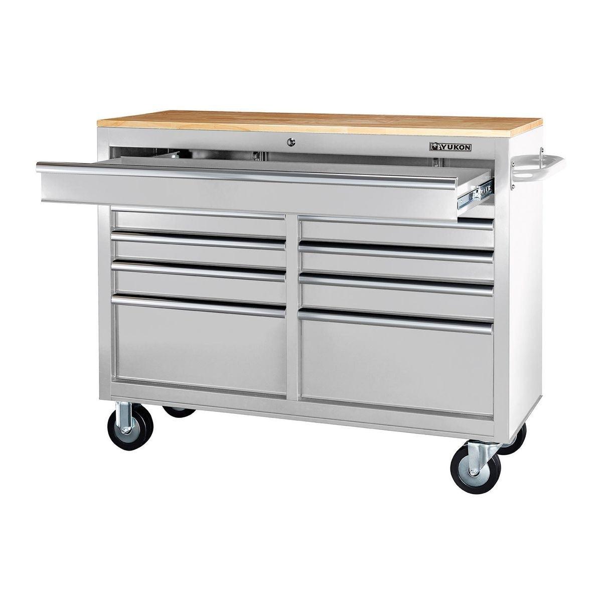 This Yukon® 46 in. 9 Drawer Storage Cabinet has a double bank of drawers with ball-bearing slides for smooth opening. Made with heavy gauge steel, heavy duty drawer slides and a high load capacity, this 9 drawer workstation has a solid wood top with a large surface area. The extra large bottom drawers are ideal for power tool storage.