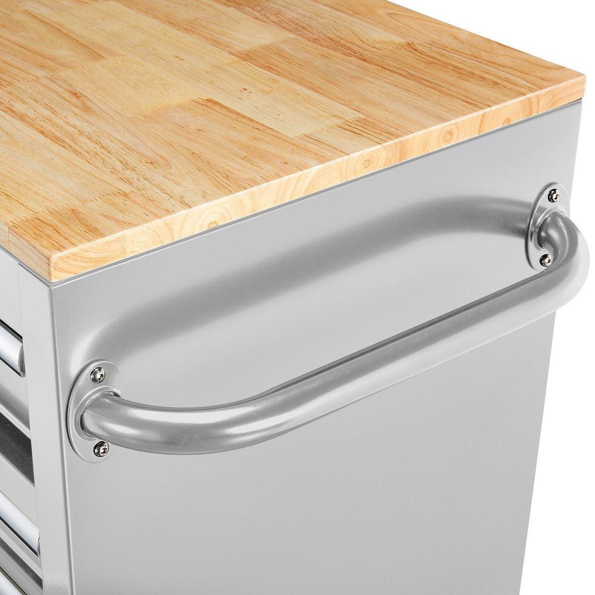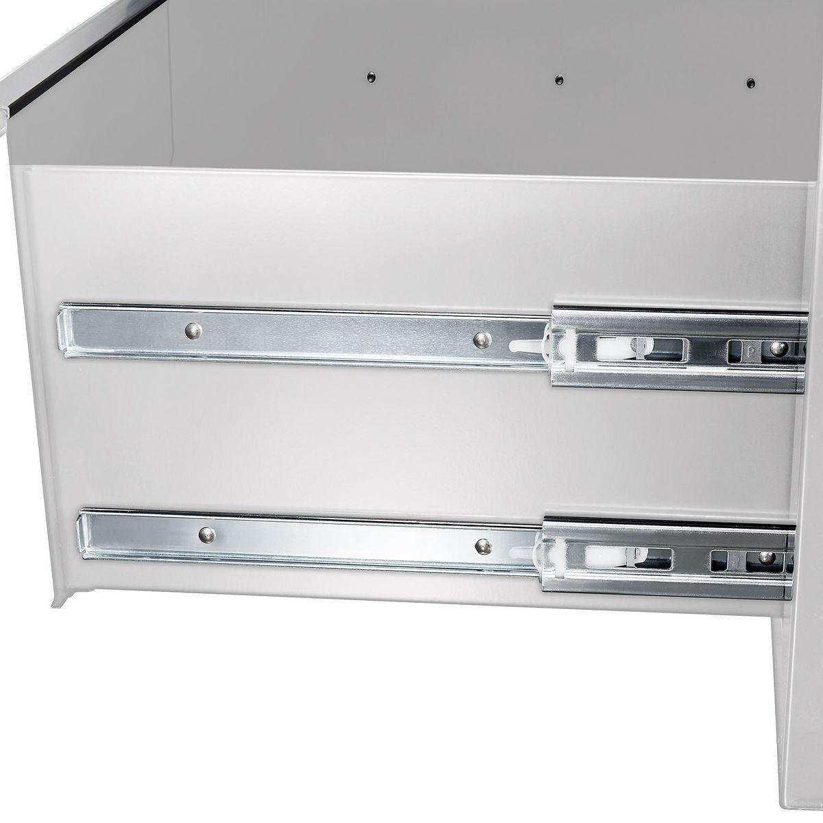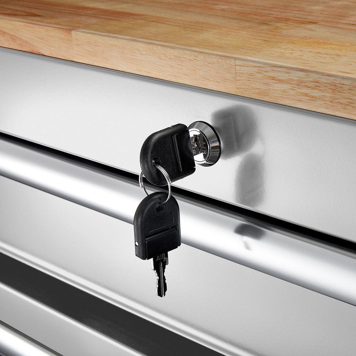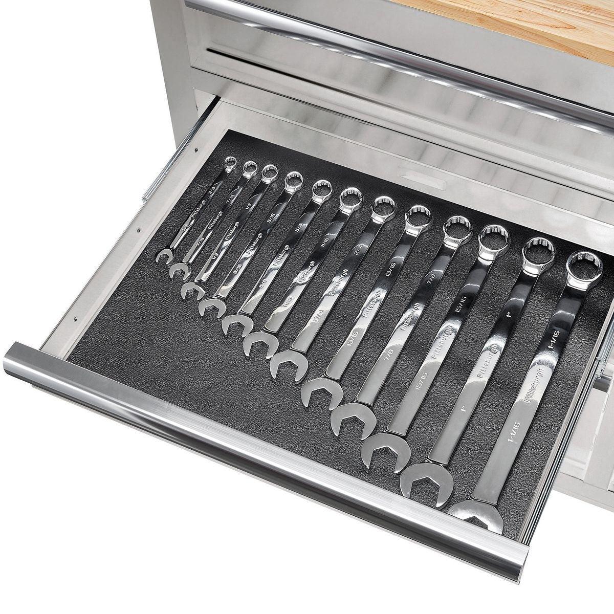 This Yukon® 46 in. 9 Drawer Storage Cabinet has a double bank of drawers with ball-bearing slides for smooth opening. Made with heavy gauge steel, heavy duty drawer slides and a high load capacity, this 9 drawer workstation has a solid wood top with a large surface area. The extra large bottom drawers are ideal for power tool storage.