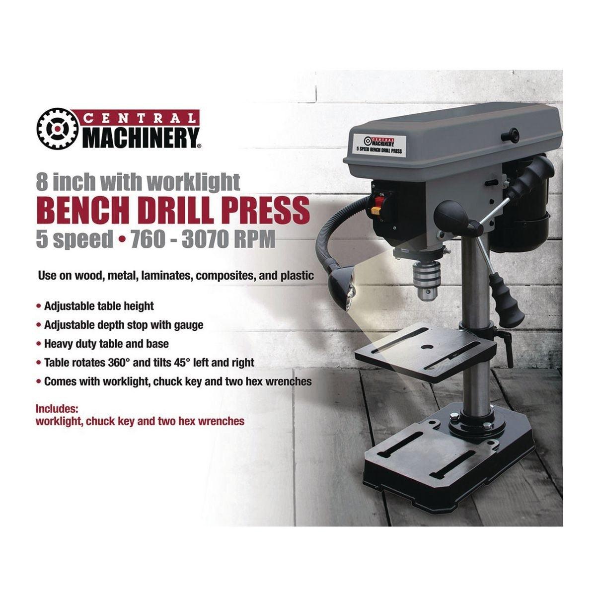All-purpose bench mount drill press for the home or shop. Professional accessories include a built-in work light and tilt table. The bench mount drill press features an adjustable depth stop with gauge and formed steel base and head for optimal durability.