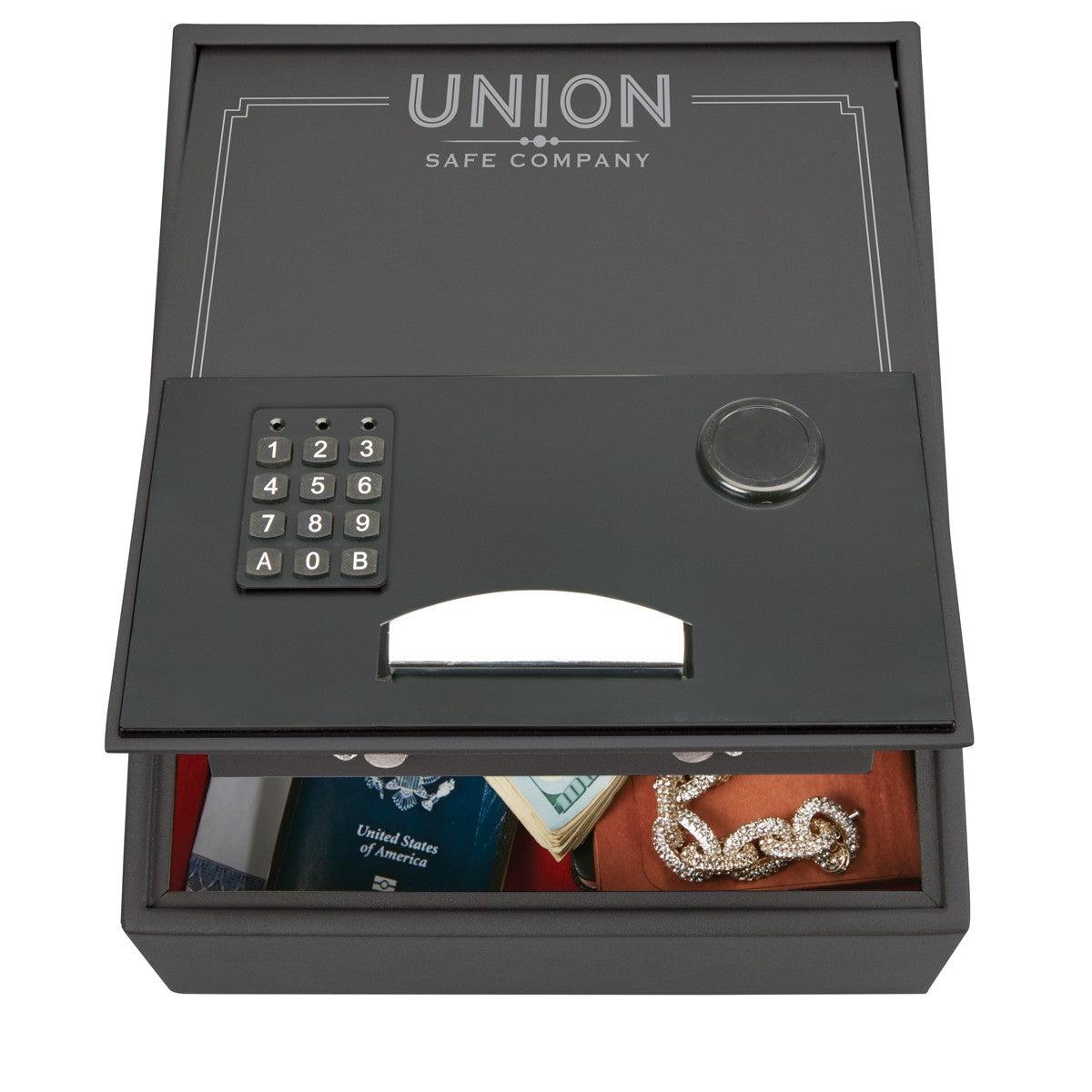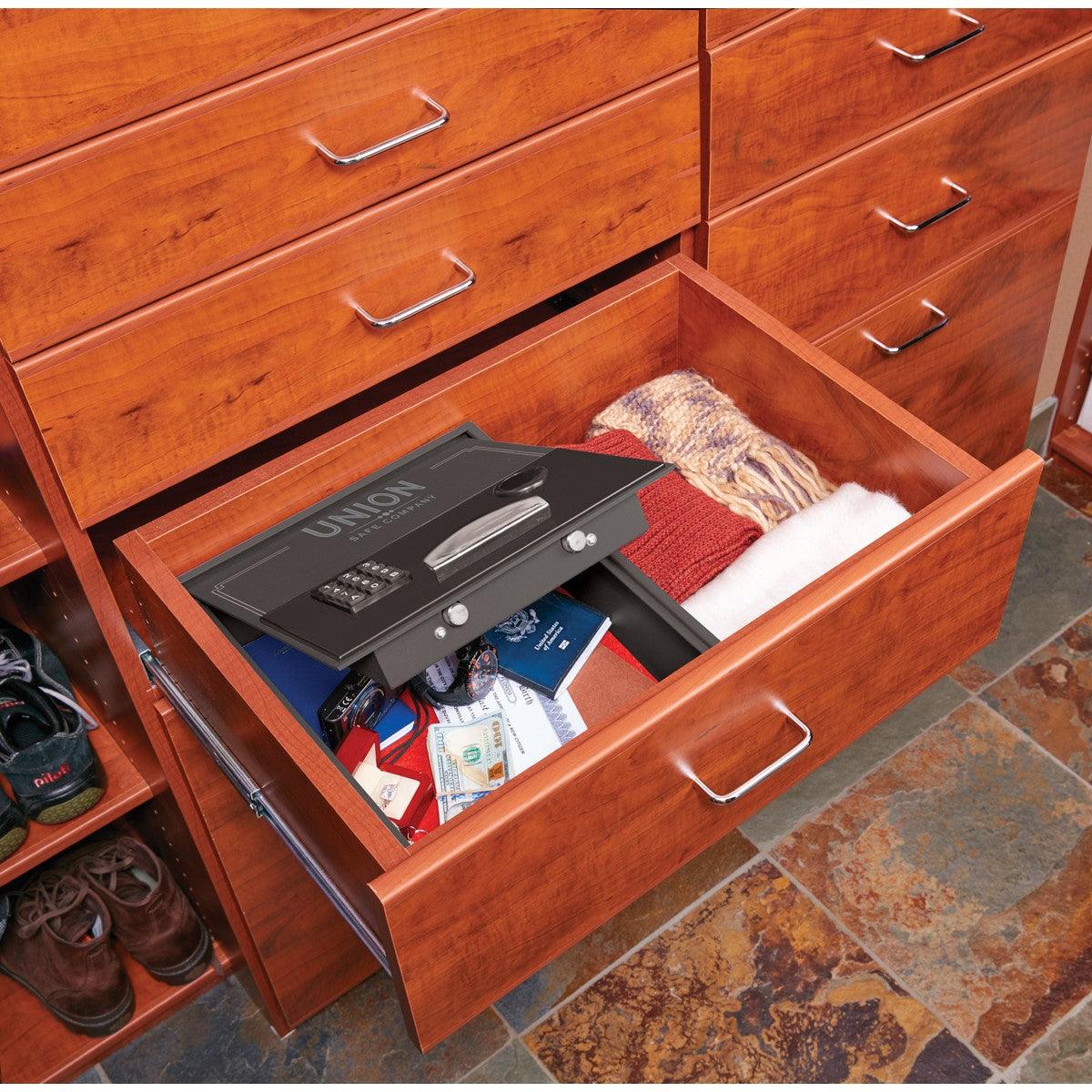 This free-standing digital drawer safe is small enough to stay out of sight in a bureau, keeping valuables safe and secure. This drawer safe features 12, 16 and 18 gauge sheet steel construction to protect important documents, jewelry, passports or cash. With a dual security system for keyless access and hidden keyed override, this is a great drawer safe for the bedroom, office or shop.