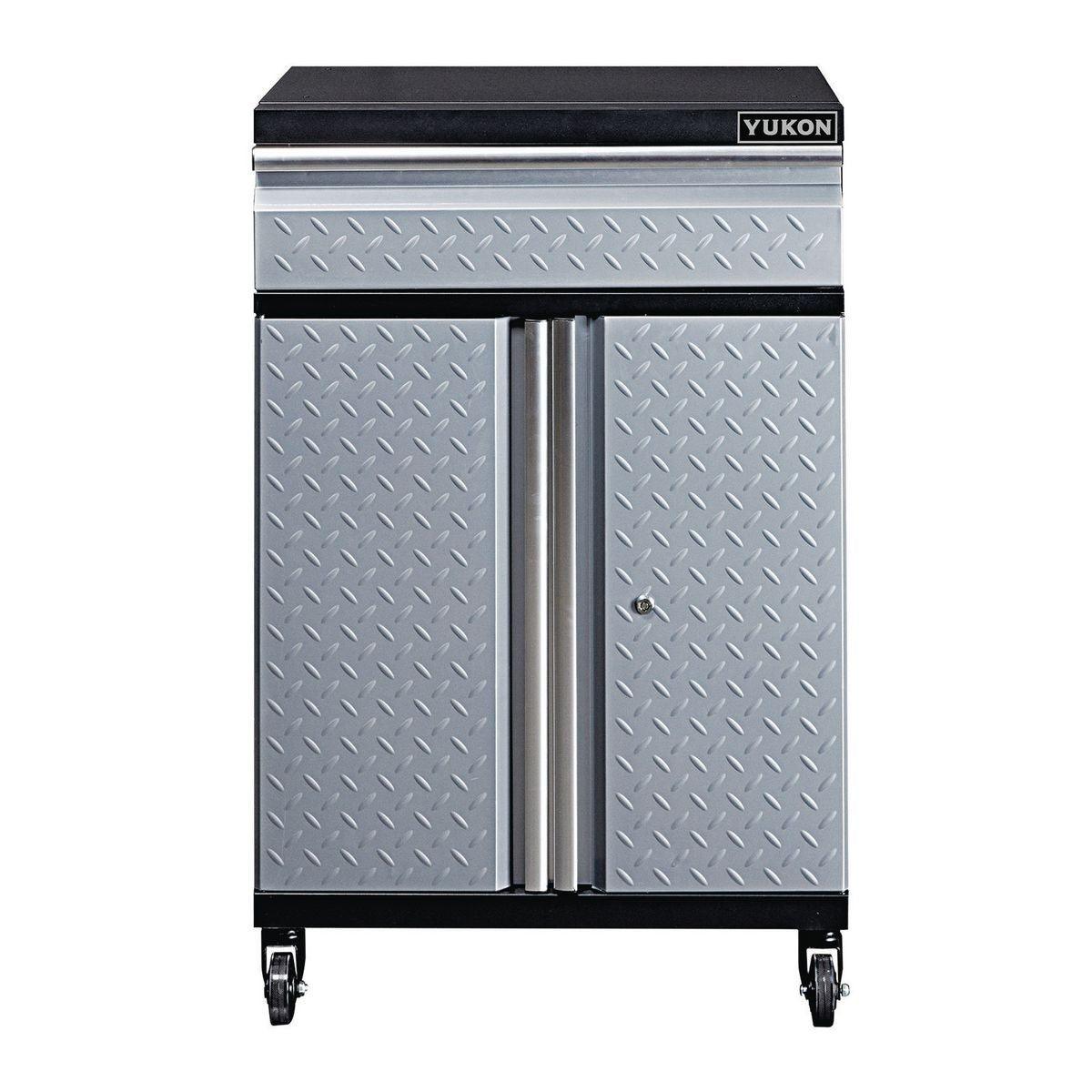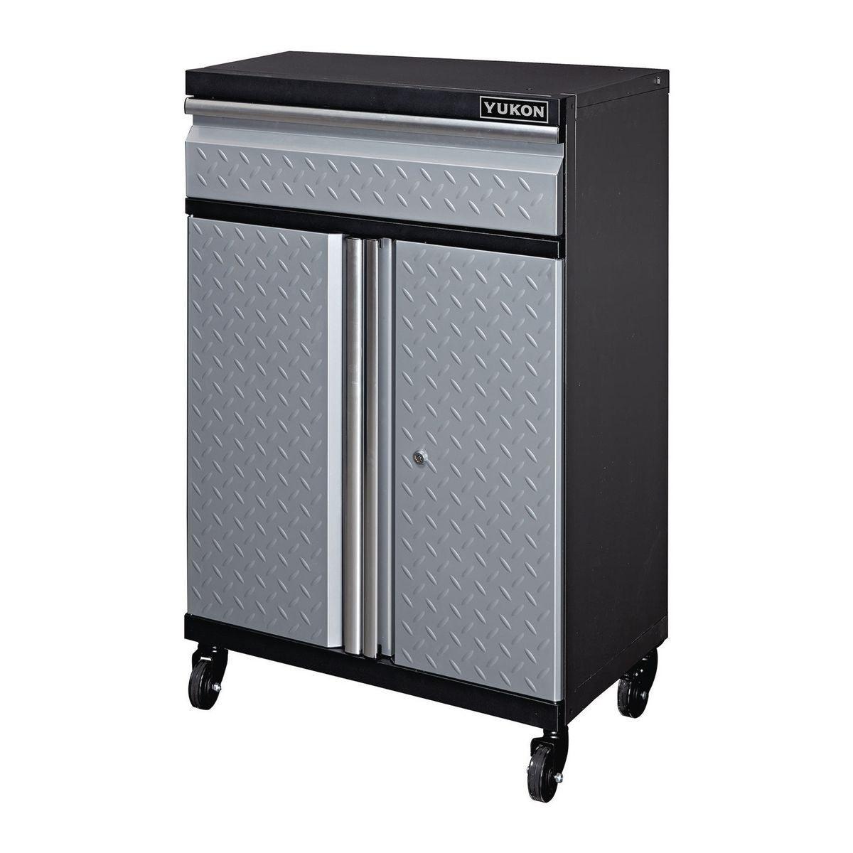 The Yukon® 27 in. Single Drawer Garage Cabinet with Casters is part of a complete shop storage system designed to organize and free up space in any area. Constructed from powder coated steel for a durable, smooth finish and diamond plate steel doors for a professional look. With four smooth-rolling, 360° swivel casters (two with locking brakes) and a weight capacity of 250 lbs. this garage cabinet offers generous storage space combined with convenience.