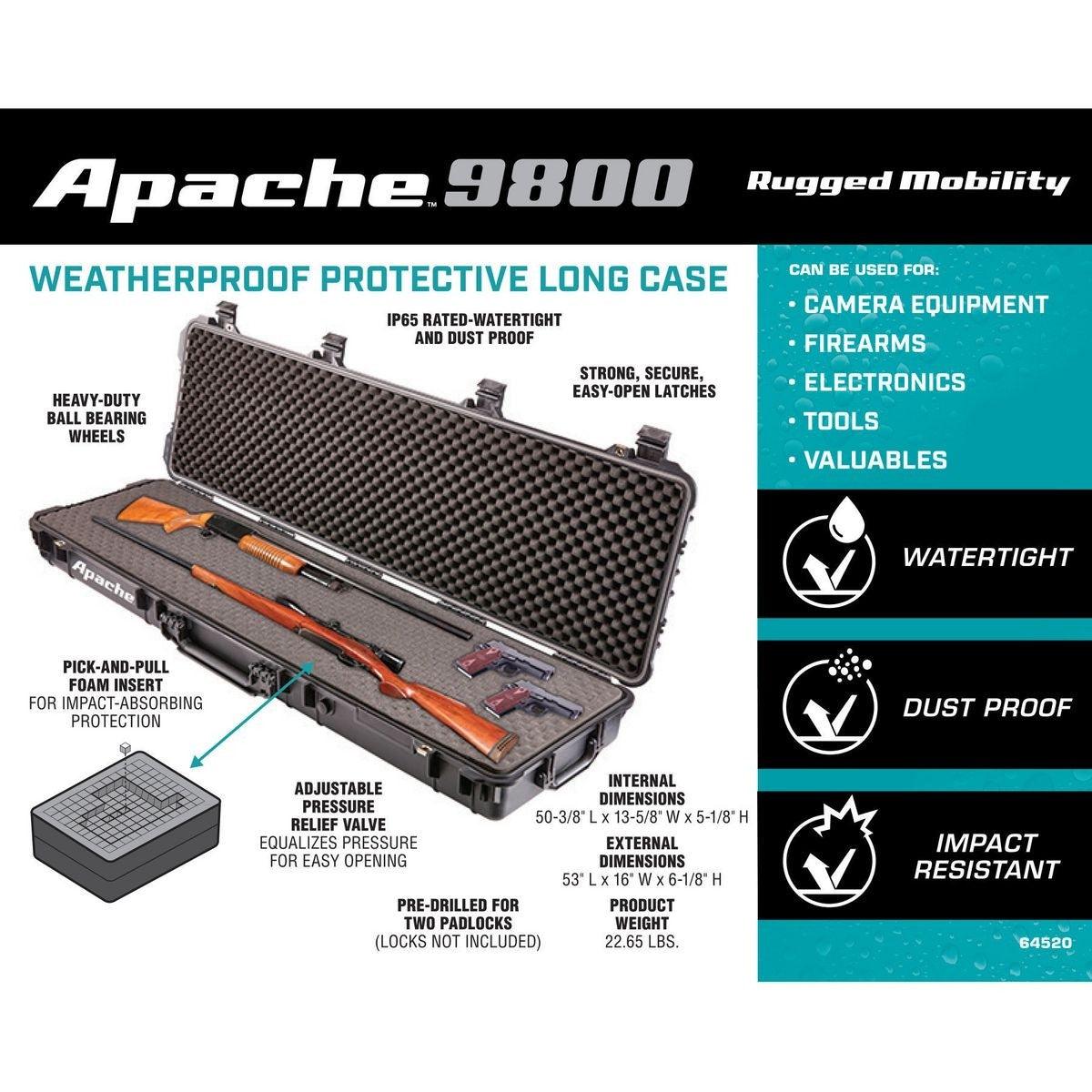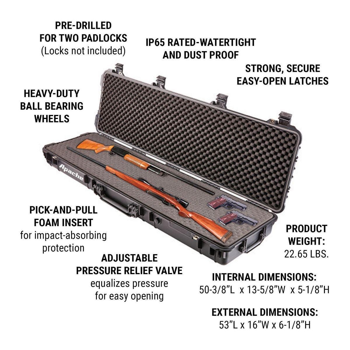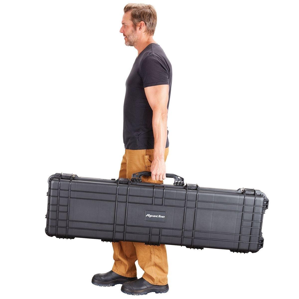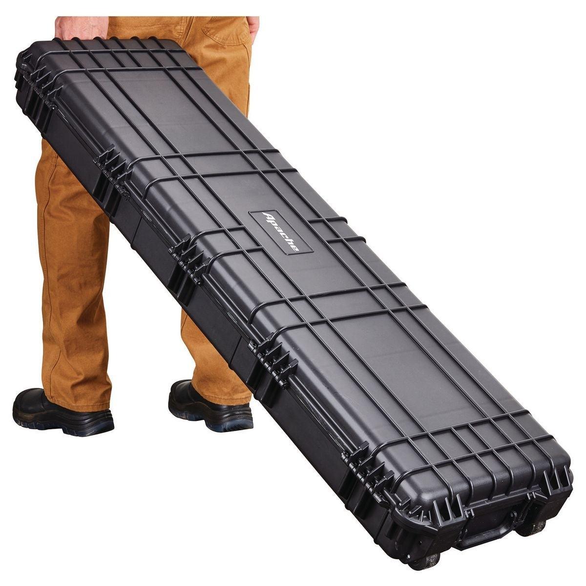 Protect rifles, shotguns, handguns and other specialized equipment with this exceptionally rugged Apache® weatherproof storage case. Constructed from extremely durable polypropylene, this professional quality hard case takes a beating while protecting the contents from impact, moisture and microscopic dust. The built-in purge valve equalizes pressure so you can open the case after changing elevations.