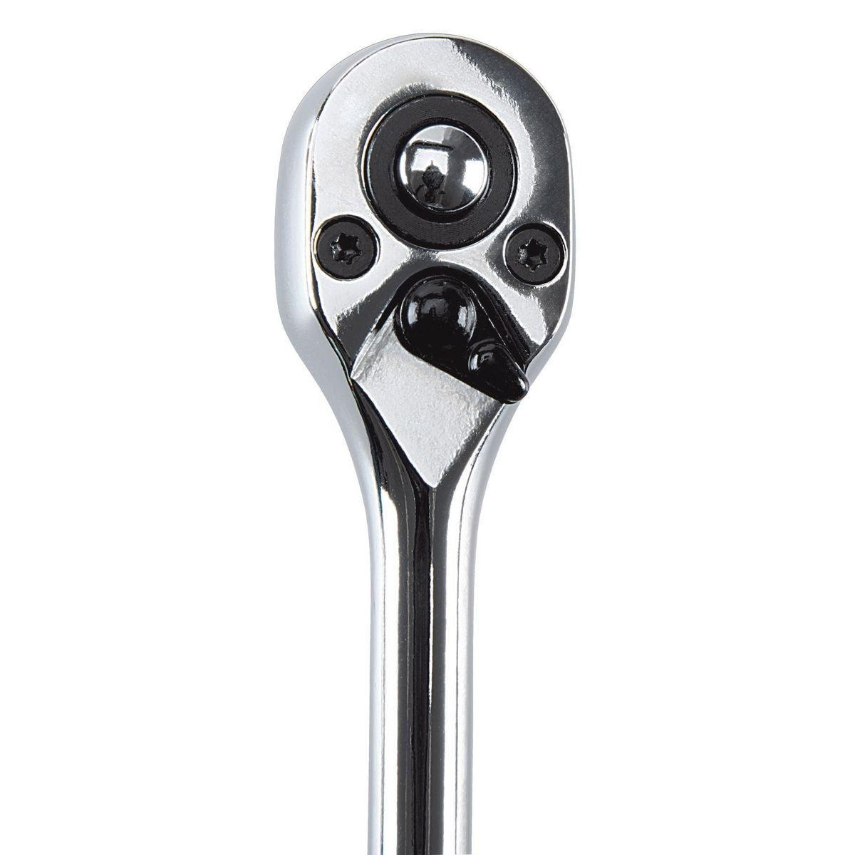 This high visibility 1/4 in. socket set features easy-to-read markings so you spend less time looking for the right socket and more on the task at hand. The rugged chrome vanadium SAE and metric set includes a quick-release ratchet with reversible 72-tooth gearing and a cushion grip to reduce hand fatigue. Triple chrome plating helps fight rust and corrosion.
