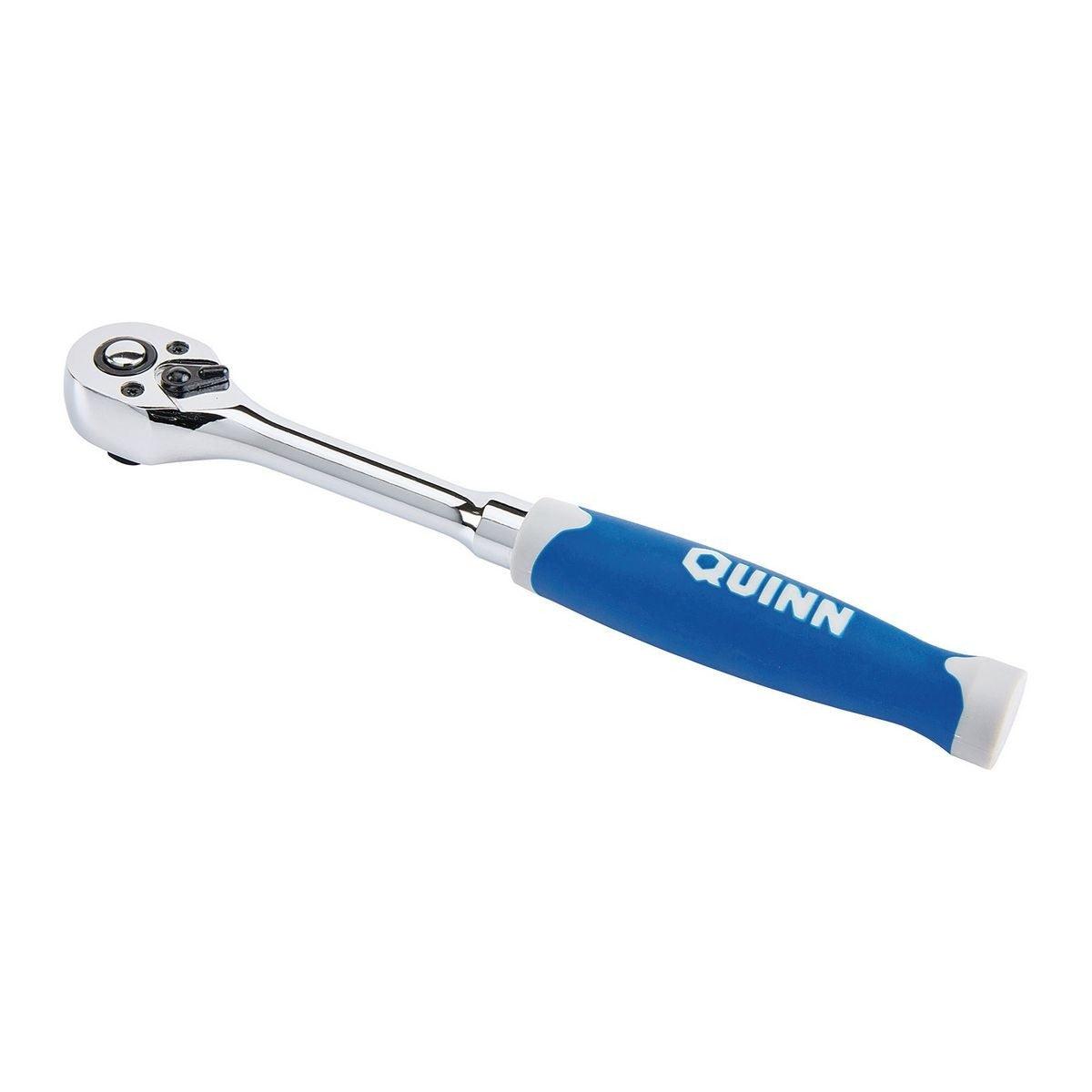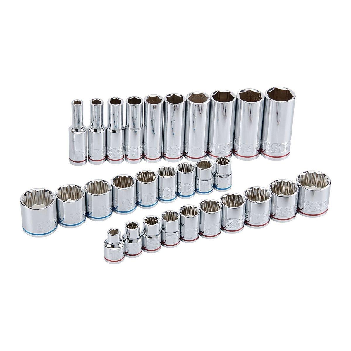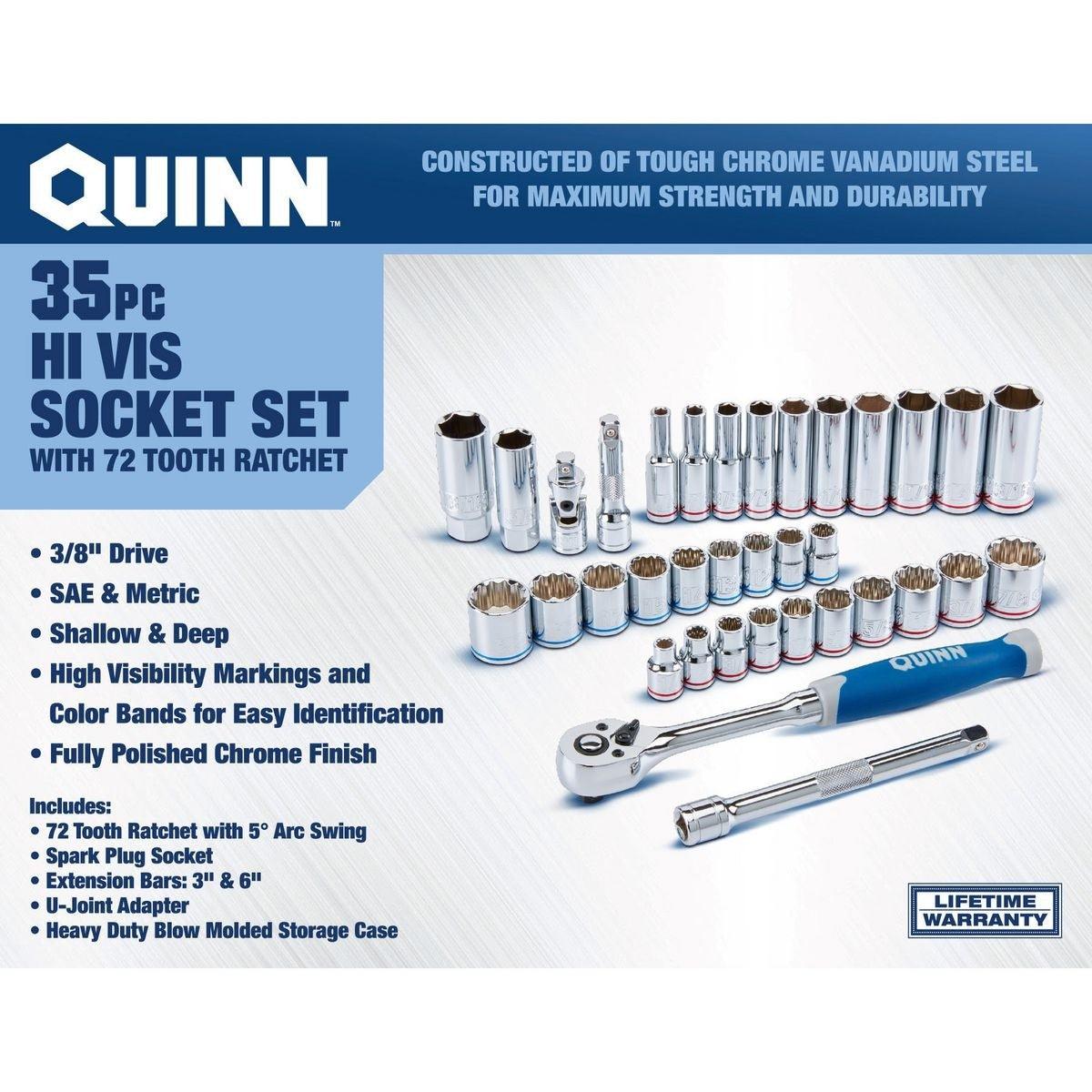 Constructed from durable chrome vanadium steel, this 35 Pc. socket set with 3/8 in. drive from Quinn® provides rugged strength and reliability. Featuring 72 tooth quick-release ratchet with 5° arc swing and comfort grip and color-coded sockets with high visibility markings for easy identification. Includes SAE and Metric sizes, heavy duty blow mold case and meets or exceeds ANSI specifications.