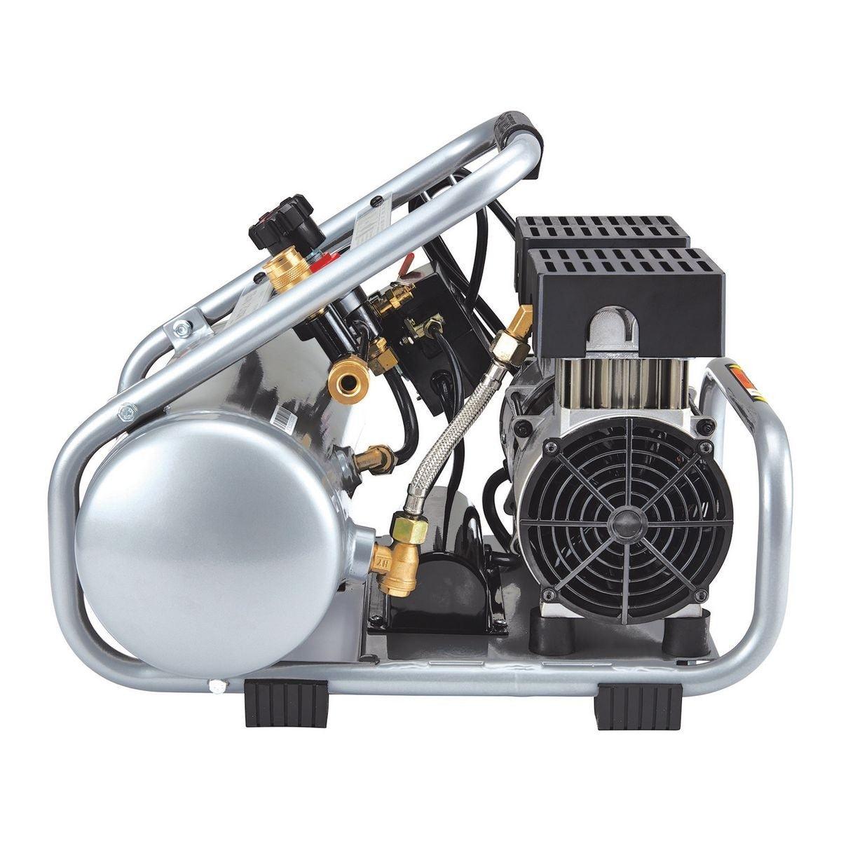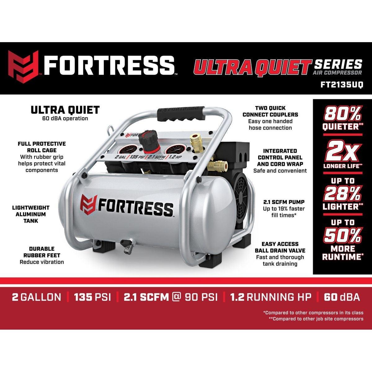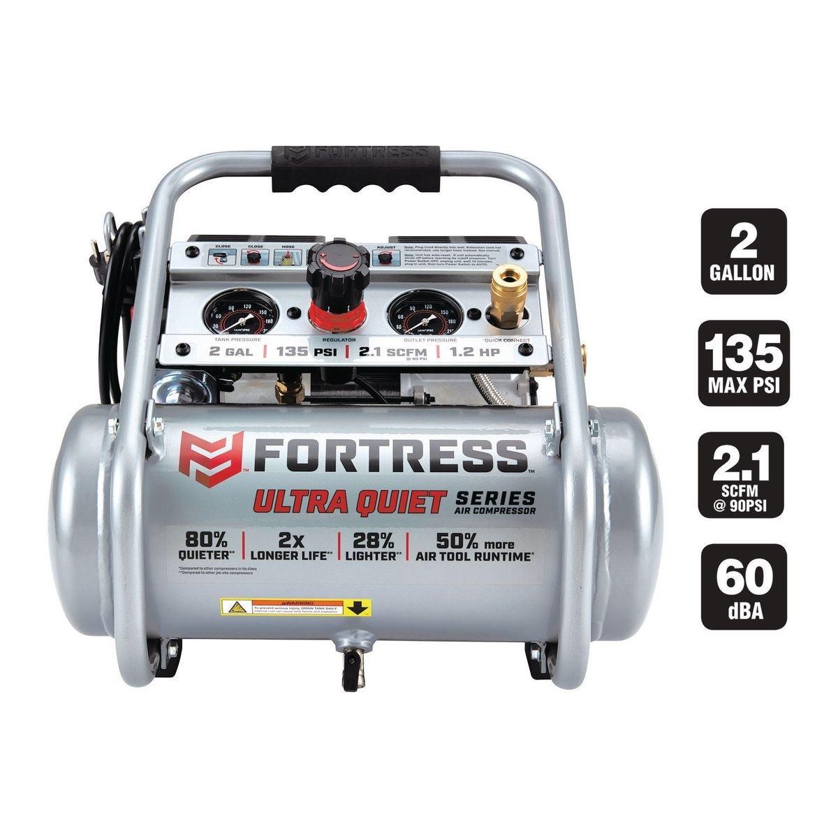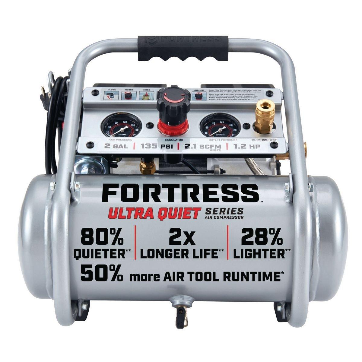 This Fortress ULTRA QUIET Series Air Compressor is 80% quieter and up to 28% lighter than other compressors in its class. This professional quality air compressor delivers up to 50% more runtime than similar jobsite compressors. The compressor has an integrated control panel with easy-to-read gauges and TWO built-in quick connect couplers for easy one-handed hose connection.