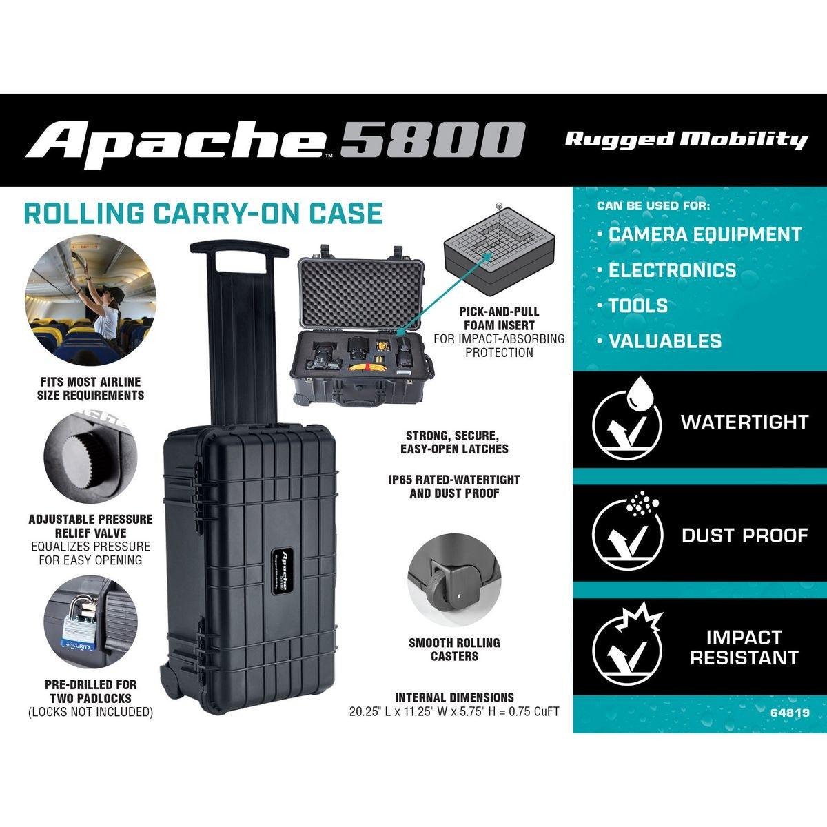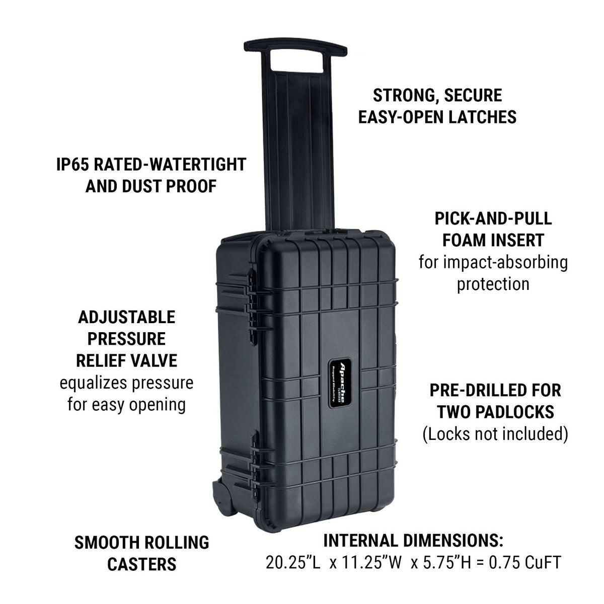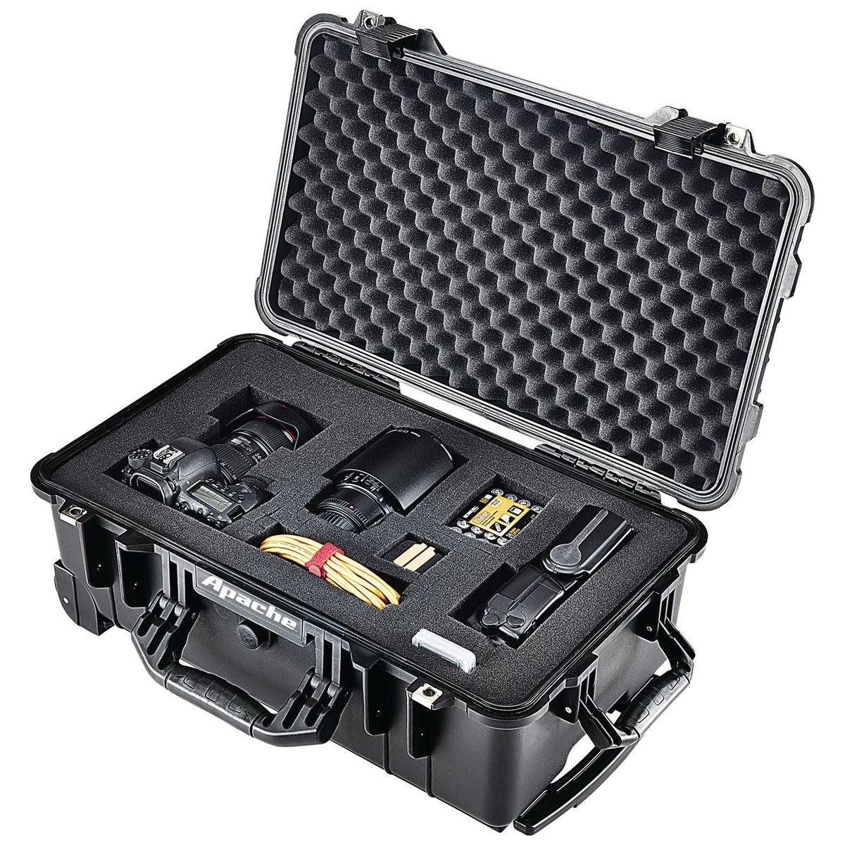 This rugged Apache® carry-on case is designed to fit most airline size requirements. Protect cameras, microphones, handguns and other specialized equipment with this exceptionally rugged weatherproof hard case. Constructed from extremely durable polypropylene, this professional quality case takes a beating while protecting the contents from impact, moisture and microscopic dust. The built-in purge valve equalizes pressure so you can open the case after changing elevations.