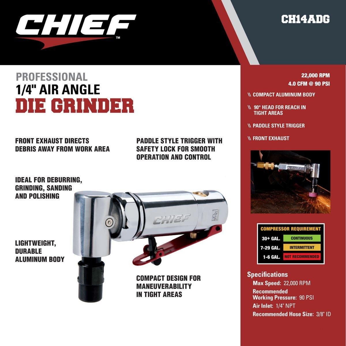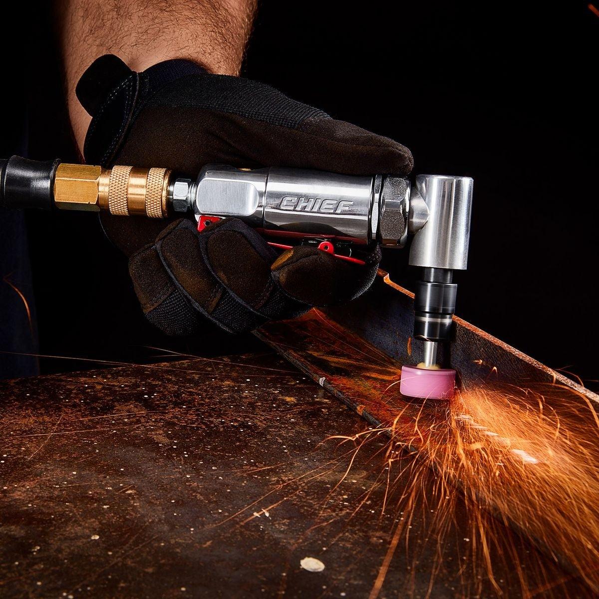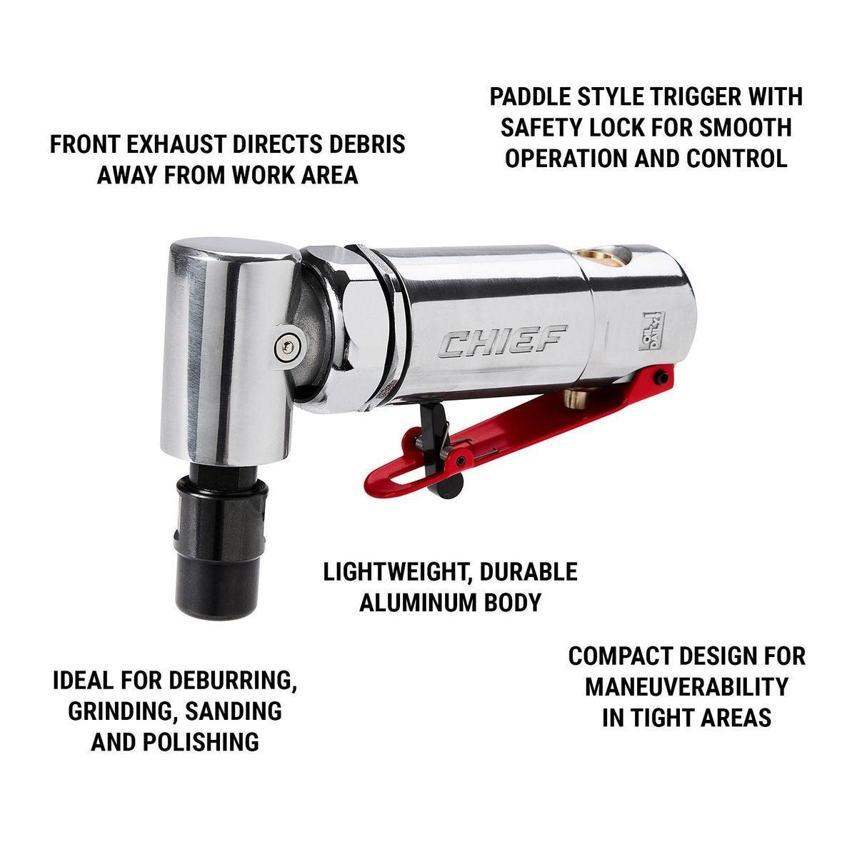 The Chief™ Professional Mini Air Angle Die Grinder has compact aluminum body and 90° angled head for reaching tight areas. The adjustable speed regulator makes this die grinder ideal for deburring, grinding, sanding and polishing a wide variety of materials. The front exhaust clears debris for a better view and operator safety.