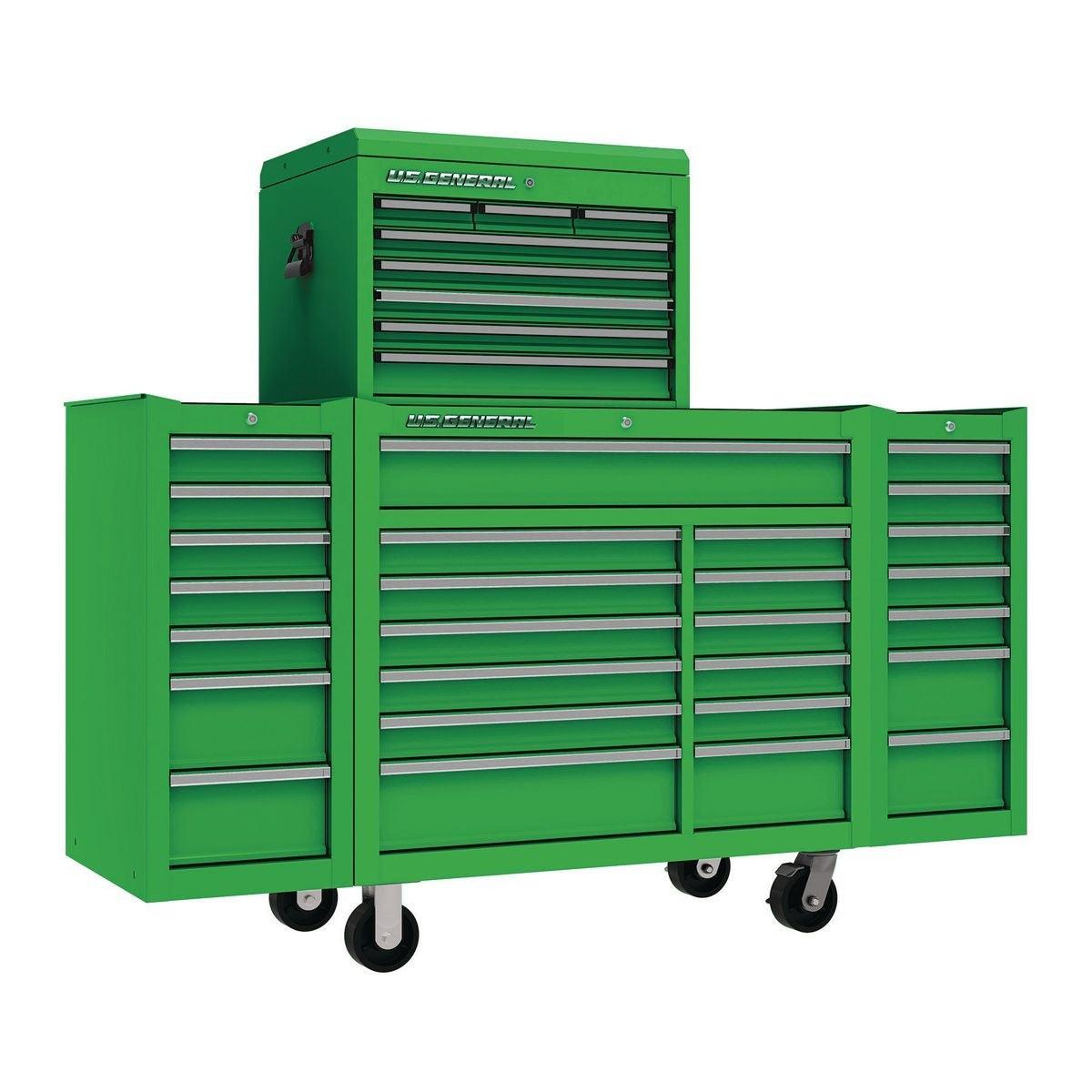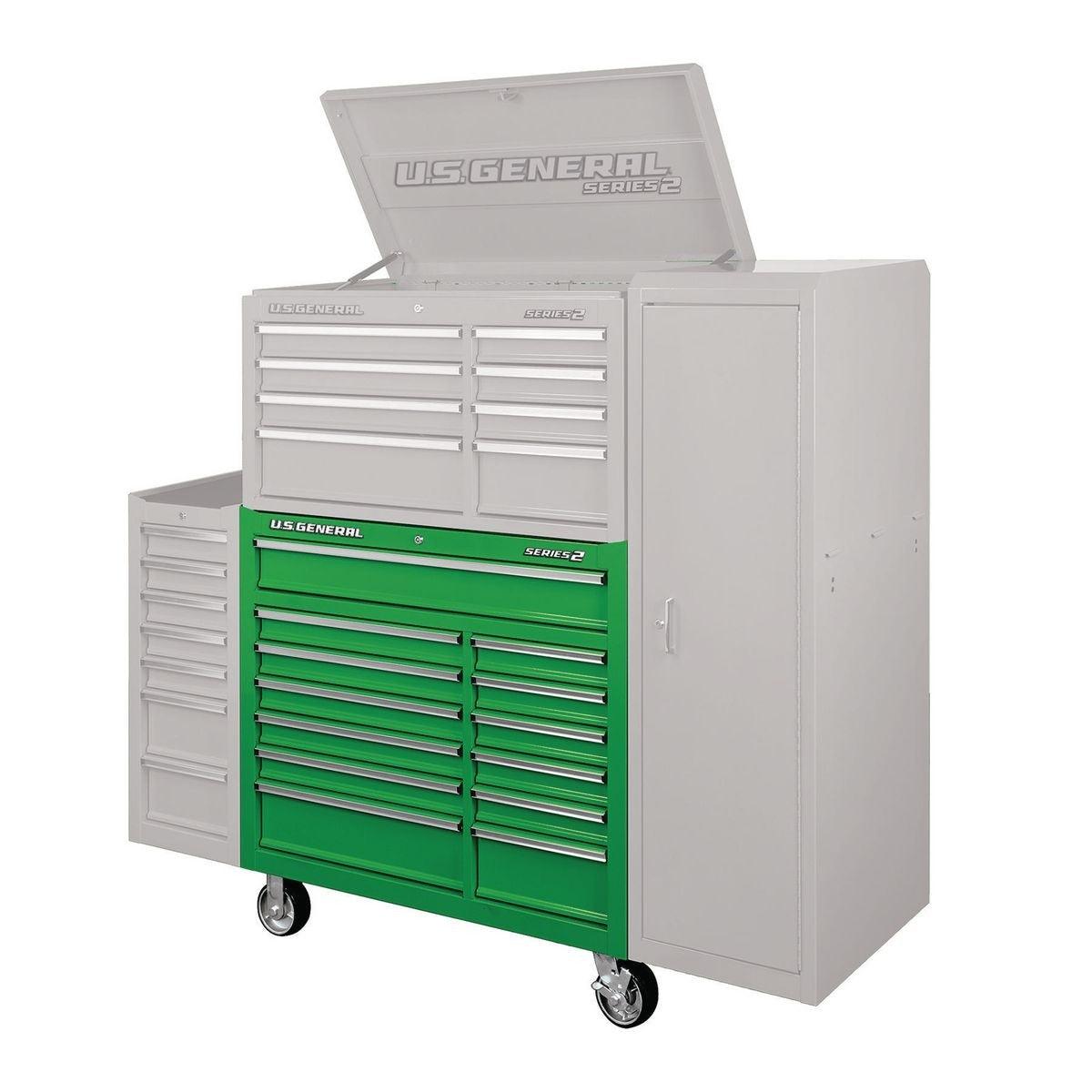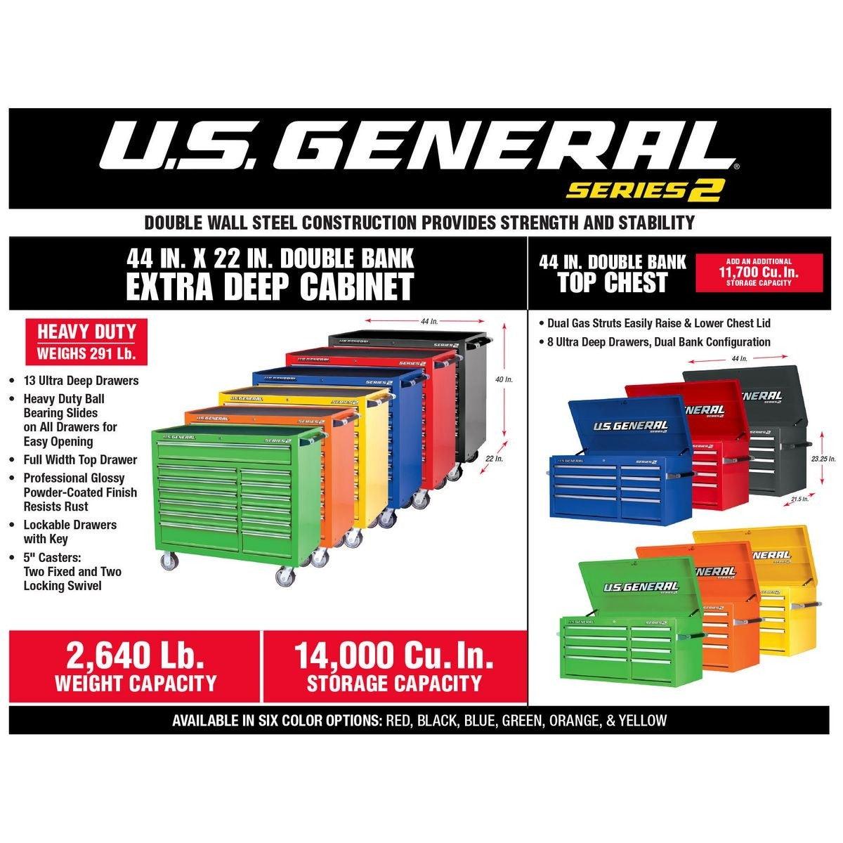 This 44 in. industrial grade roller cabinet was designed, tested, and built to last. This double bank unit has full extension drawer slides with double slides on the large drawers. With 14,000 cu. in. of storage available, the double bank drawer configuration with 13 drawers gives you the flexibility to organize a wide variety of tools with narrow, wide and extra-wide drawer options. The industrial powder coat finish is durable, easy to clean and looks great in any garage.