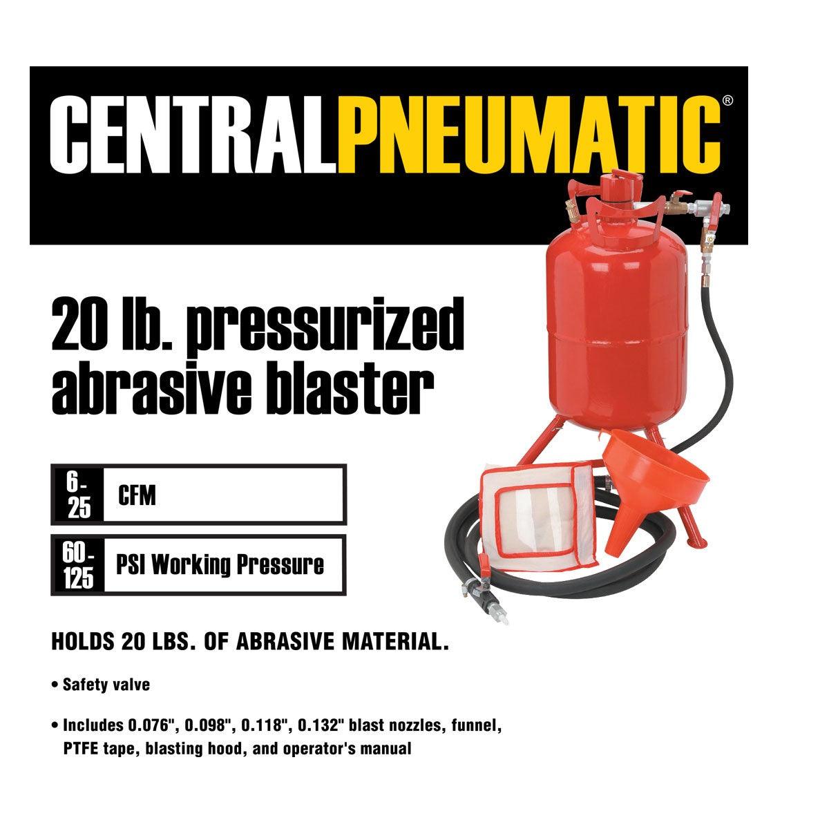 The pressurized design of this heavy duty abrasive blaster delivers 30% more blasting power than siphon units. This abrasive blaster holds 20 lbs. of abrasive material and is equipped with four different shut-off valve locations for adjusting media flow and a relief valve. This portable abrasive blaster is ideal for body paint and welding shops as well as your home garage!