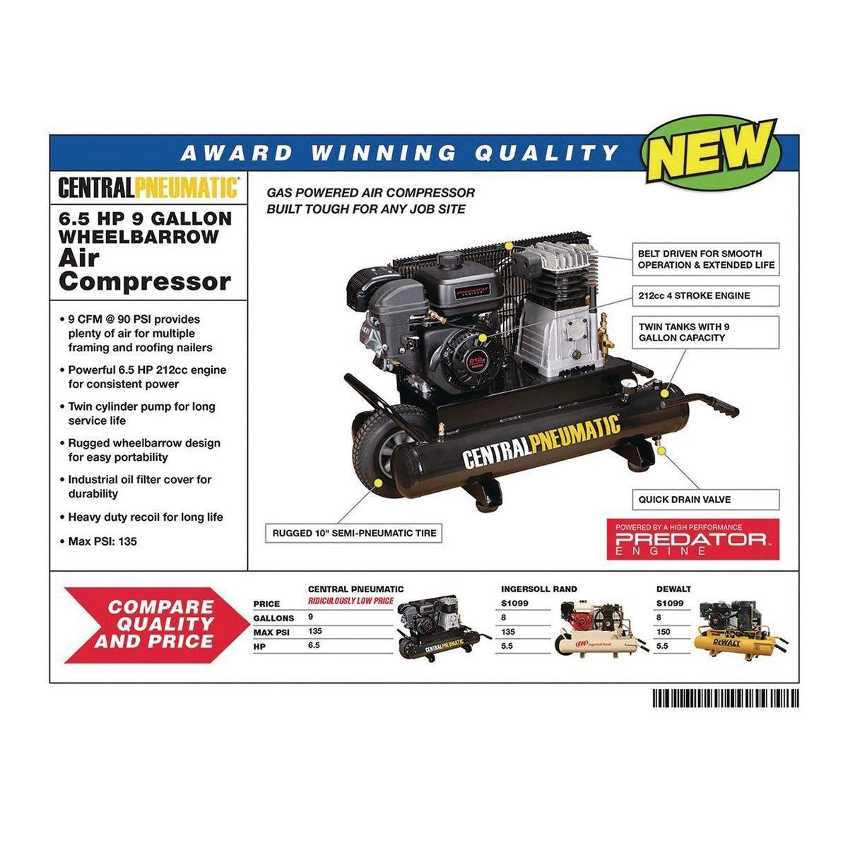 This powerful gas powered 135 PSI air compressor features a wheelbarrow design for easy transport to and from the job site. Twin tanks deliver more consistent line pressure and reduce the amount of moisture in the line. This air compressor also includes an enclosed belt guard that cools the pump and allows for better performance and a longer service life.