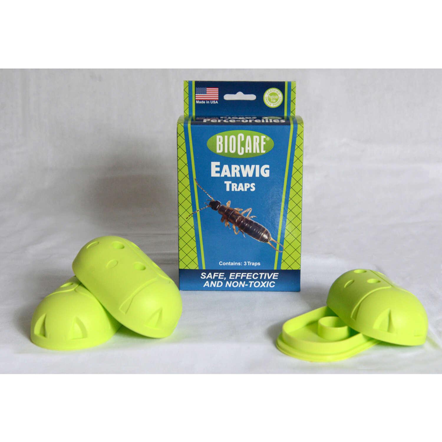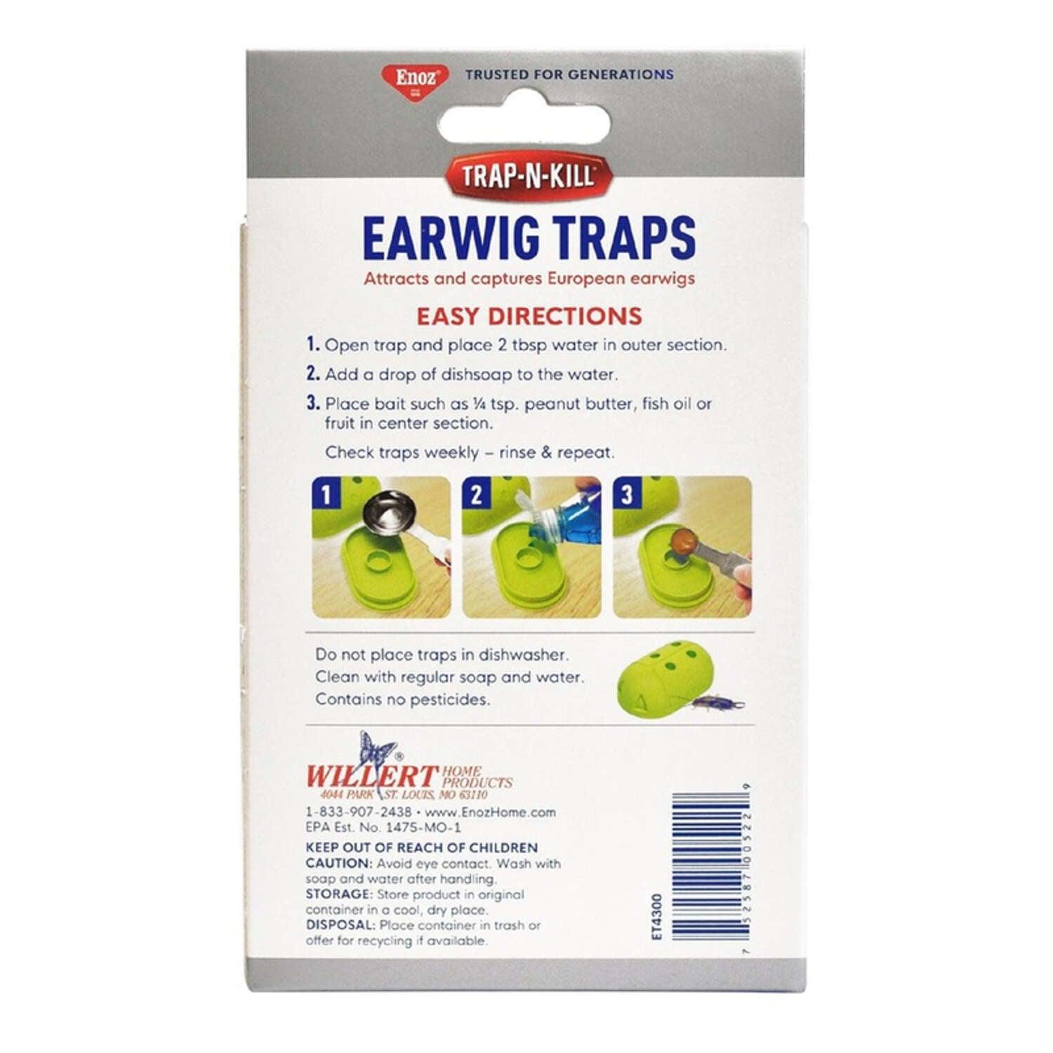The Enoz Trap-N-Kill Earwig Traps attract and capture European earwigs. Earwigs feast on other insects, plants, ripe fruit and garbage. They are attracted to warm, damp areas which this trap imitates. With the use of a bait and water, this device creates the perfect trap to kill earwigs.
