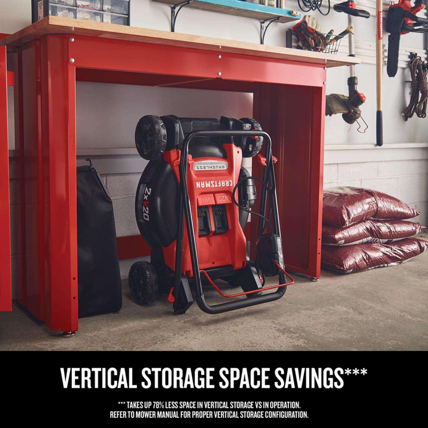 Get long runtime with the V20 2x20V 20 in. Brushless Cordless Push Mower. This battery-powered push mower features a powerful brushless motor and is equipped with two 5.0Ah batteries, allowing the mower to perform up to 50 minutes of runtime. The low-profile design provides easy access to hard-to-reach areas and takes up 78% less space with vertical space savings. The V20 battery platform is compatible with CRAFTSMAN V20 Outdoor Equipment and Power Tools. You'll find the complete line of outdoor tools and equipment essentials for a job to make you proud.