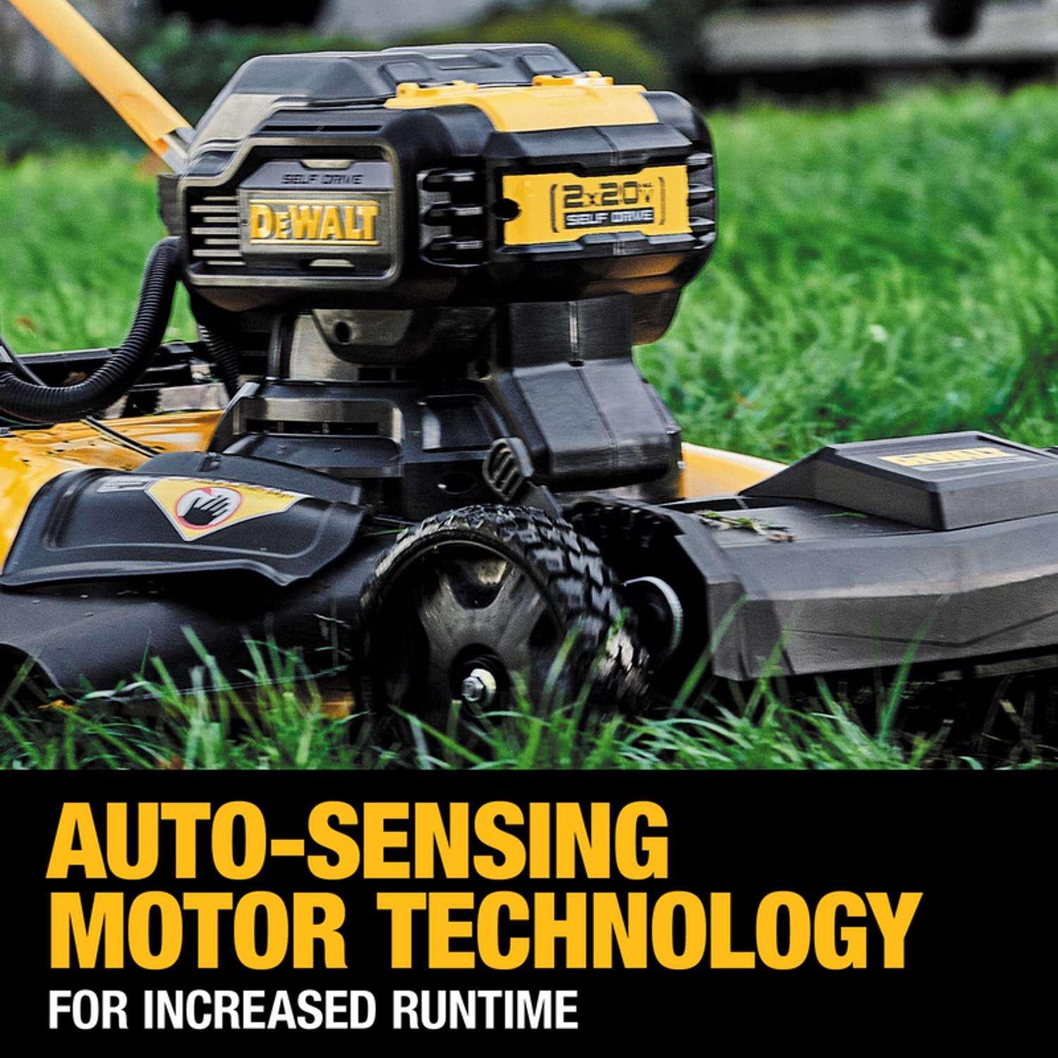 Featuring a brushless, direct drive motor that delivers up to 60 minutes of runtime in one charge, this self-propelled lawn mower has the power you need to get the job done. Innovative, auto-sensing technology achieves higher rpm so you can cut thicker grass whether you are mulching, bagging or using the side discharge. With a fold-over handle for convenient transport and integrated vertical storage, this cordless mower takes up 70% less space in your garage than it does when in operation. Count on the DeWalt FWD Self-Propelled Lawn Mower to deliver the power needed to tackle your lawn in comfort.