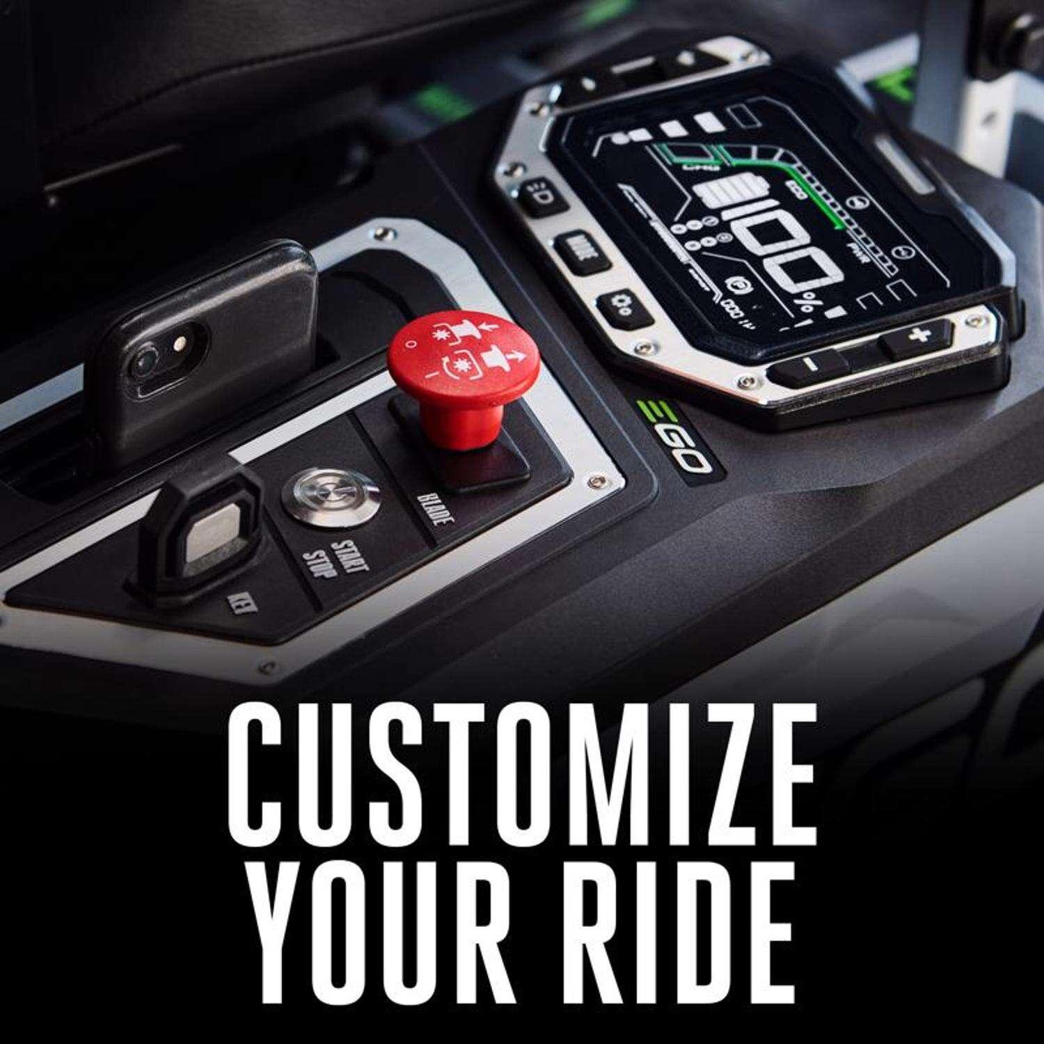 The EGO POWER+ 52" Z6 Zero Turn Riding Mower is a ZTR like nothing else out there. Featuring Peak Power + technology, it combines the power of up to 6 EGO 56V ARC Lithium Batteries - the same battery technology powering all EGO products, making it the World's First Platform Compatible Rider. Engineered with 5 independent brushless motors to deliver 25 horsepower, equivalent to a gas engine, in cutting and driving power. Built with a 52” 10-gauge fabricated steel deck and reaching a top speed of 8 MPH, this new ZTR allows you to cover more ground, faster. Cut up to 4-acres on a single charge with six included EGO 12.0Ah 56V ARC Lithium batteries. Go even further by adding more batteries to cut 5, 6, 7 or as many acres as needed – unlike any other battery-powered ZTR in the market. The Industry's Fastest Charger fully charges 6 x 12.0Ah in just 4 hours, up to 4x faster than competitors. The adjustable seat suspension guarantees a smooth ride. Customize the mowing experience with an LCD interface featuring 3 driving modes: Control, Standard, and Sport - that can be accessed with the simple touch of a finger. Premium features like LED lights, USB charging port and Bluetooth come standard to make the experience unlike any other ZTR. Built for durability – the mower, batteries and charger are all backed by a 5 year warranty. Experience zero-turn mowing like never before with the all-new EGO Power+ 52" Z6 Zero Turn Riding Mower - Power Like No Other.