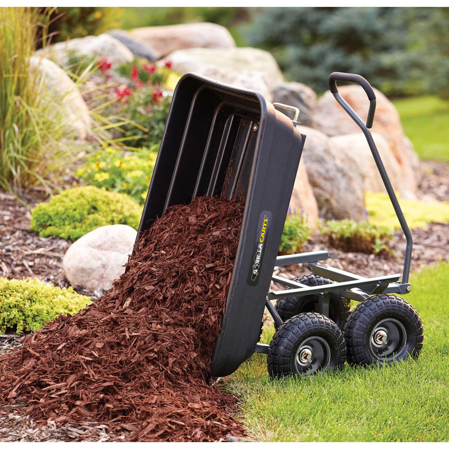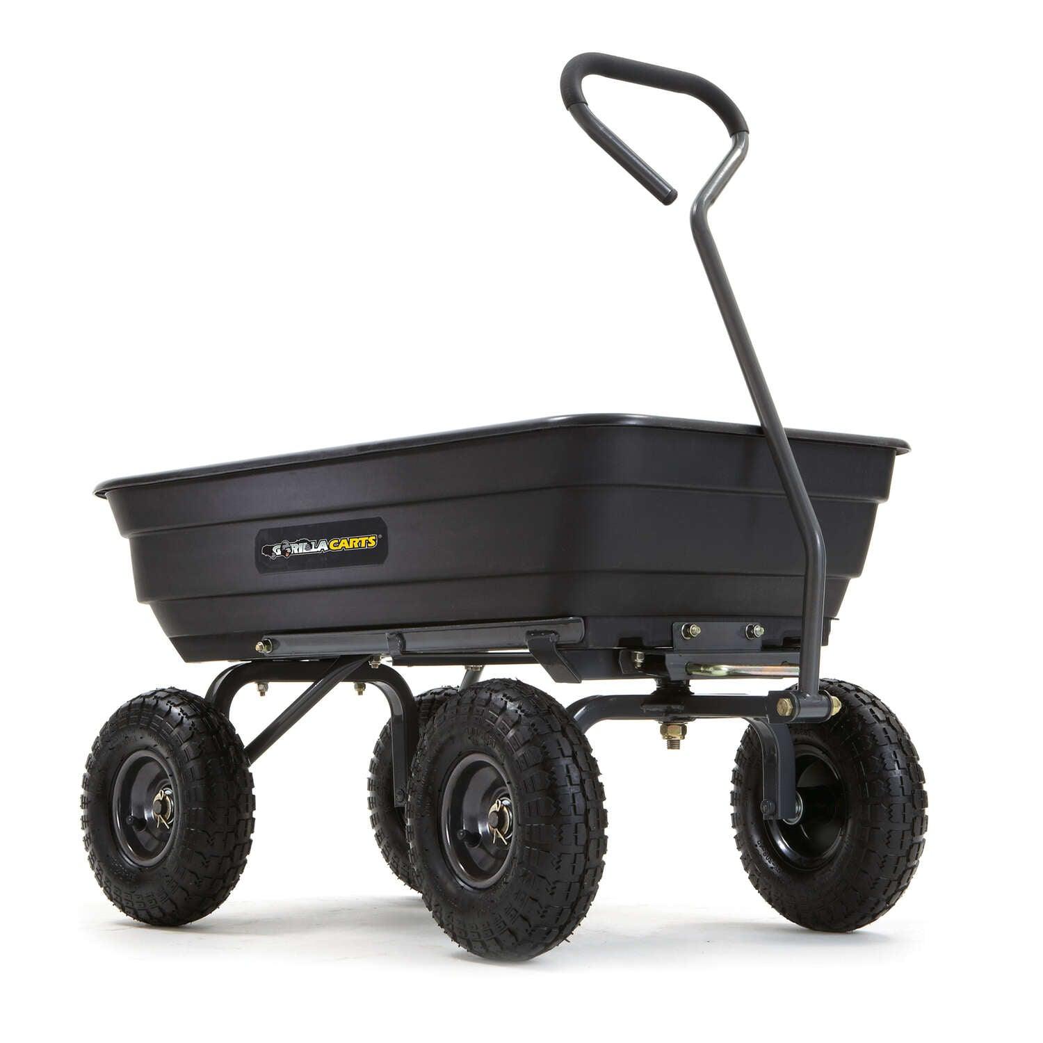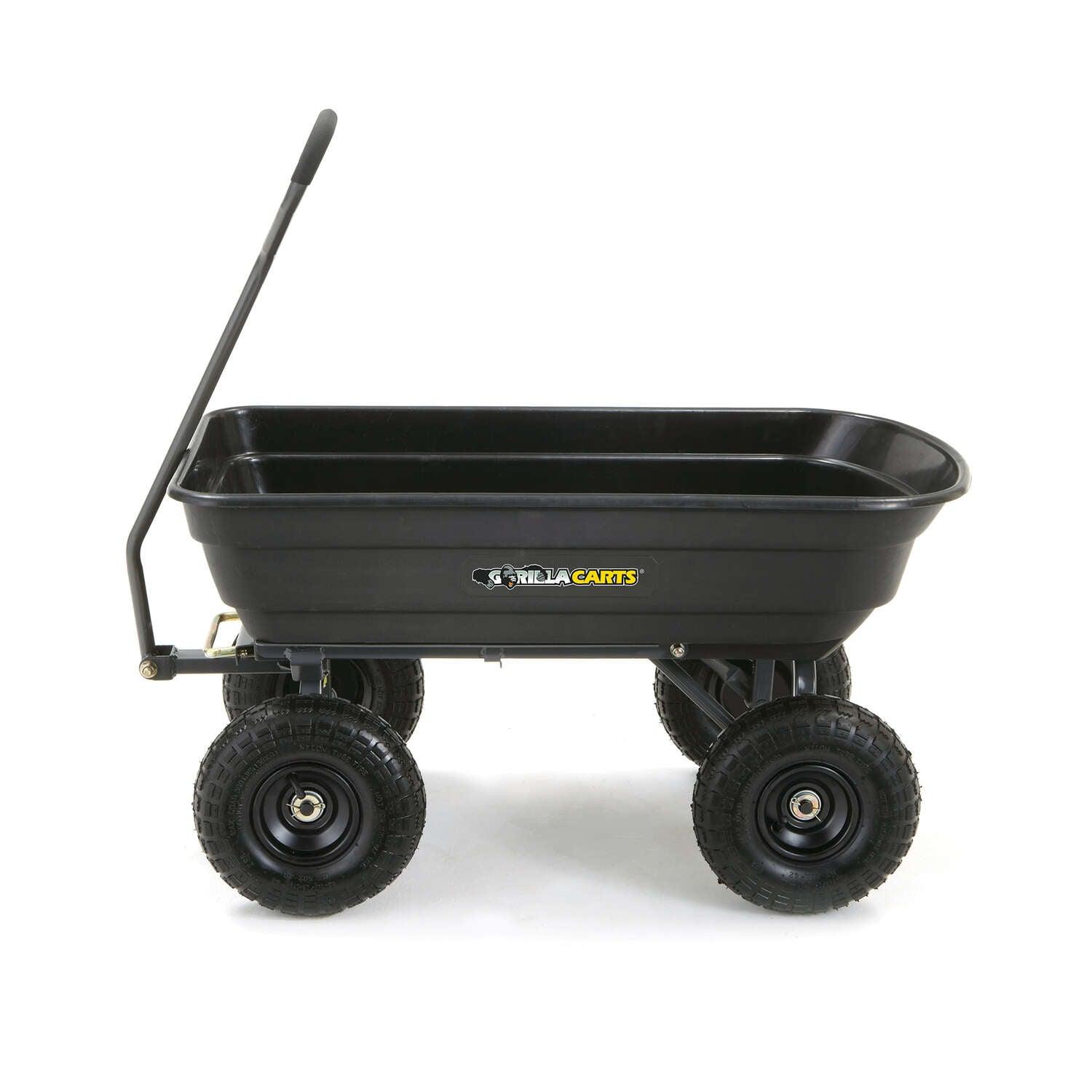 Complete your yard and landscaping projects with ease with this Gorilla Carts 3 cubic feet yard cart. Its 600 lbs. weight capacity allows you to haul large quantities of firewood, soil, rocks and more and the balanced dumping provides quick unloading. The durable, molded poly bed will not rust and the pneumatic tires can easily navigate over any terrain, providing added versatility for your landscaping needs.