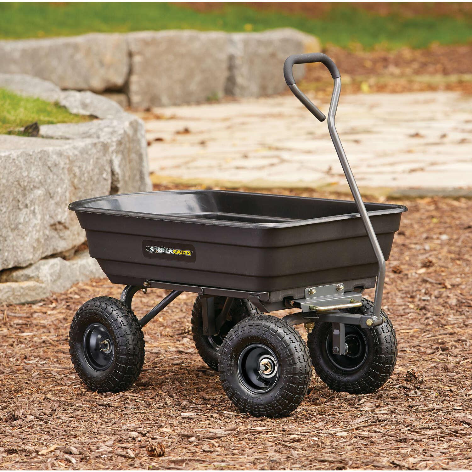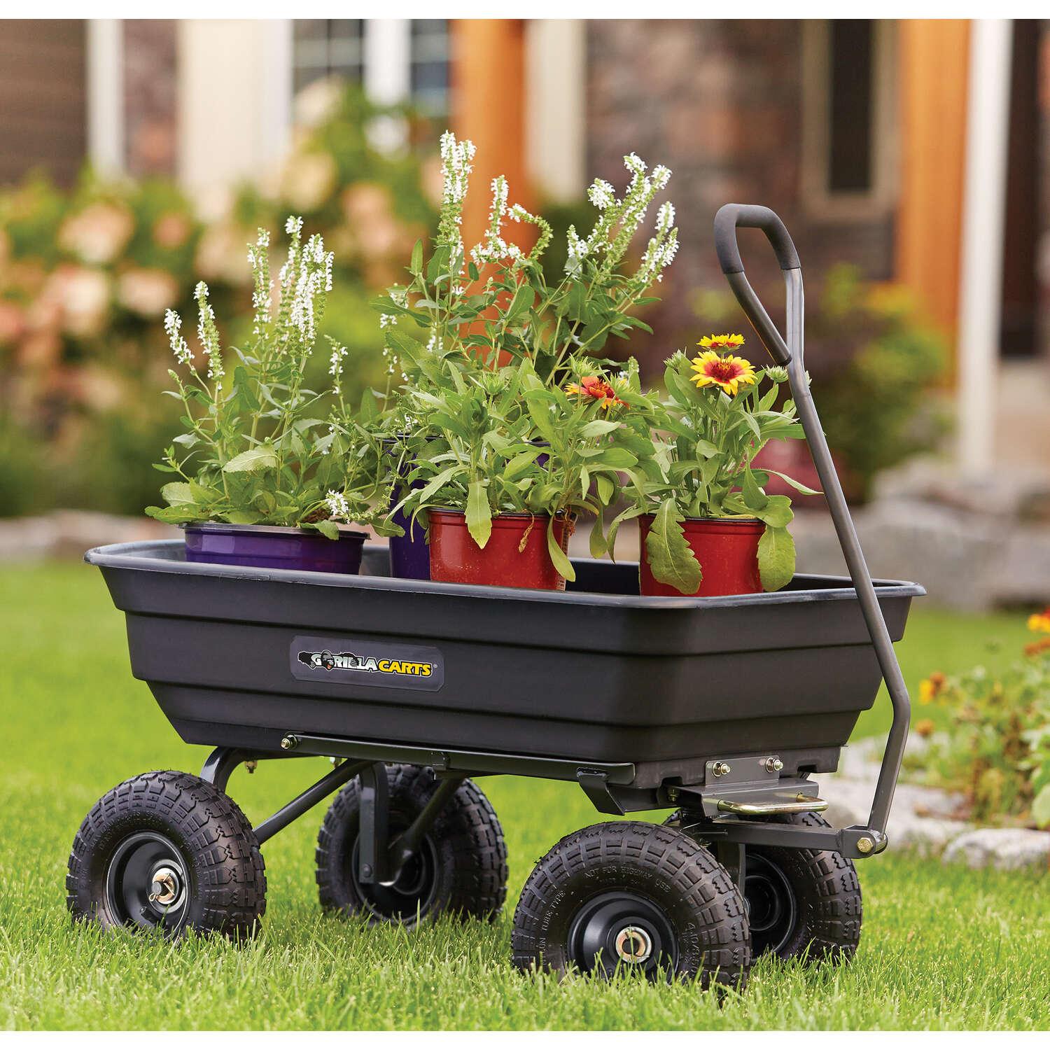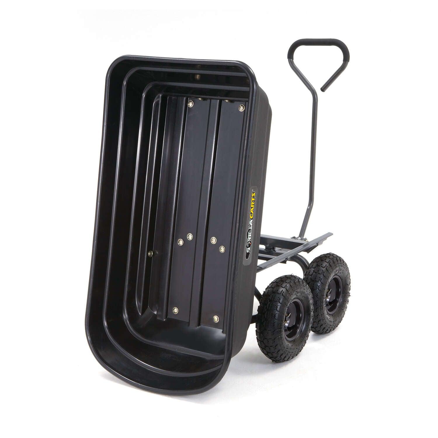 Complete your yard and landscaping projects with ease with this Gorilla Carts 3 cubic feet yard cart. Its 600 lbs. weight capacity allows you to haul large quantities of firewood, soil, rocks and more and the balanced dumping provides quick unloading. The durable, molded poly bed will not rust and the pneumatic tires can easily navigate over any terrain, providing added versatility for your landscaping needs.