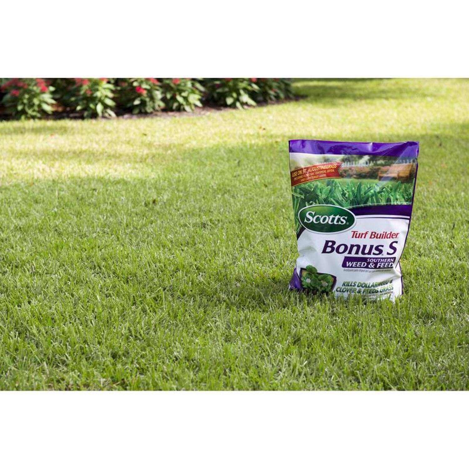 Scotts Turf Builder Bonus S Southern Weed and Feed2 will not only kill weeds, but also thicken your lawn to help crowd out future weeds. Regular feedings provide the nutrients your lawn needs to look its best and withstand the stresses of heat, drought and family activity. Bonus S may be used on St. Augustinegrass (including Floratam), centipede, zoysia and carpetgrass lawns. Apply when grass and weeds are actively growing. Available in TX, FL (except Panhandle region), LA, AL, GA, MS, NC and SC.