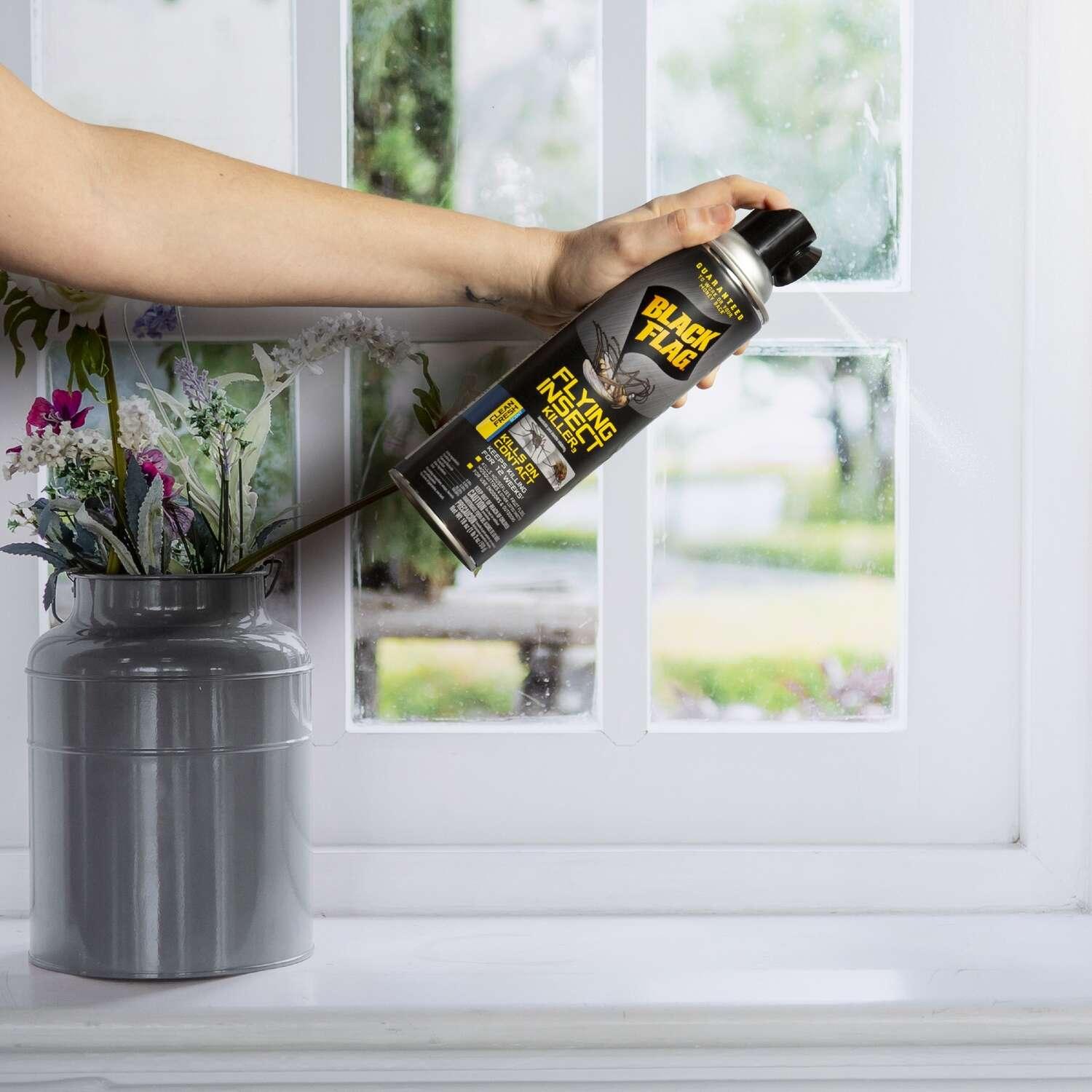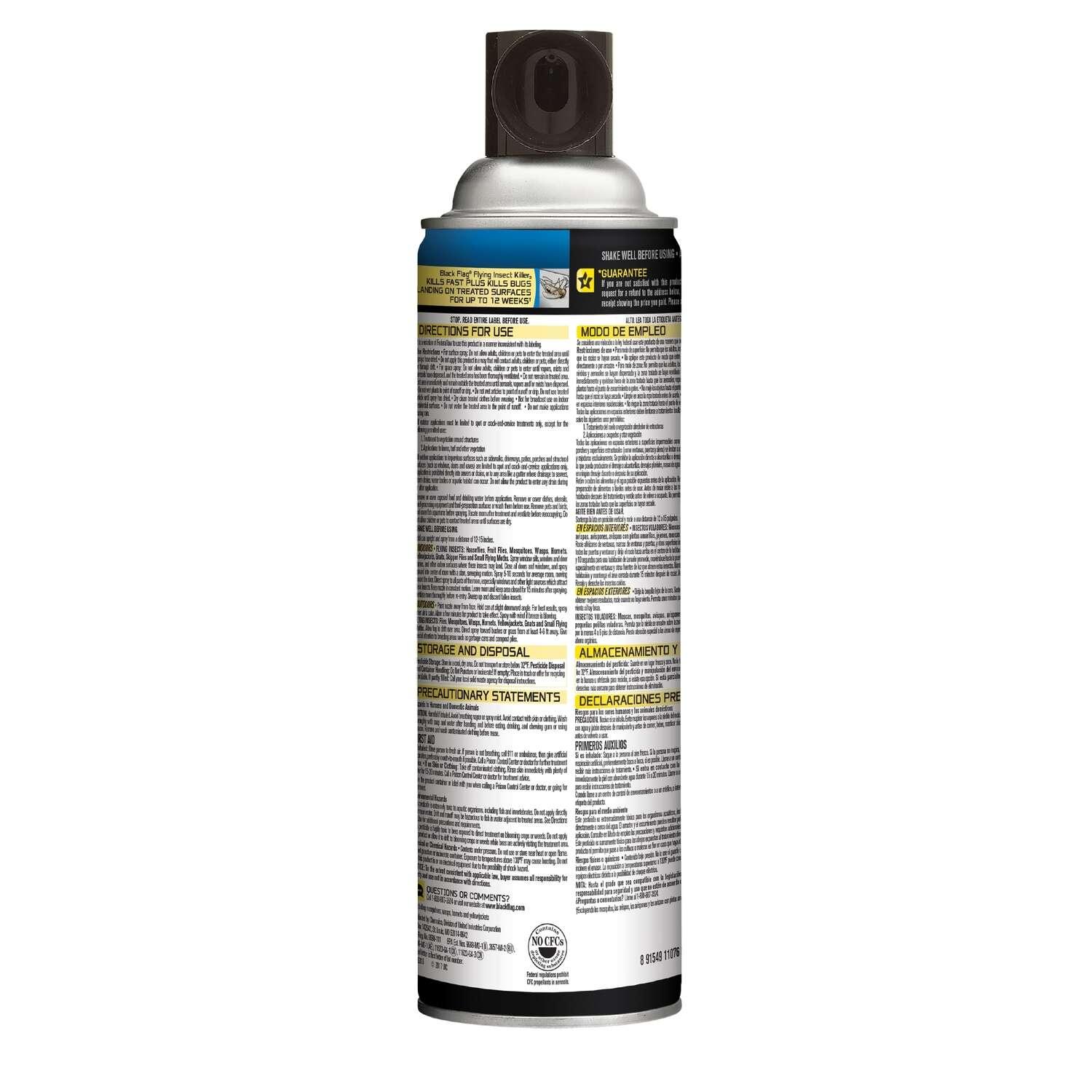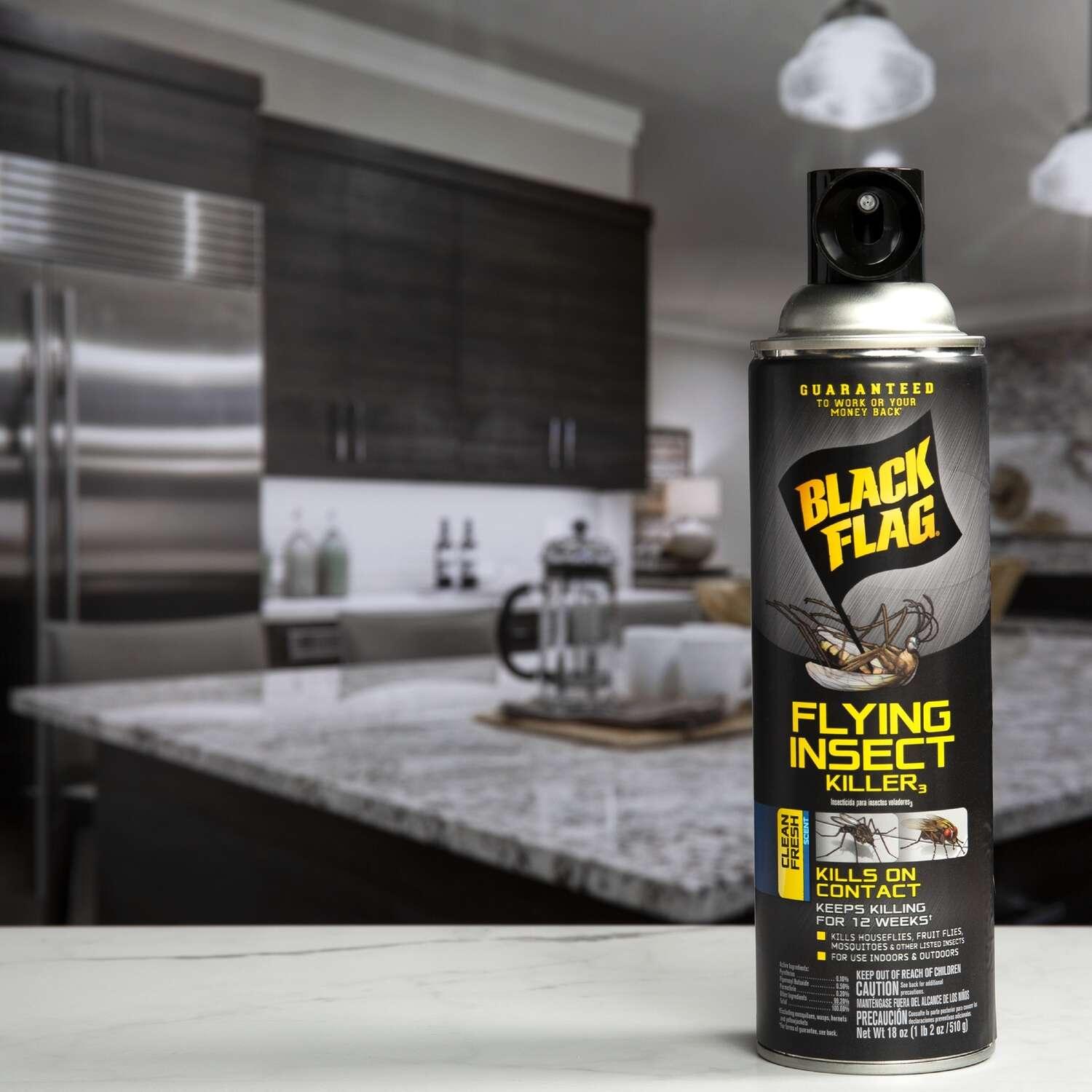 Black Flag Flying Insect Killer kills fast – plus, it kills bugs landing on treated surfaces up to 12 weeks (excluding mosquitoes, wasps, hornets and yellowjackets). This formula is effective against houseflies, fruit flies, mosquitoes, wasps, hornets, yellowjackets, gnats, skipper flies and small flying moths and can be used both indoors and outdoors. Contains a clean, fresh scent. Indoors, use as a surface spray on window sills, window and door frames and other indoor surfaces where listed insects may land. You may also use as a space spray: Close all doors and windows, and spray upward into the center of the room with a slow, sweeping motion. For an average room, spray 5 to 10 seconds, moving toward the door. Outdoors, allow the fog to drift over the treatment area. Direct the spray toward bushes or grass from at least 4 to 6 ft away. Pay special attention to breeding areas, like garbage cans and compost piles. For best results, spray when the air is calm and allow a few minutes for the product to take effect.