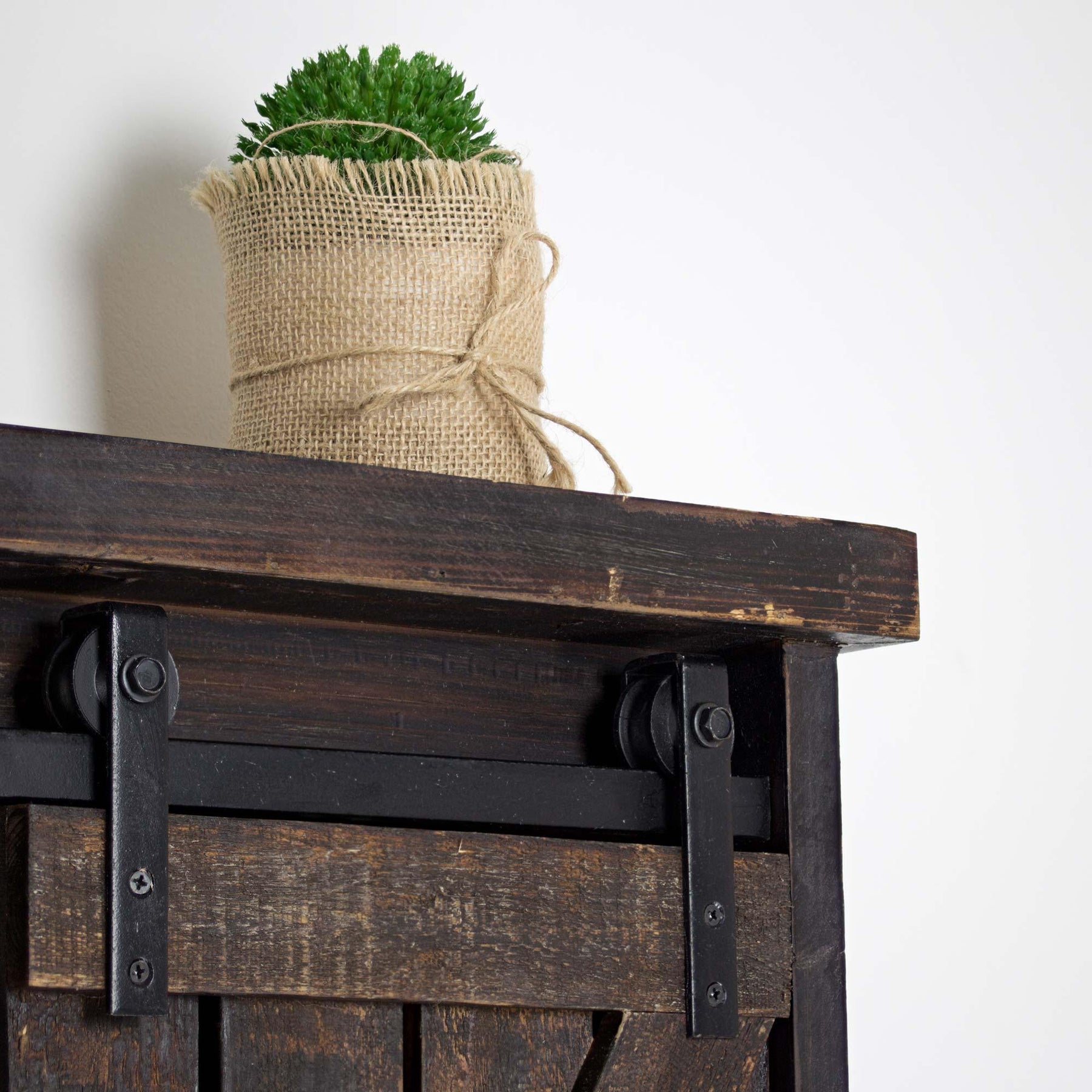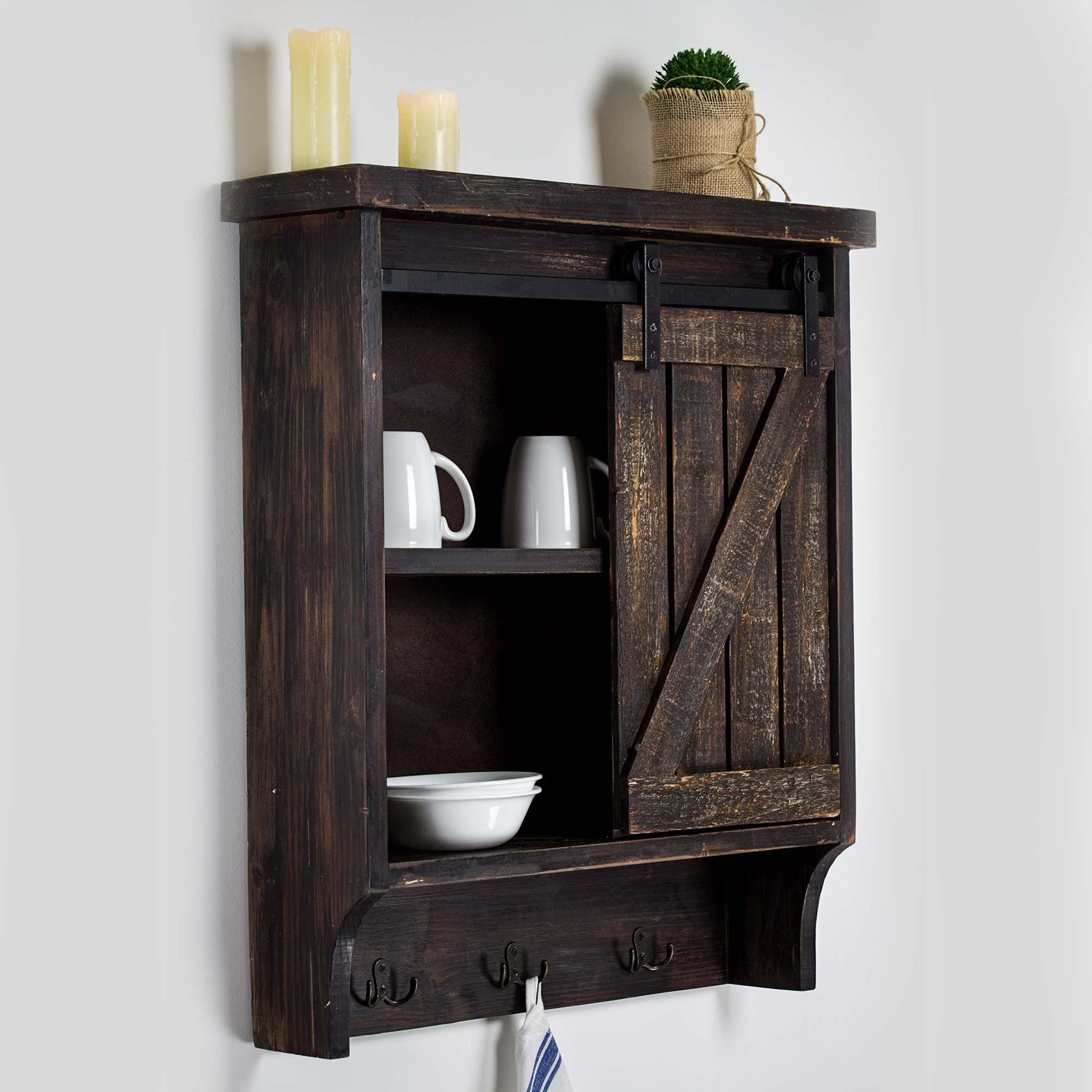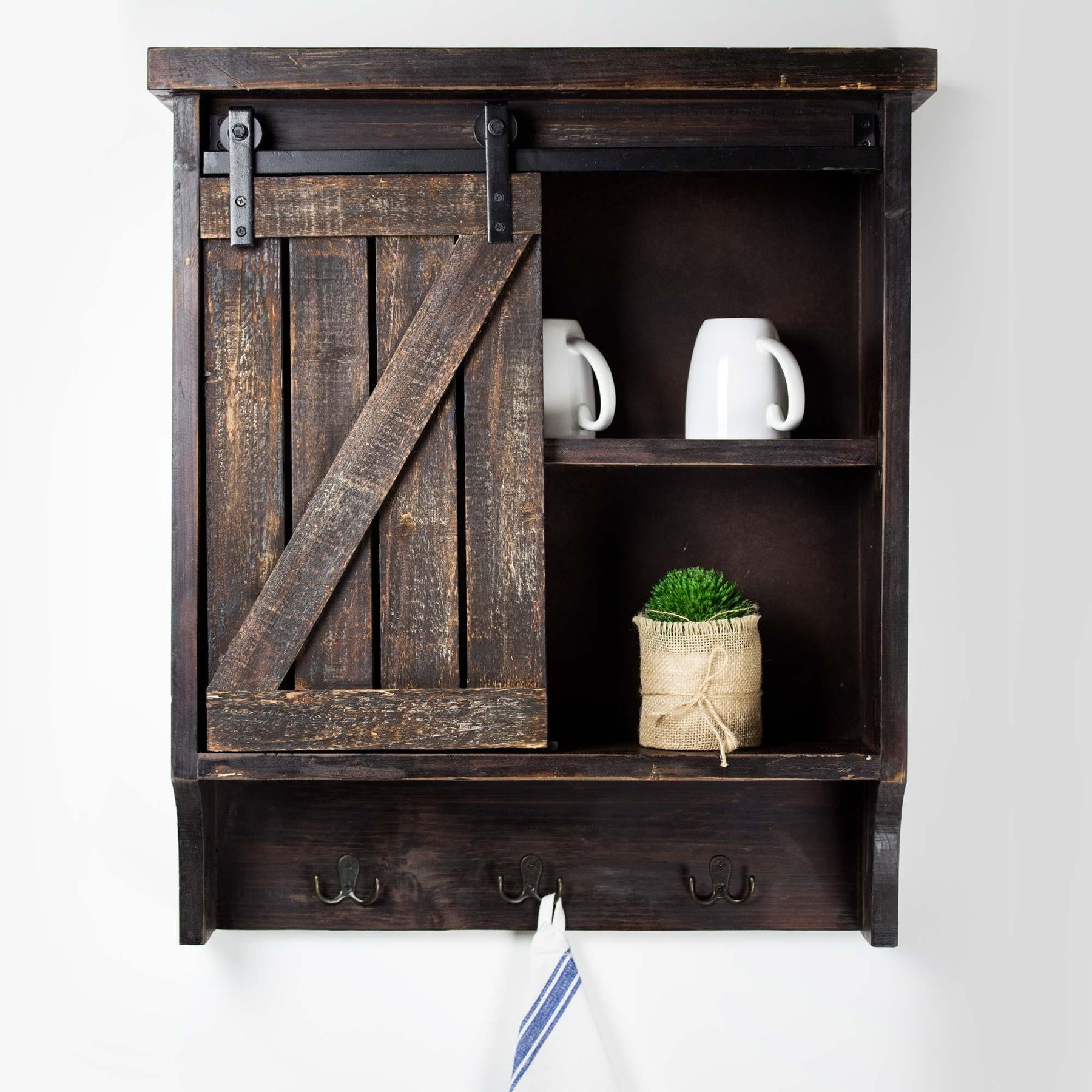 Wood and Metal Hanging Wall Storage Cabinet with Sliding Barn Door and Hooks