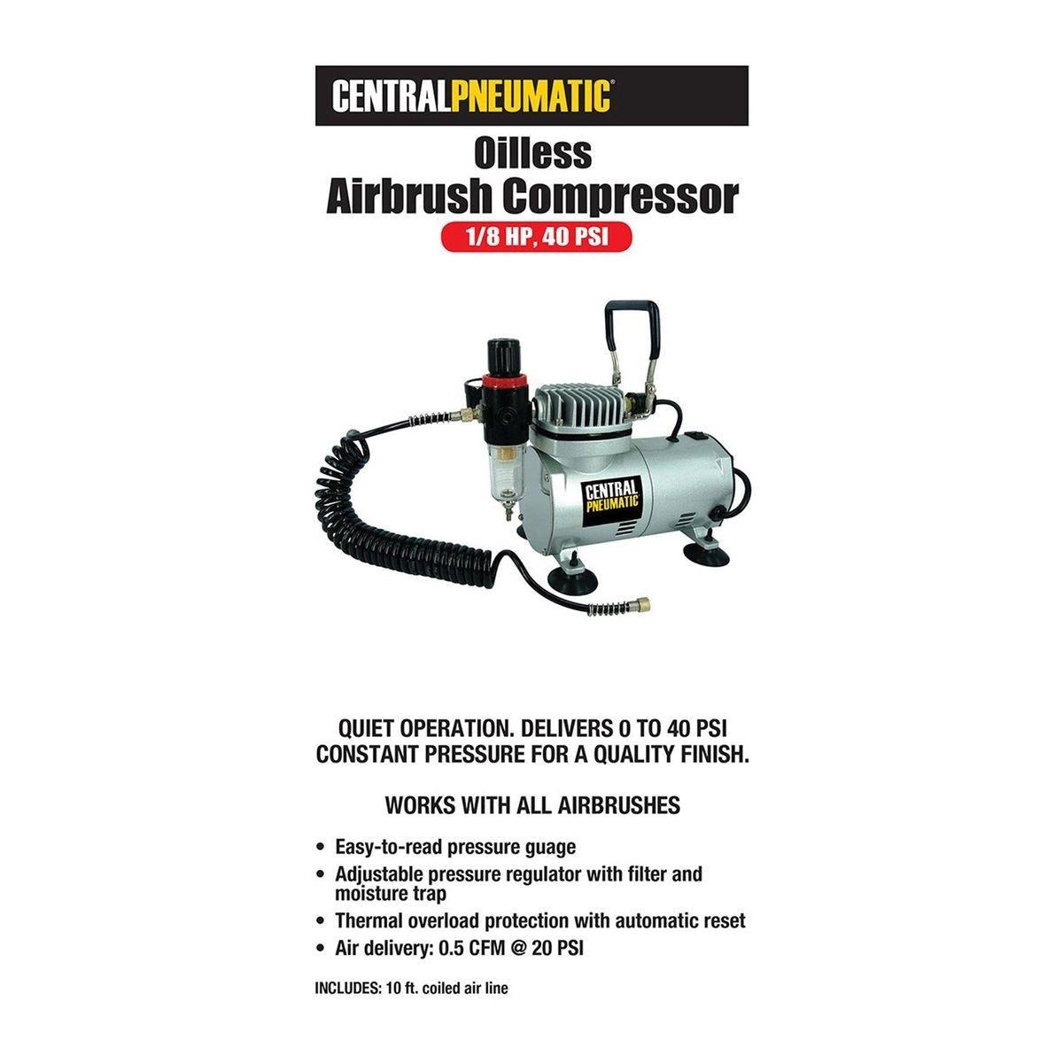 This oil-free airbrush compressor operates quietly at constant pressure for a quality finish. Features include an easy to read pressure gauge, thermal overload protection with automatic reset and rubber suction cup feet to dampen vibration. Built-in carrying handle for easy transportation.