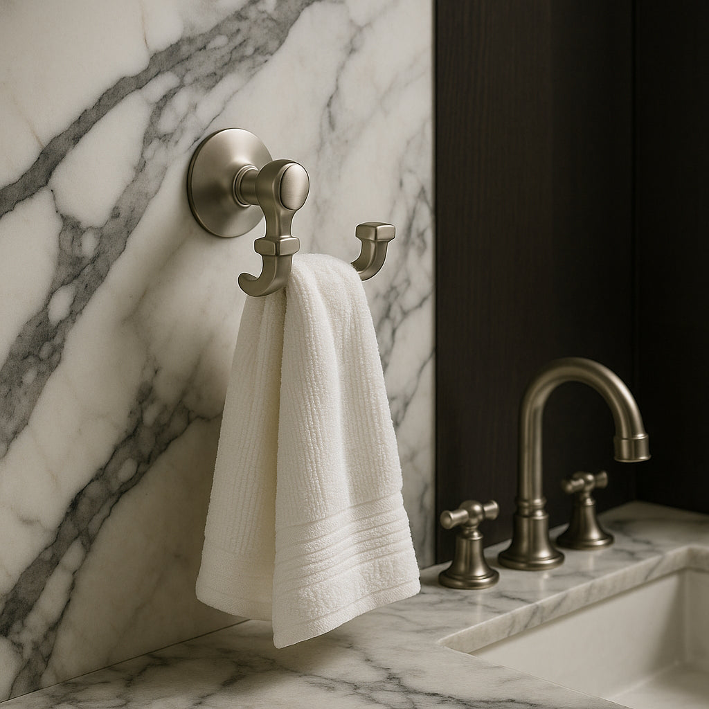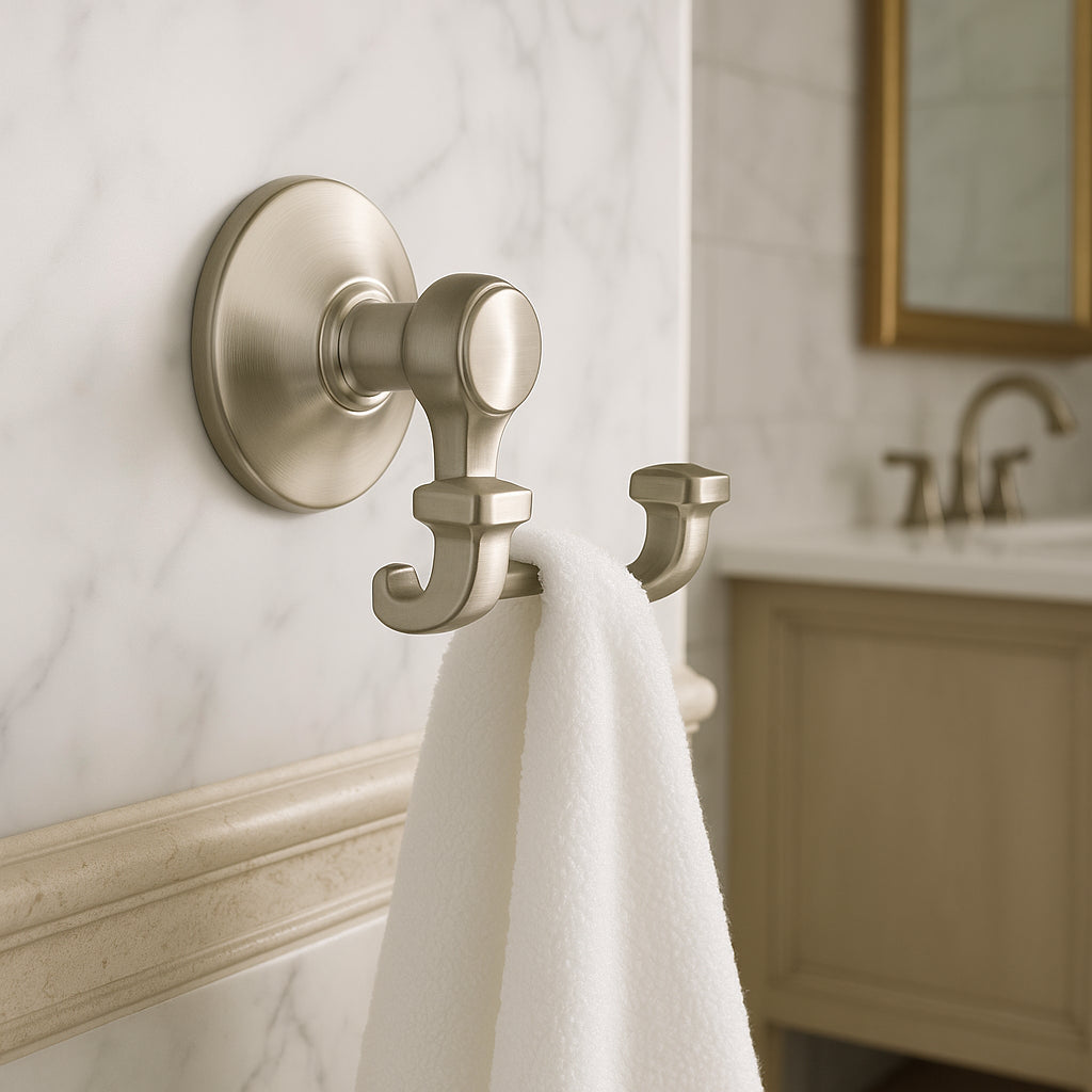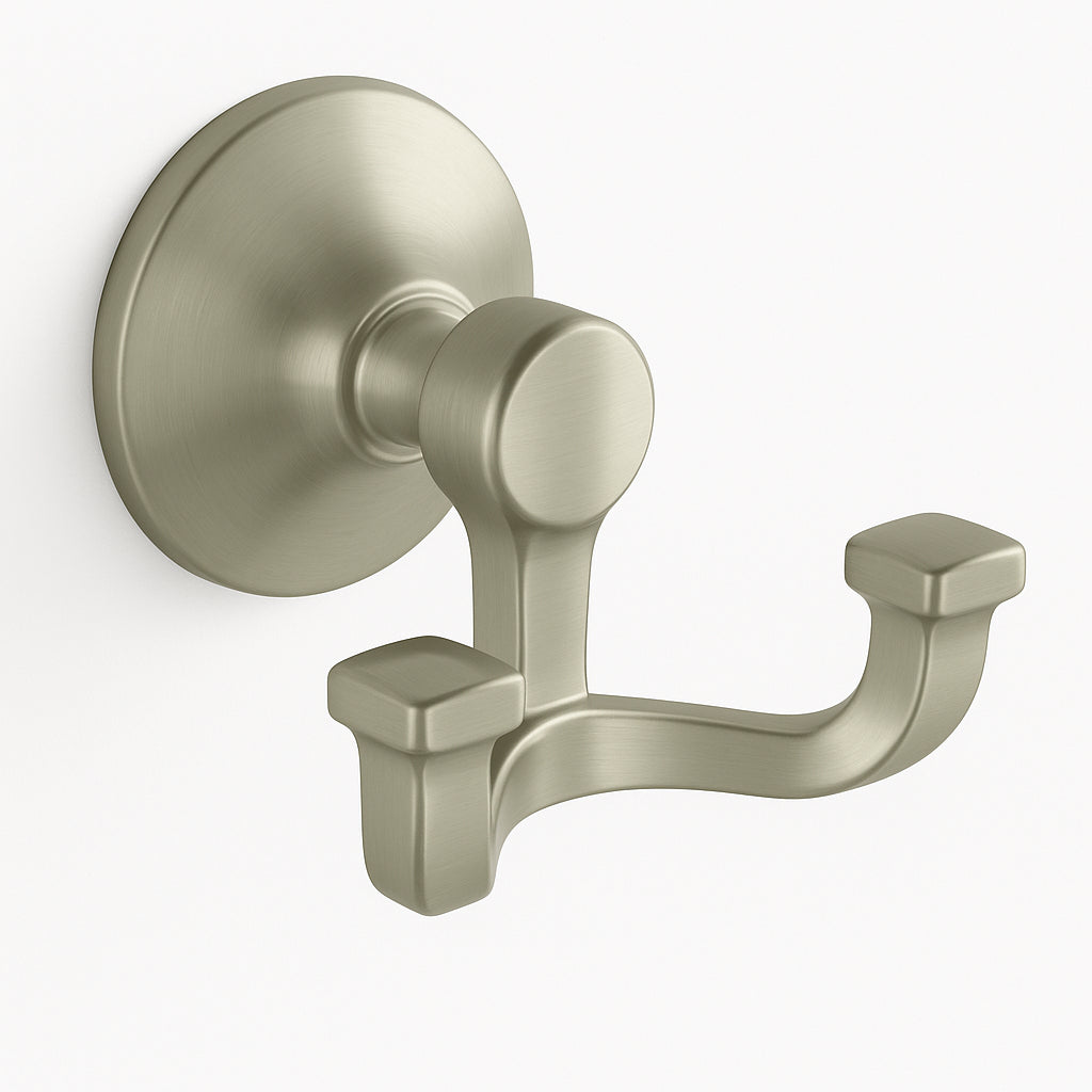 The KOHLER Bancroft Double-Hook Towel Hook combines timeless design with modern functionality. Made from premium brass with a brushed nickel finish, it offers durability and elegance for any bathroom.