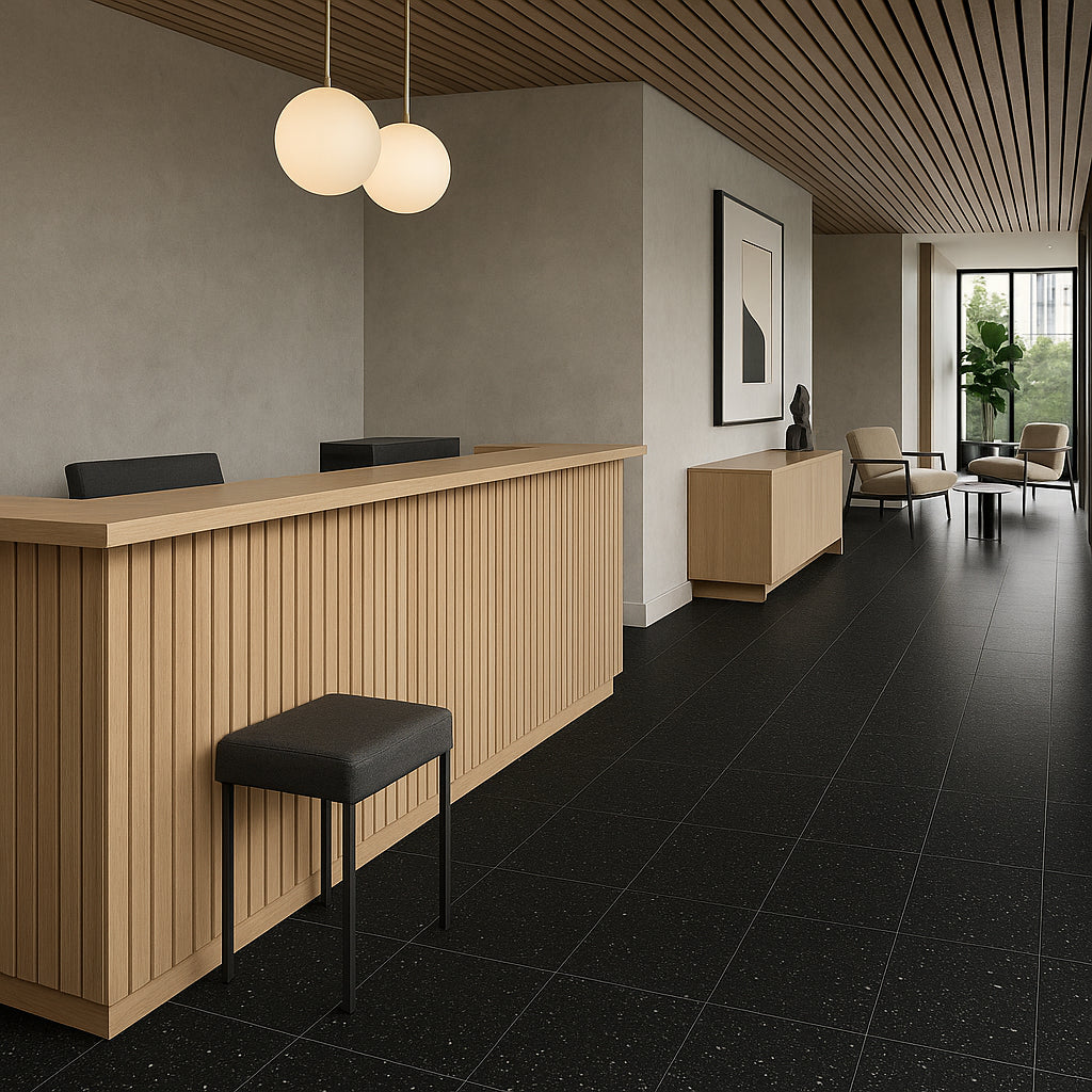 Armstrong Flooring's Safety Zone VCT tiles redefine commercial interiors with their sleek slate black speckled design. Perfect for high-traffic areas, these tiles combine durability with aesthetic appeal, ensuring a lasting impression. Pair them with minimalist decor for a modern look or use them to complement vibrant accents in retail spaces. Essential for creating a sophisticated and functional environment.