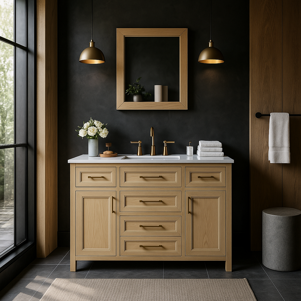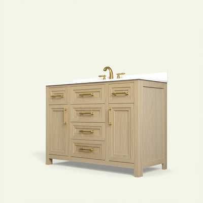 The Beaufort 48" Single Sink Vanity combines traditional charm with modern functionality. Featuring a light birch finish and a durable engineered stone top, it offers ample storage and dual hardware options for versatile styling.