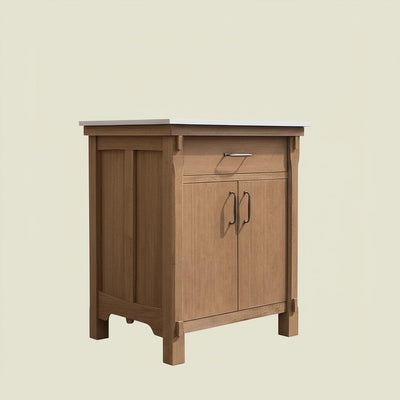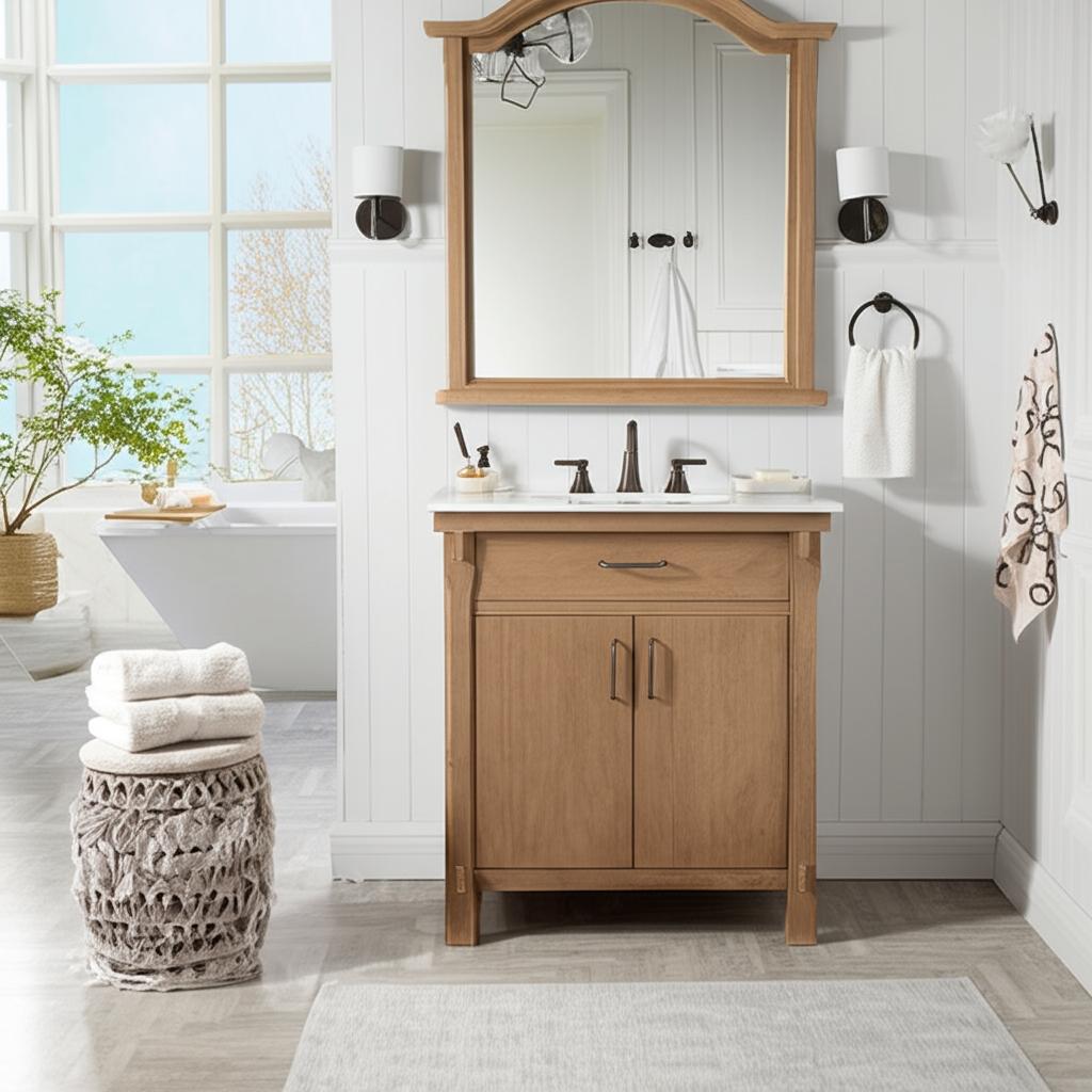 The Bellington 30-inch vanity combines farmhouse charm with modern functionality, featuring a durable engineered stone top, ample storage, and elegant antique black hardware. Perfect for enhancing any bathroom space.