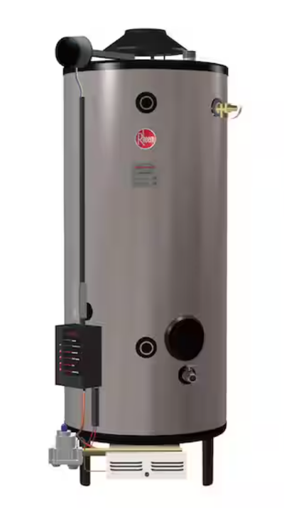 Regular price $10,999.66The Rheem Commercial Universal Gas Water Heaters are expertly crafted to seamlessly integrate into constrained retrofit spaces while delivering robust performance to handle rigorous usage demands. Its compact dimensions and versatile water connections streamline installation processes, especially in tight commercial settings. Notably, this model necessitates a 120-Volt power source for operation. Key features include a space-saving design with short heights and narrow jacket diameters, alongside multiple water inlet/outlet options for installation flexibility. The System Sentinel LED diagnostic system ensures operational integrity with sequential verification. Its robust tank design, fortified by a proprietary steel formulation and patented multi-flue architecture, coupled with stainless steel burners, promises durability and efficiency. Further enhancing convenience, the low-profile automatic flue damper reduces product height, while a factory-installed full-port brass drain valve facilitates swift maintenance. The direct spark to pilot ignition system optimizes energy consumption by igniting only when heat is required. Engineered for longevity, corrosion-resistant components and thorough insulation ensure enduring performance. Additionally, the gas control system allows precise temperature adjustment and accommodates various configurations, ranging from 35 to 100 gallons, with customizable BTU/h options in natural gas and liquid propane. However, compliance regulations restrict sales, shipments, or installations in specific regions based on emissions requirements, as detailed for residents of California, Utah, and Texas.